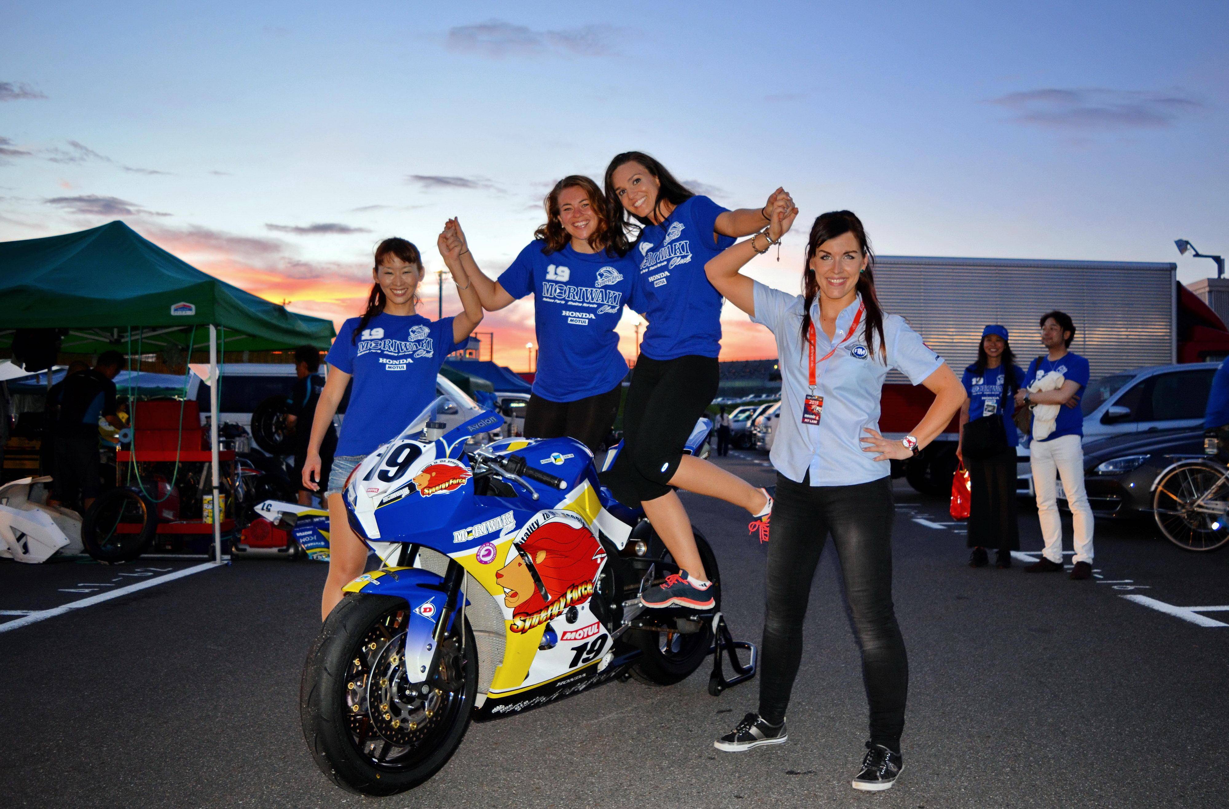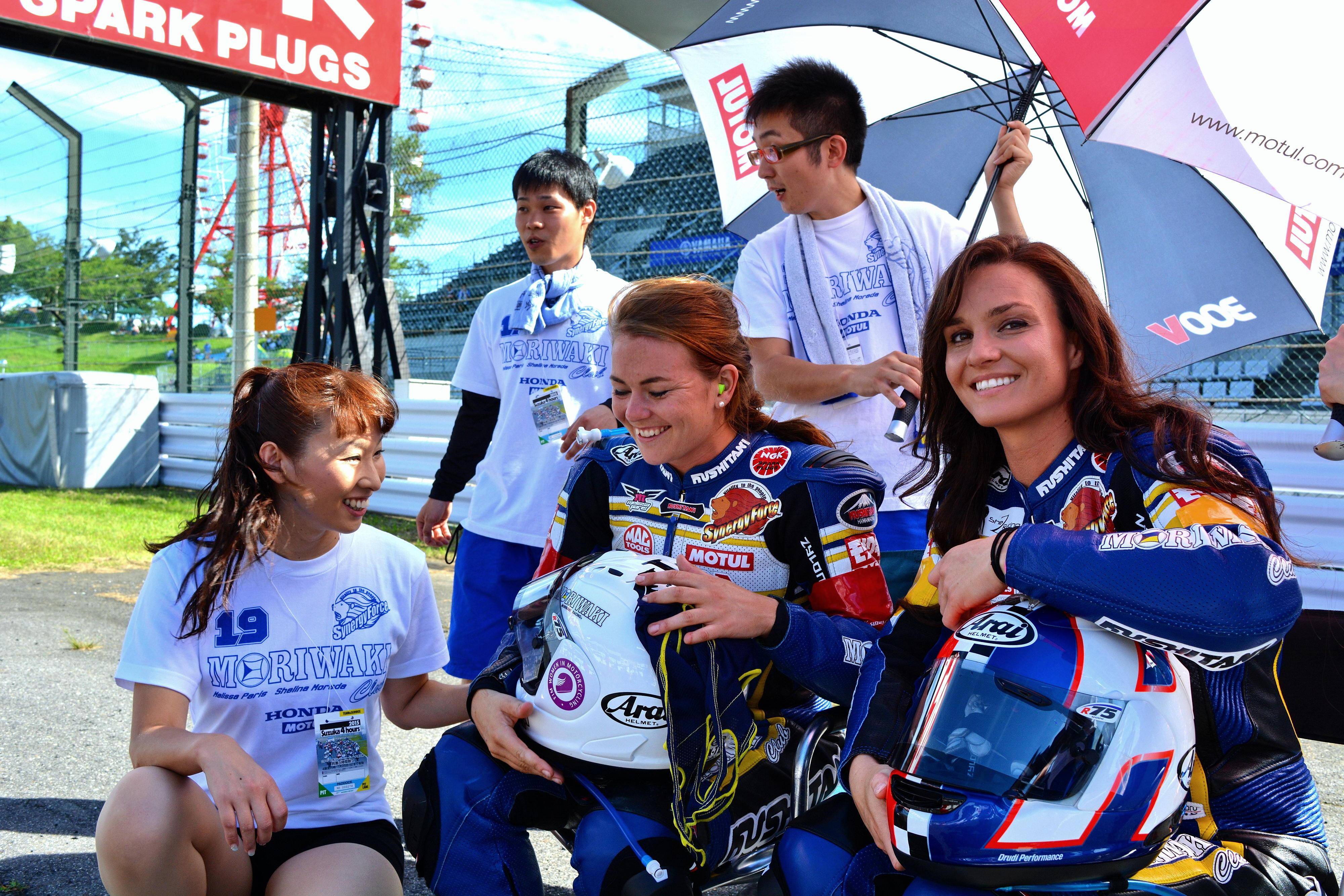 下面的圖片,2015 年日本鈴鹿八小時(shí)耐力賽的前哨戰(zhàn)、鈴鹿四小時(shí)耐力賽(ST600 和 ST600R 級(jí)別),帶著 FIM 推廣女子賽車的 “ 任務(wù) ”、由日本 Moriwaki 森脅支持的女子車隊(duì)協(xié)同力量森脅俱樂部(Synergy Force MORIWAKI Club),參與了這場(chǎng)四小時(shí)的角逐。而車隊(duì)的出場(chǎng)陣容,由新西蘭女車手比德爾(Avalon Biddle)和美國(guó)女車手莫雷達(dá)(Shelina Moreda)組成。