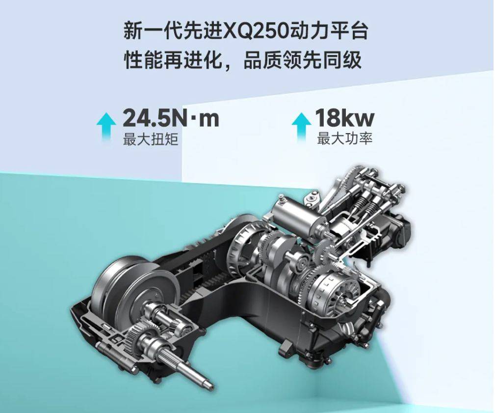 采用新一代XQ250動(dòng)力平臺(tái),最大扭矩提升至24.5N·m/6500rpm,最大功率提升至18kw/7500rpm,動(dòng)力逼近300CC踏板。