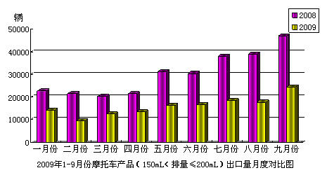 據(jù)海關(guān)提供出口統(tǒng)計數(shù)據(jù)顯示,由中國汽車工業(yè)協(xié)會編輯整理,現(xiàn)將2009年9月份摩托車產(chǎn)品(150mL<排量≤200mL)出口情況分析如下: