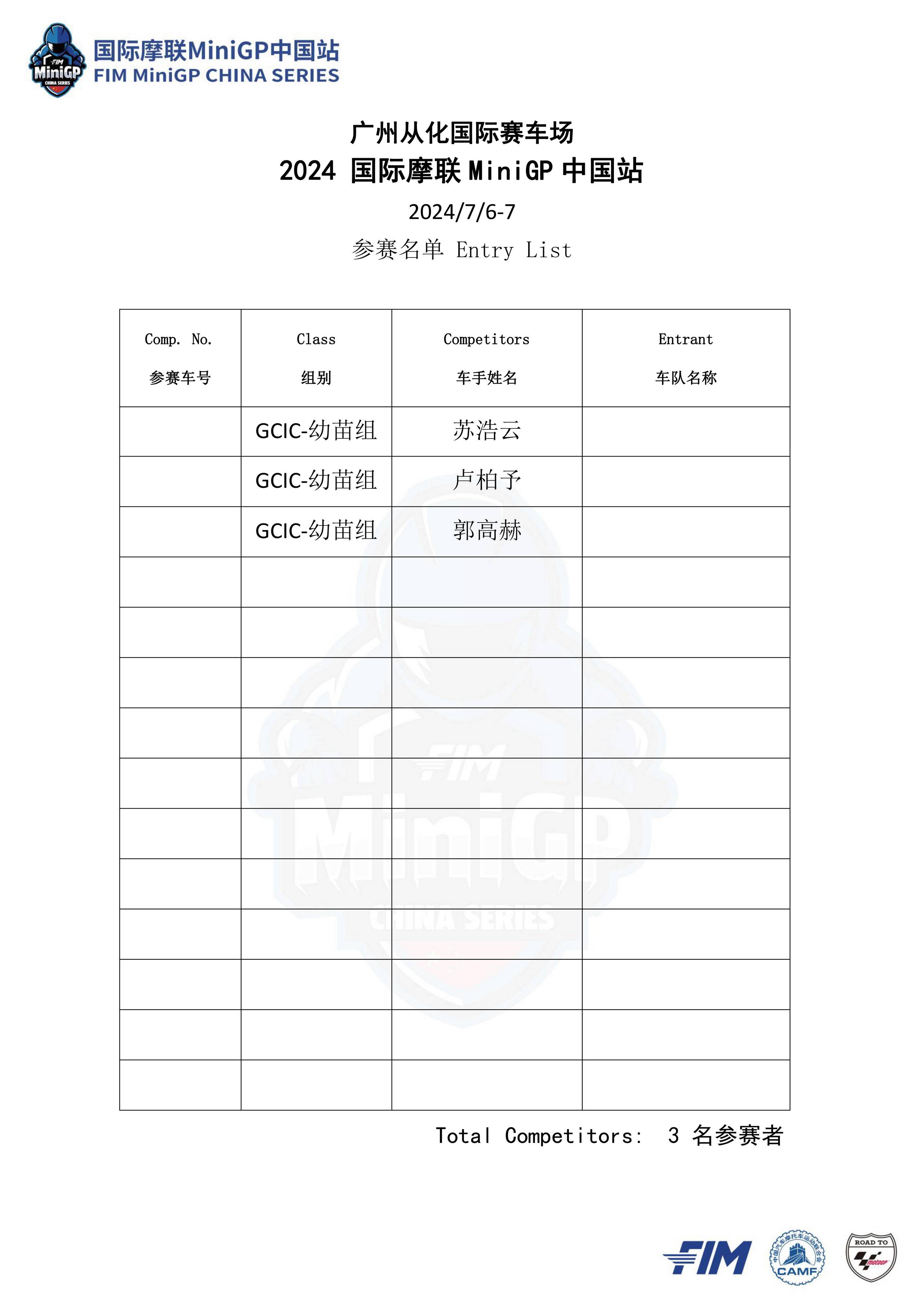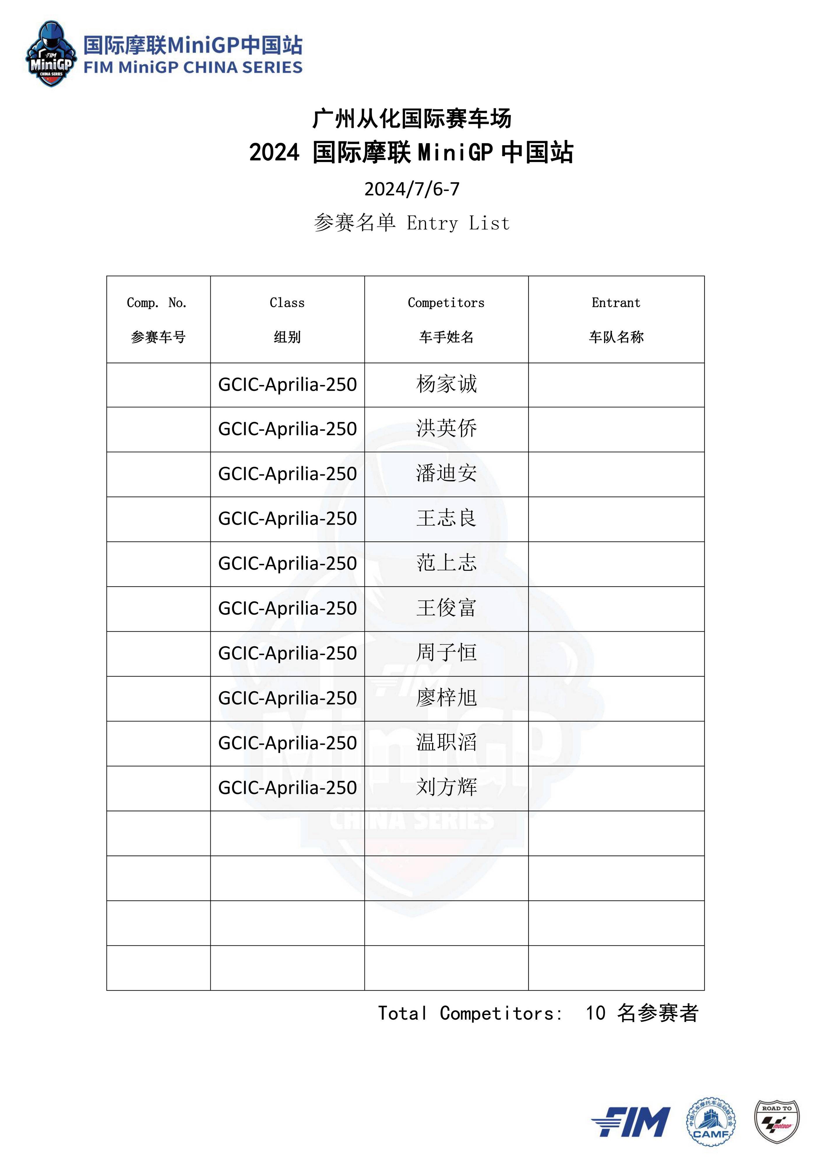 本站賽事將設(shè)立 Ohvale GP-0 110 Auto 組(自動檔)、FIM MiniGP GP-0 160 Evo 組、Ohvale GP-2 190 組,以及同場舉行的 GCIC 從化國際賽車場會賽、統(tǒng)一采用 Aprilia GPR250R 作為賽車的會賽,以及采用迷你越野車 KMB60、面向小童參賽者的幼苗組。