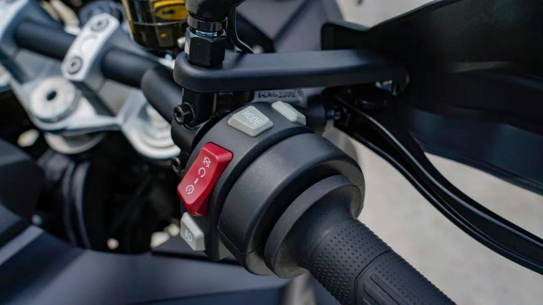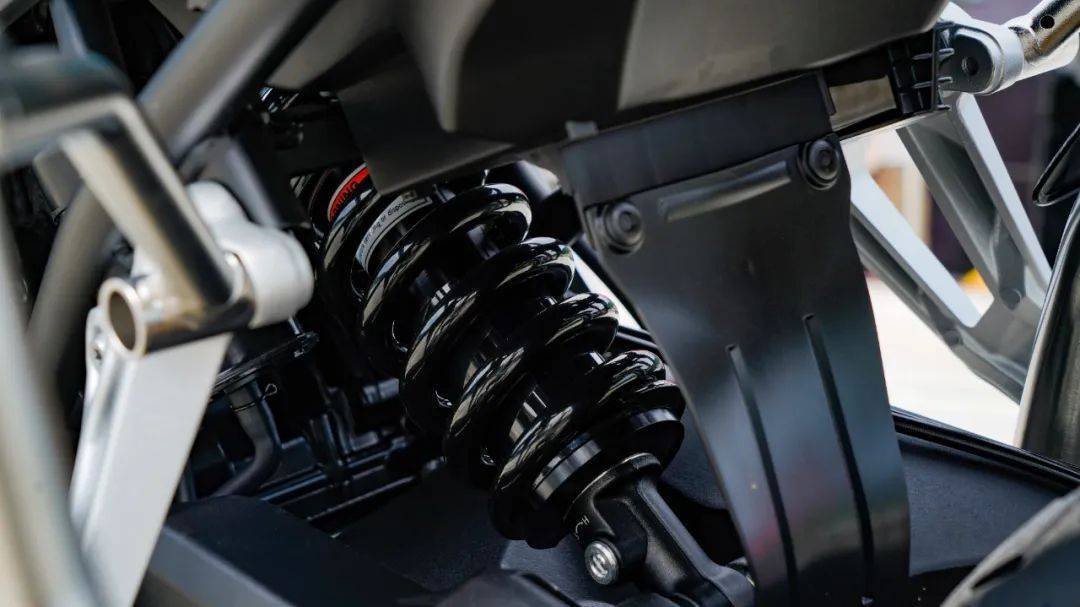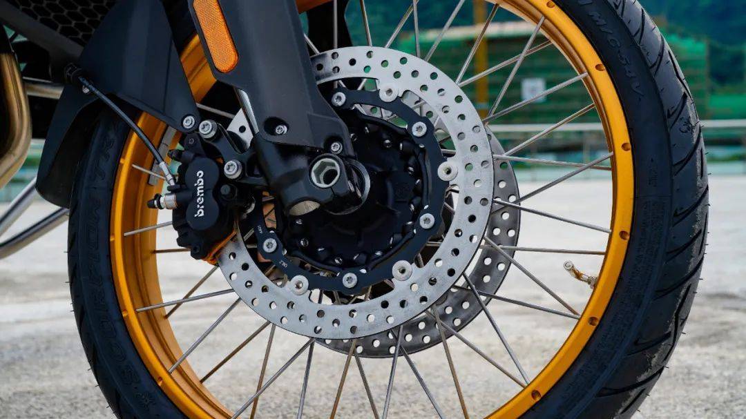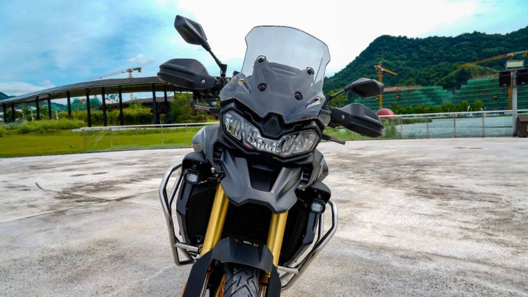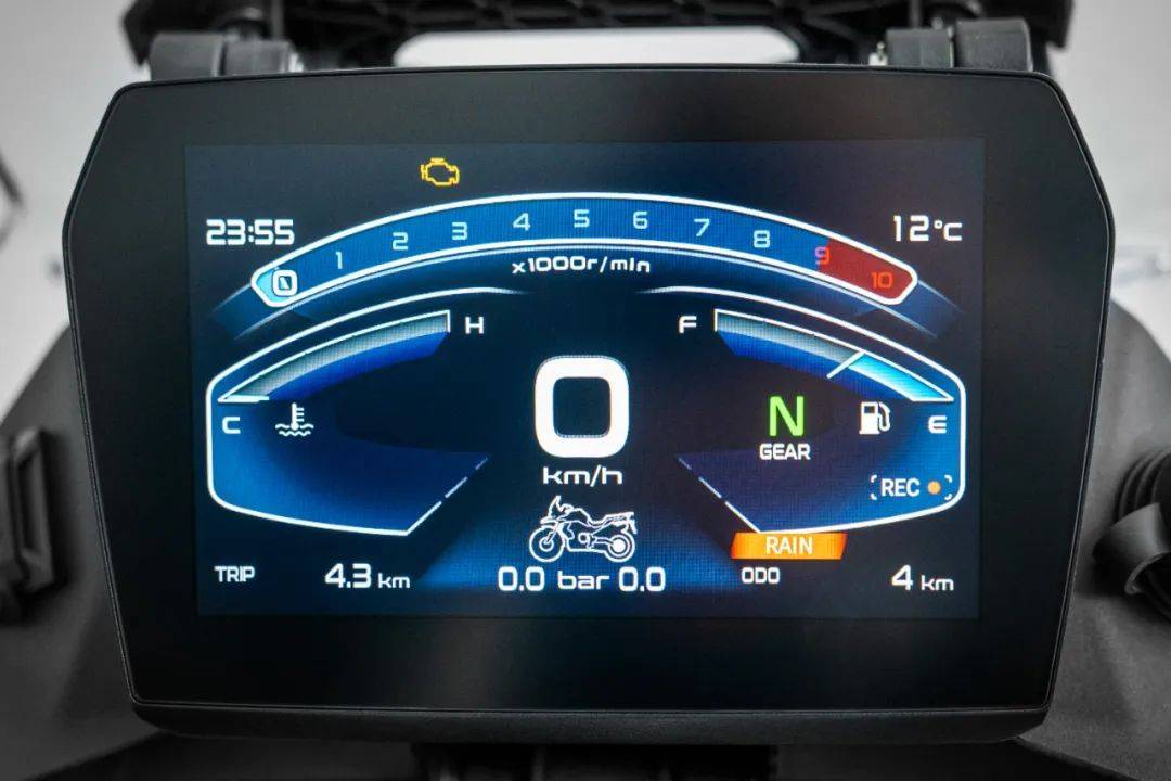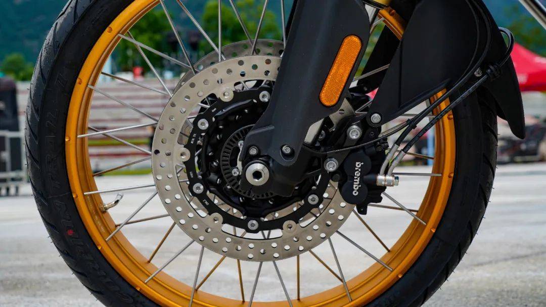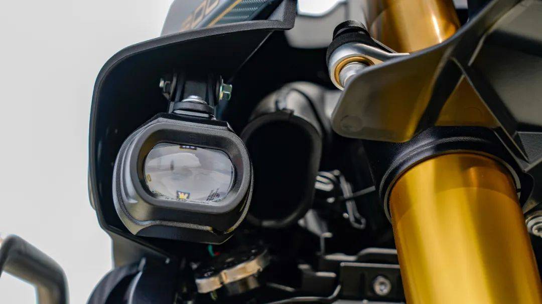 全LED光源, 標(biāo)配一對輔助射燈、鋁合金發(fā)動(dòng)機(jī)底部護(hù)板、保險(xiǎn)杠、后貨架、手把護(hù)弓、轉(zhuǎn)向阻尼器、鋁合金后平叉。全可調(diào)的KYB前倒置減震,以及全可調(diào)的內(nèi)置氣囊KYB中央后減震,后減震自帶預(yù)載調(diào)節(jié)旋鈕,可以直接手動(dòng)調(diào)節(jié)。前雙浮動(dòng)碟,每碟單向雙活塞Brembo卡鉗,后單活塞Brembo卡鉗,配備Brembo上泵。鋁合金真空輻條輪轂,配倍耐力蝎子胎,前90/90-21后150/70-17。在舒適性方面,專為國人定制的人機(jī)三角和加高靠后手把,優(yōu)化騎行姿態(tài),配備了電熱手把、加熱座墊、無鑰匙啟動(dòng)、行車記錄儀、手動(dòng)可調(diào)風(fēng)擋,全部配齊。