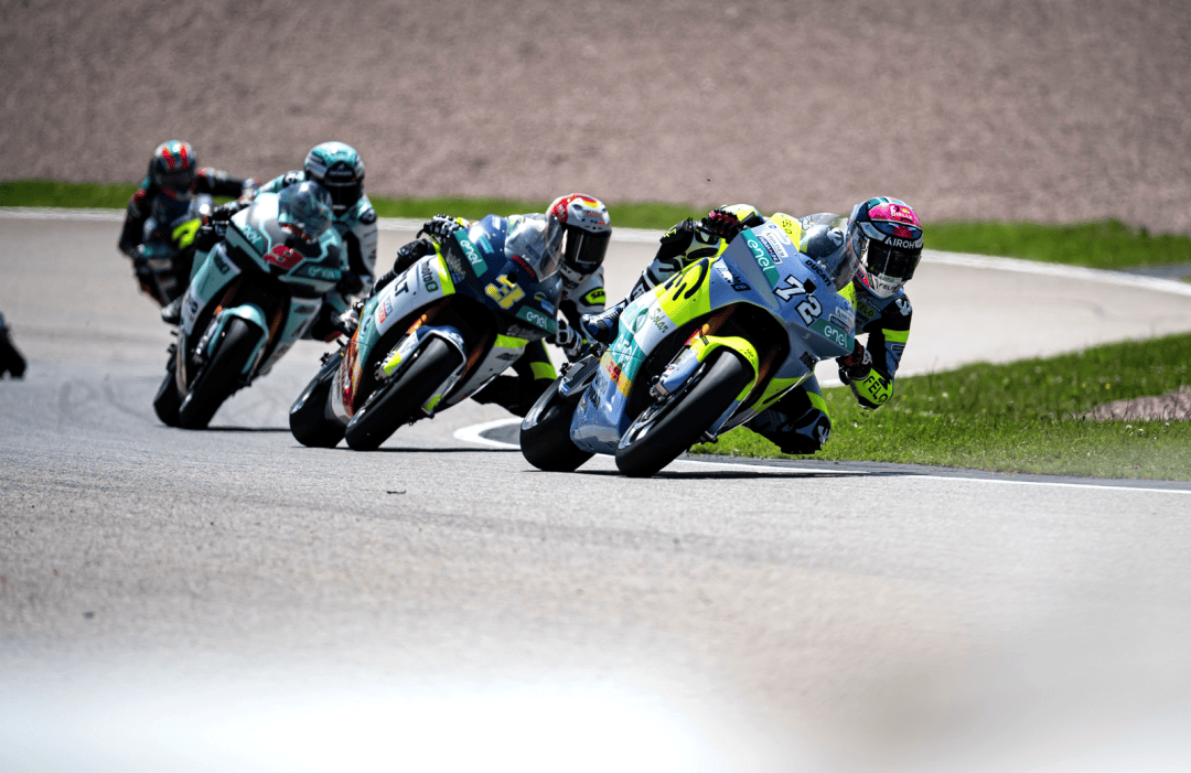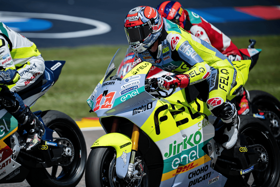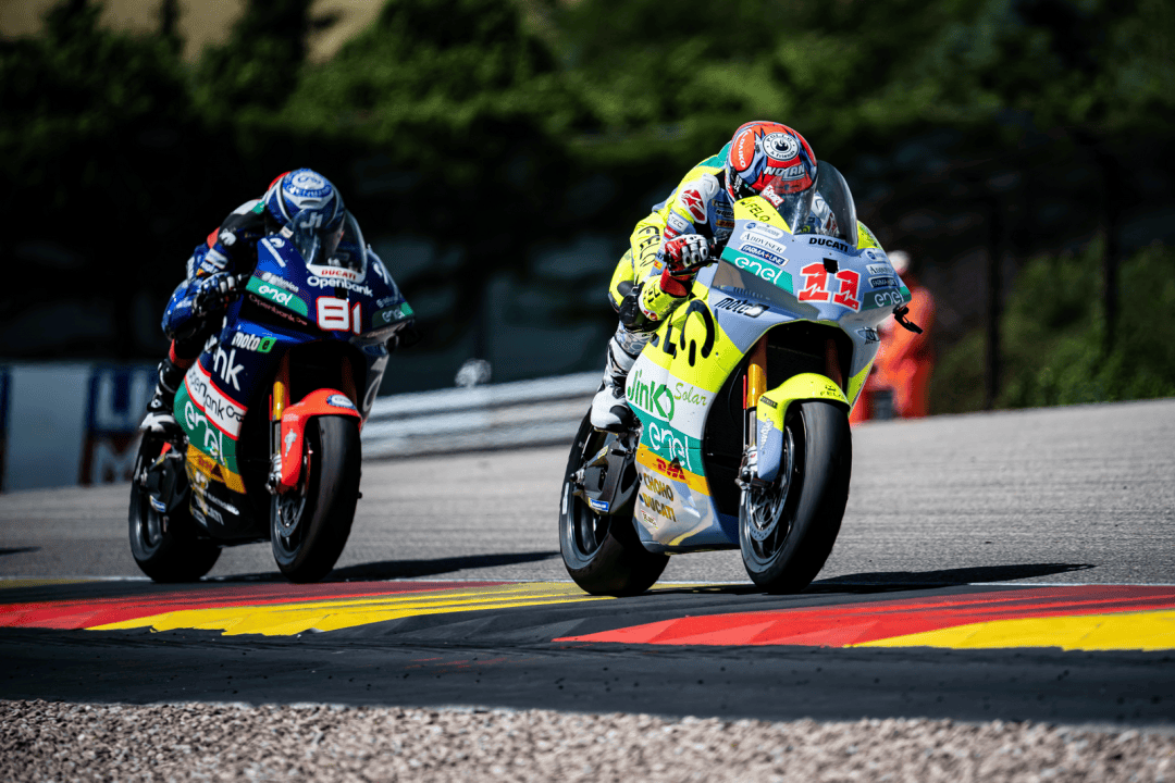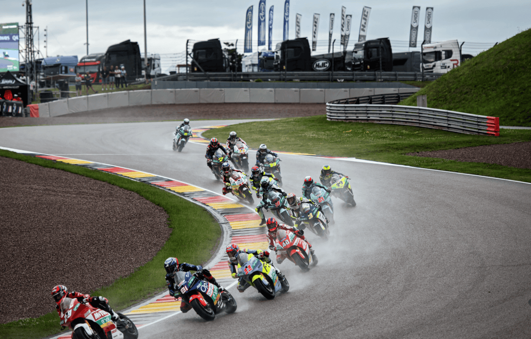 德國站的兩節(jié) MotoE 級別正式比賽在周末(七月 6 日)舉行,賽程為各8 圈、折合約 29 公里。第一節(jié)的比賽在干地之下展開,但首次發(fā)車后不久、就因為摔車意外而被紅旗所終止。重新起跑,賽程被縮短為只有 5 圈。這場短促的、只有七分鐘多一點的較量中,法拉利以迅猛的態(tài)勢全力向前,超越了多位車手之后、以第四名完賽,這是他在 2024 賽季開賽以來的最佳成績,與頒獎臺的距離只有 1 秒多。費內(nèi)洛也拿到了比賽的第十名。