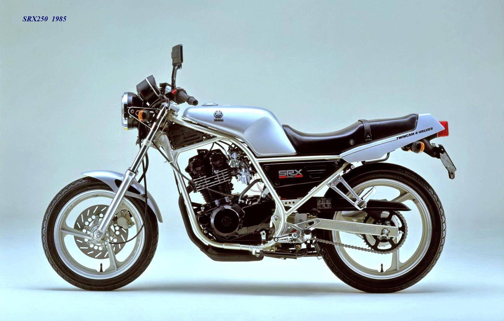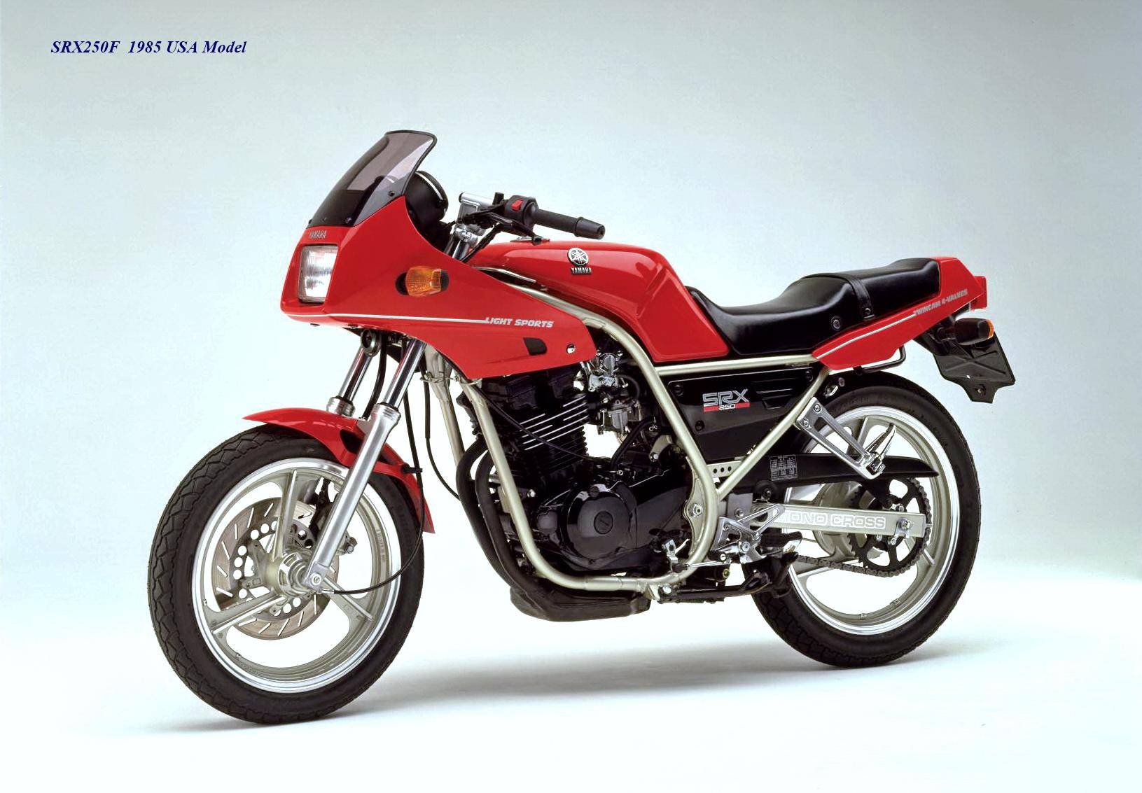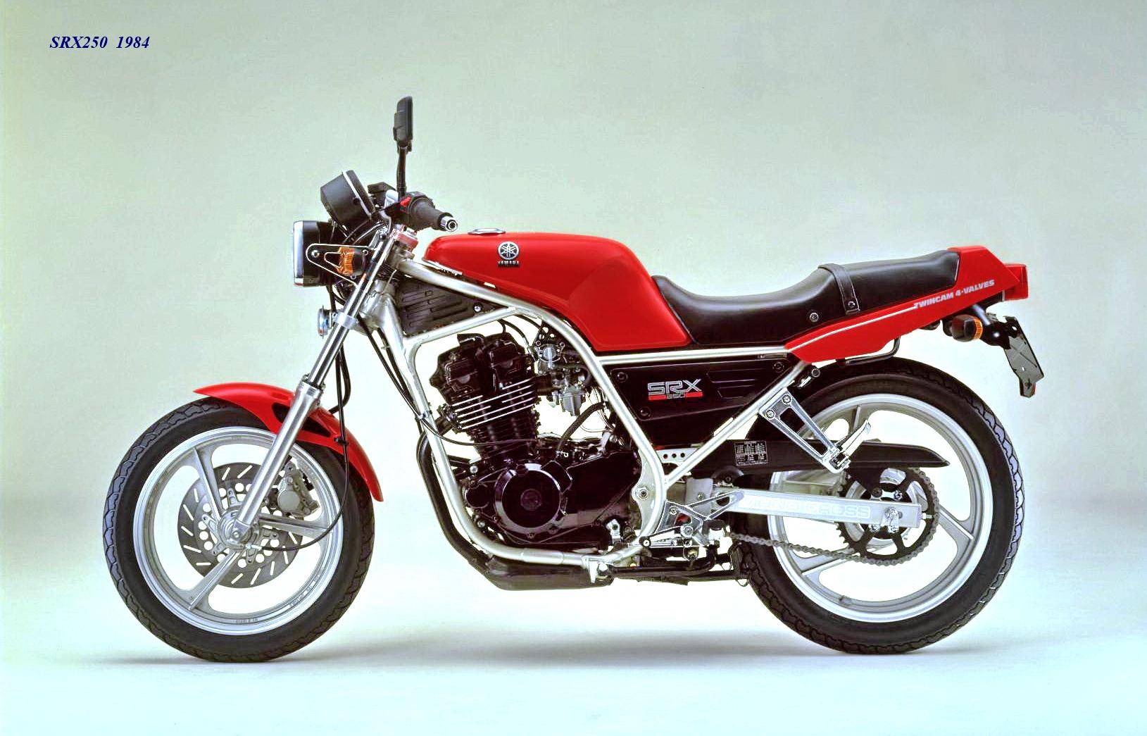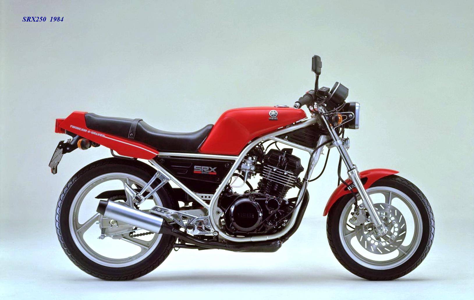 作為應(yīng)對市場競爭的手段,Yamaha 在 1984 年首次推出了 SRX250(本土版的工廠編號為 5 IY/Y24PV)。該車搭載一副從越野車 XT250 的動力單元升級而來的風(fēng)冷四沖程單氣缸、DOHC 四氣閥的發(fā)動機(jī)(當(dāng)時的 XT250 采用 SOHC 兩氣閥的發(fā)動機(jī)),缸徑、行程為 73 mm x 59.6 mm,排氣量 249 cc,配備了 Yamaha 獨(dú)創(chuàng)的 Y.D.I.S(Yamaha Digital Intake System,Yamaha 數(shù)字式進(jìn)氣系統(tǒng),也就是每個進(jìn)氣的氣閥、都配備了對應(yīng)的進(jìn)氣通道和化油器,單氣缸、雙化油器)技術(shù),讓車輛在低轉(zhuǎn)速之下、依然有著極佳的油門響應(yīng);標(biāo)配了電啟動,六檔的變速齒輪箱,最大馬力輸出 32 匹。