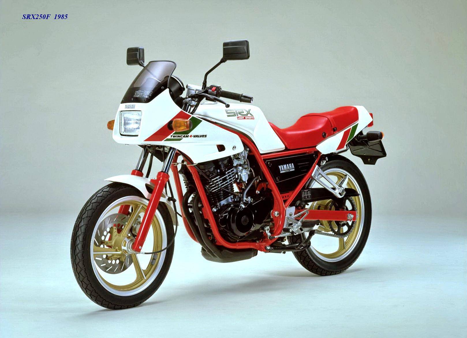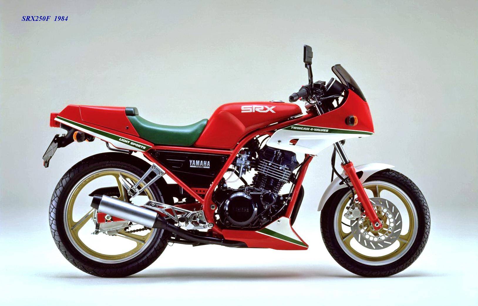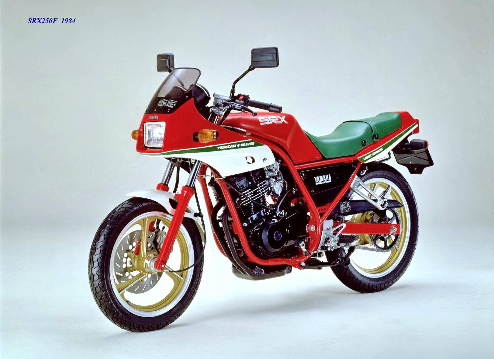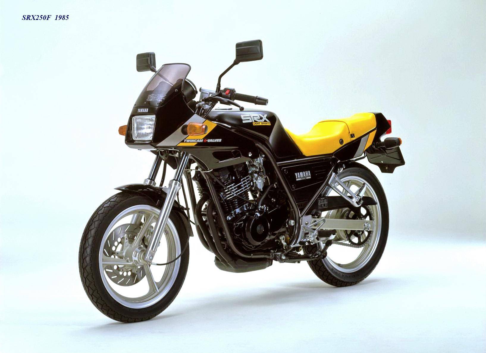作為應(yīng)對市場競爭的手段,Yamaha 在 1984 年首次推出了 SRX250(本土版的工廠編號為 5 IY/Y24PV)。該車搭載一副從越野車 XT250 的動力單元升級而來的風(fēng)冷四沖程單氣缸、DOHC 四氣閥的發(fā)動機(jī)(當(dāng)時的 XT250 采用 SOHC 兩氣閥的發(fā)動機(jī)),缸徑、行程為 73 mm x 59.6 mm,排氣量 249 cc,配備了 Yamaha 獨(dú)創(chuàng)的 Y.D.I.S(Yamaha Digital Intake System,Yamaha 數(shù)字式進(jìn)氣系統(tǒng),也就是每個進(jìn)氣的氣閥、都配備了對應(yīng)的進(jìn)氣通道和化油器,單氣缸、雙化油器)技術(shù),讓車輛在低轉(zhuǎn)速之下、依然有著極佳的油門響應(yīng);標(biāo)配了電啟動,六檔的變速齒輪箱,最大馬力輸出 32 匹。