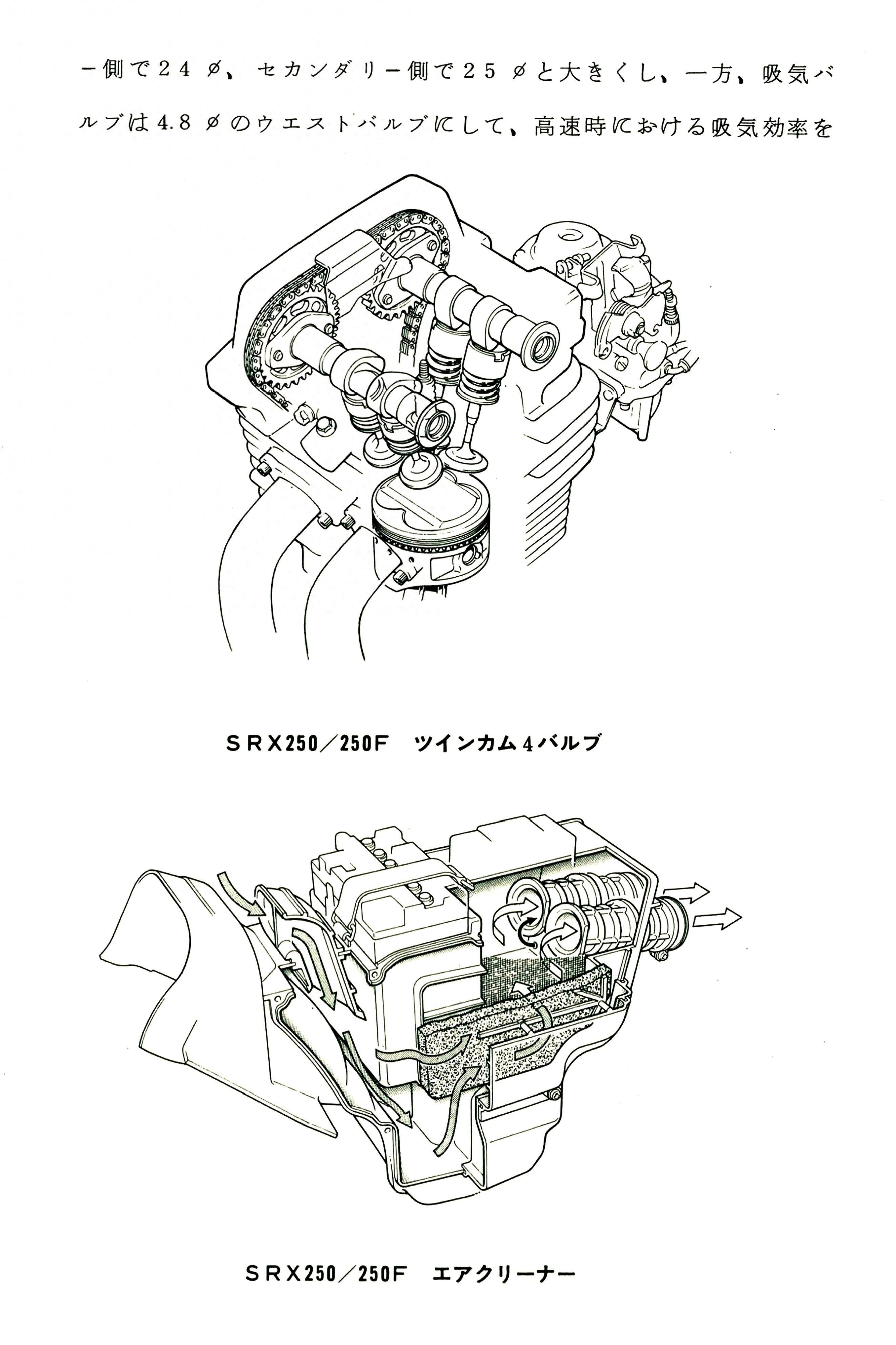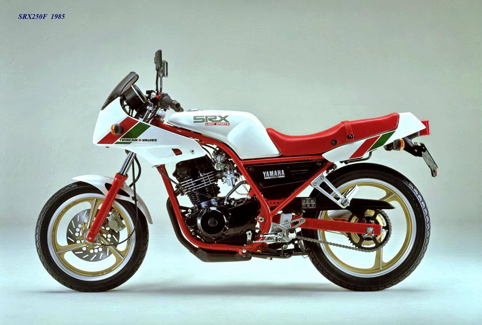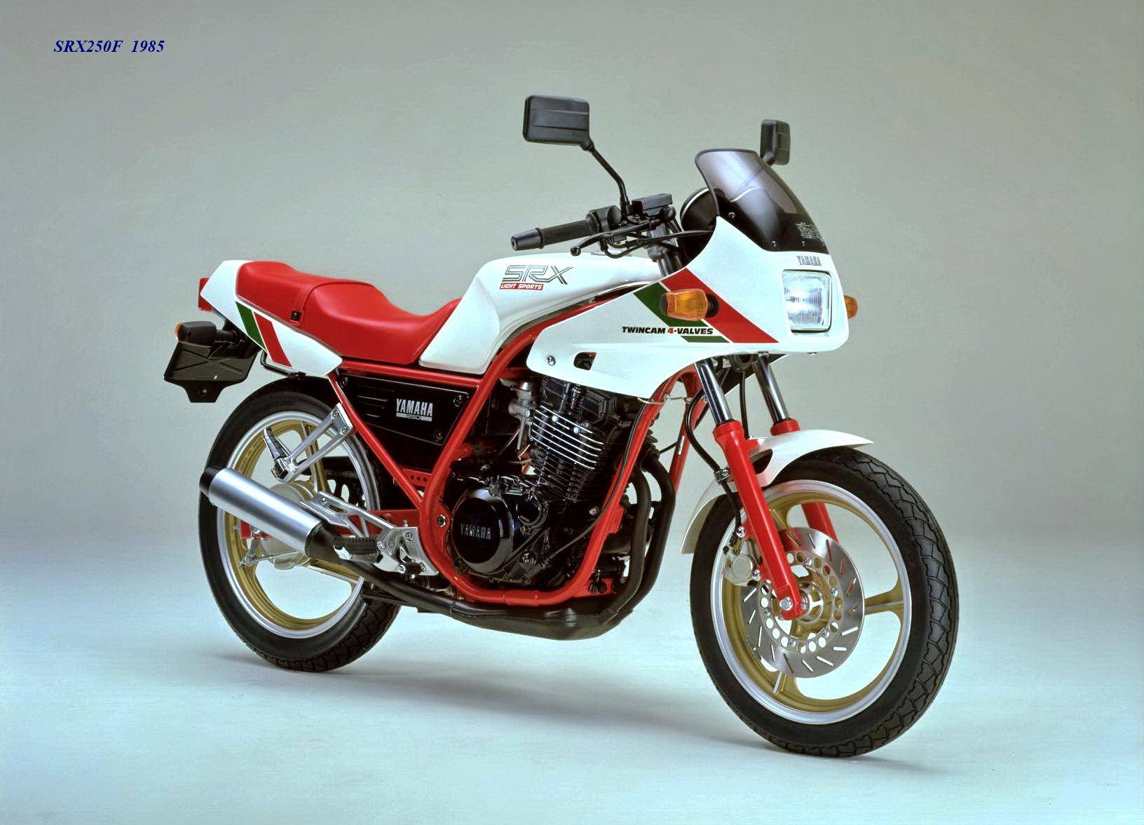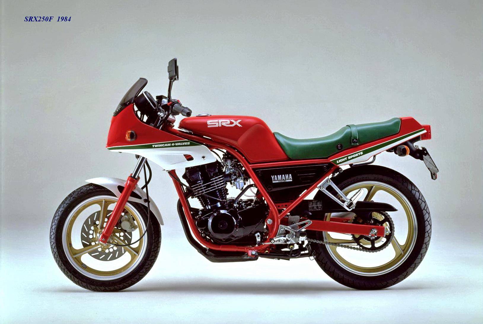 作為應(yīng)對市場競爭的手段,Yamaha 在 1984 年首次推出了 SRX250(本土版的工廠編號為 5 IY/Y24PV)。該車搭載一副從越野車 XT250 的動力單元升級而來的風(fēng)冷四沖程單氣缸、DOHC 四氣閥的發(fā)動機(jī)(當(dāng)時的 XT250 采用 SOHC 兩氣閥的發(fā)動機(jī)),缸徑、行程為 73 mm x 59.6 mm,排氣量 249 cc,配備了 Yamaha 獨(dú)創(chuàng)的 Y.D.I.S(Yamaha Digital Intake System,Yamaha 數(shù)字式進(jìn)氣系統(tǒng),也就是每個進(jìn)氣的氣閥、都配備了對應(yīng)的進(jìn)氣通道和化油器,單氣缸、雙化油器)技術(shù),讓車輛在低轉(zhuǎn)速之下、依然有著極佳的油門響應(yīng);標(biāo)配了電啟動,六檔的變速齒輪箱,最大馬力輸出 32 匹。