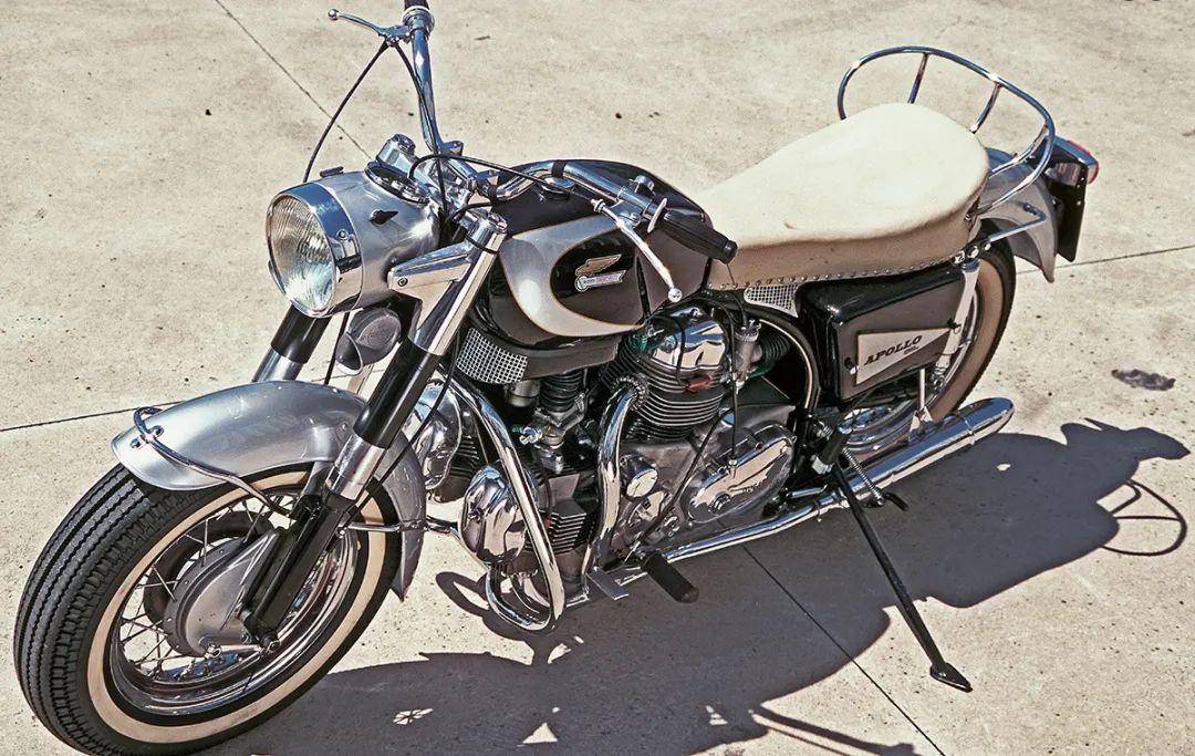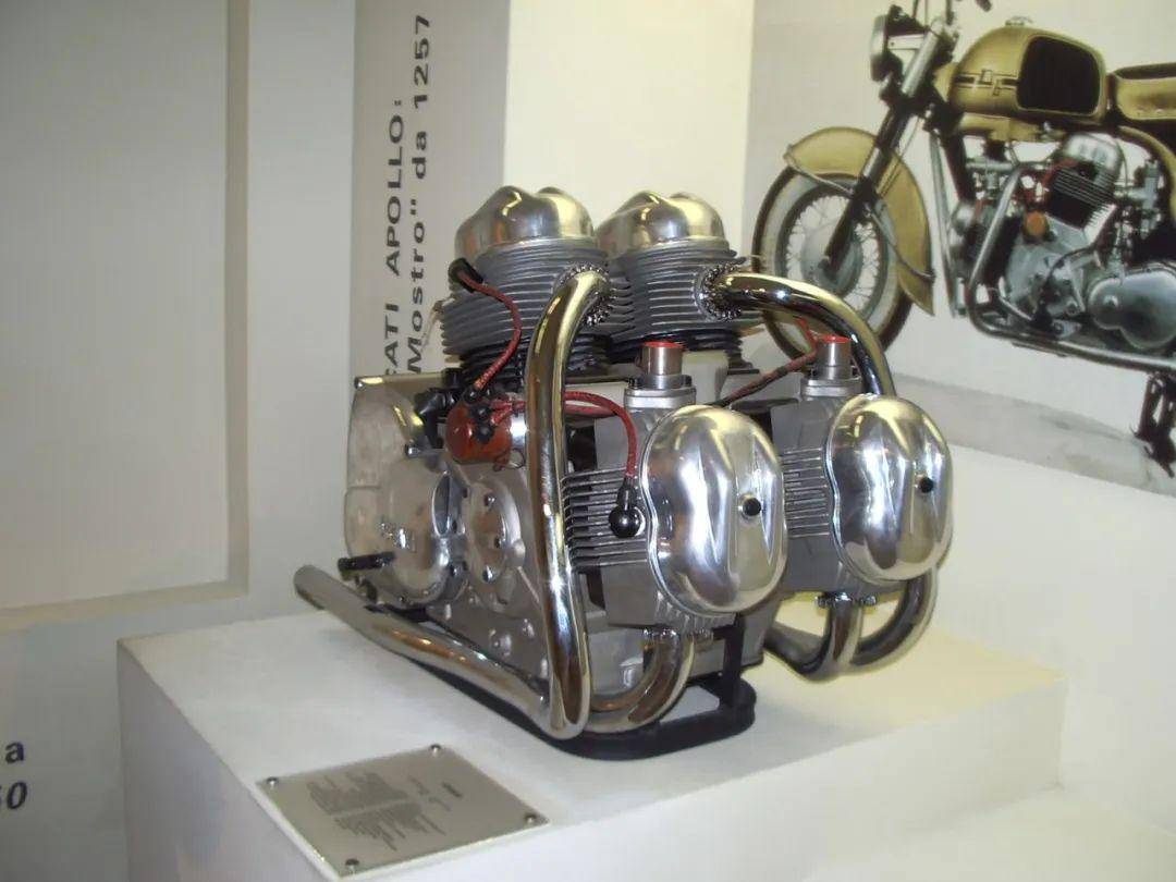 “阿波羅”搭載了空氣冷卻的V型四缸發(fā)動(dòng)機(jī),造型很有個(gè)性,幾乎就是一個(gè)傾斜的正方形。為有效抑制震動(dòng)、增強(qiáng)騎乘舒適度,V型四缸設(shè)計(jì)成90°夾角,采用了180°點(diǎn)火間隔,4只活塞成雙地上下運(yùn)動(dòng)。為了滿足美國(guó)警方要求,這臺(tái)V4發(fā)動(dòng)機(jī)采用了84.5mm× 56mm的缸徑和沖程,缸徑?jīng)_程比達(dá)到1.51,這是此前泰戈里奧尼從來(lái)沒(méi)用過(guò)的設(shè)計(jì);相應(yīng)地,獲得了1256mL的汽缸排量,而當(dāng)時(shí)最大哈雷摩托車Duo Glide汽缸排量也只有1215mL。由于發(fā)動(dòng)機(jī)采用了鋁合金材料,幫助控制整車重量,271kg的車重比同級(jí)別的哈雷摩托車足足少了20kg。