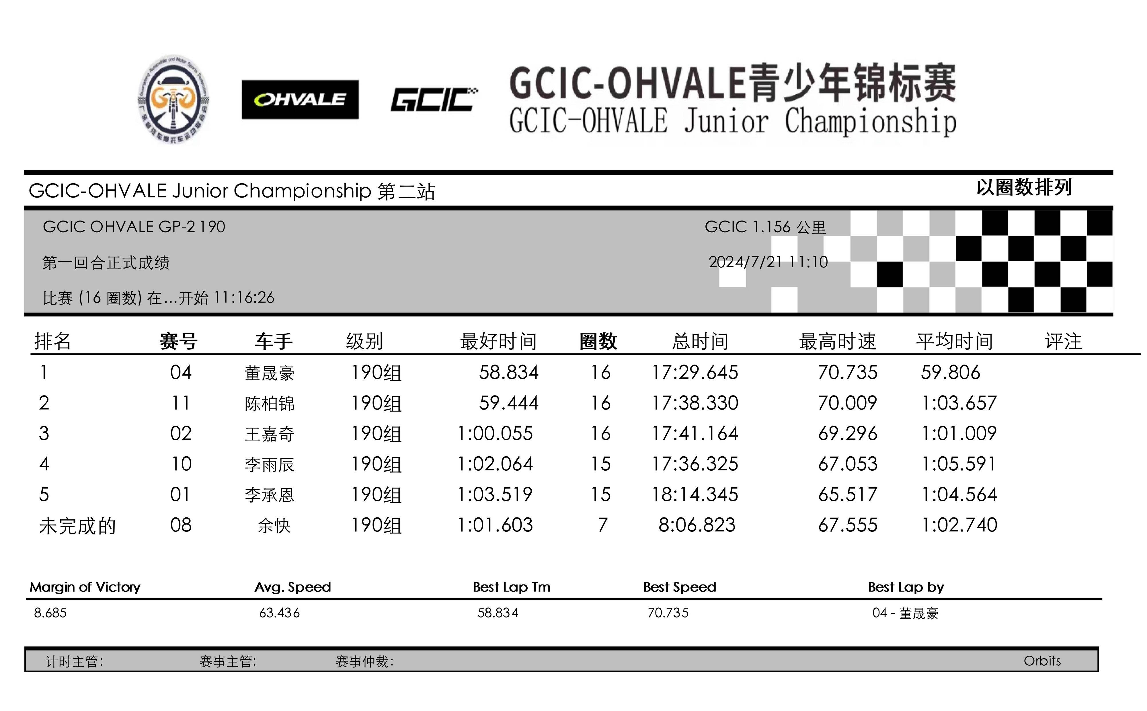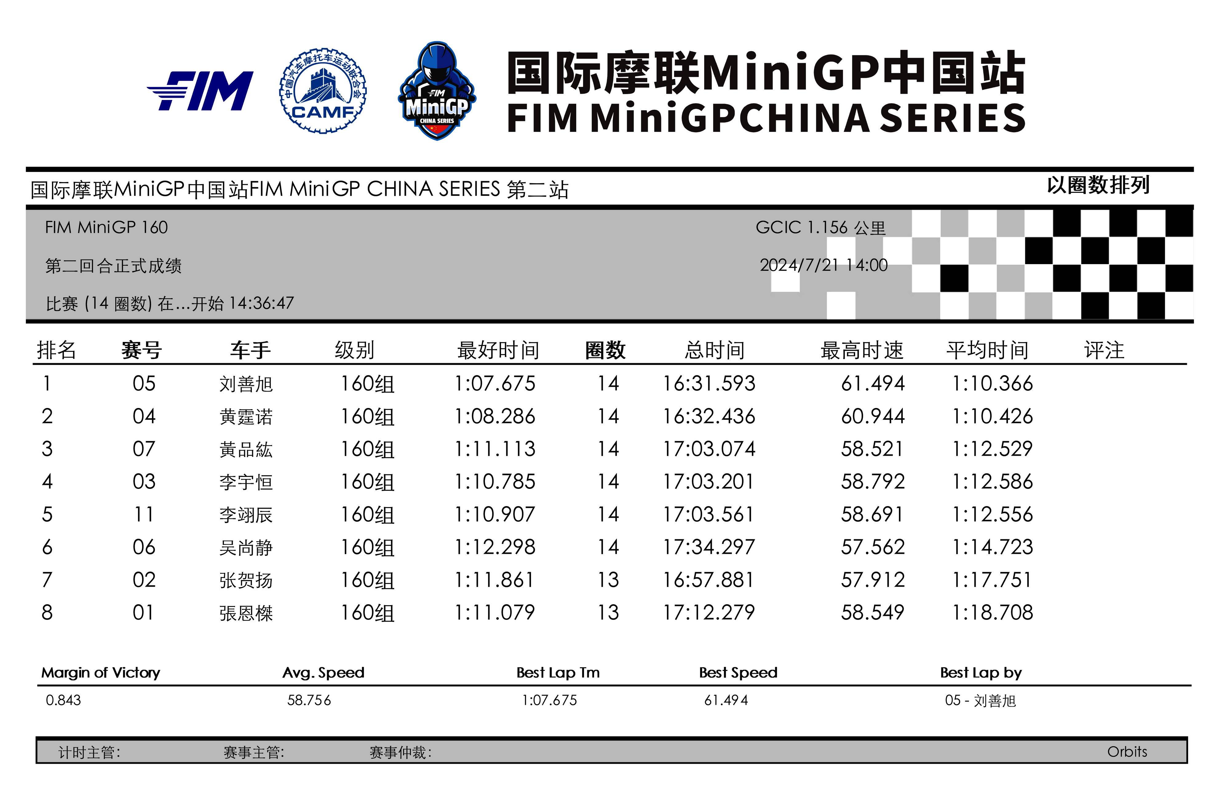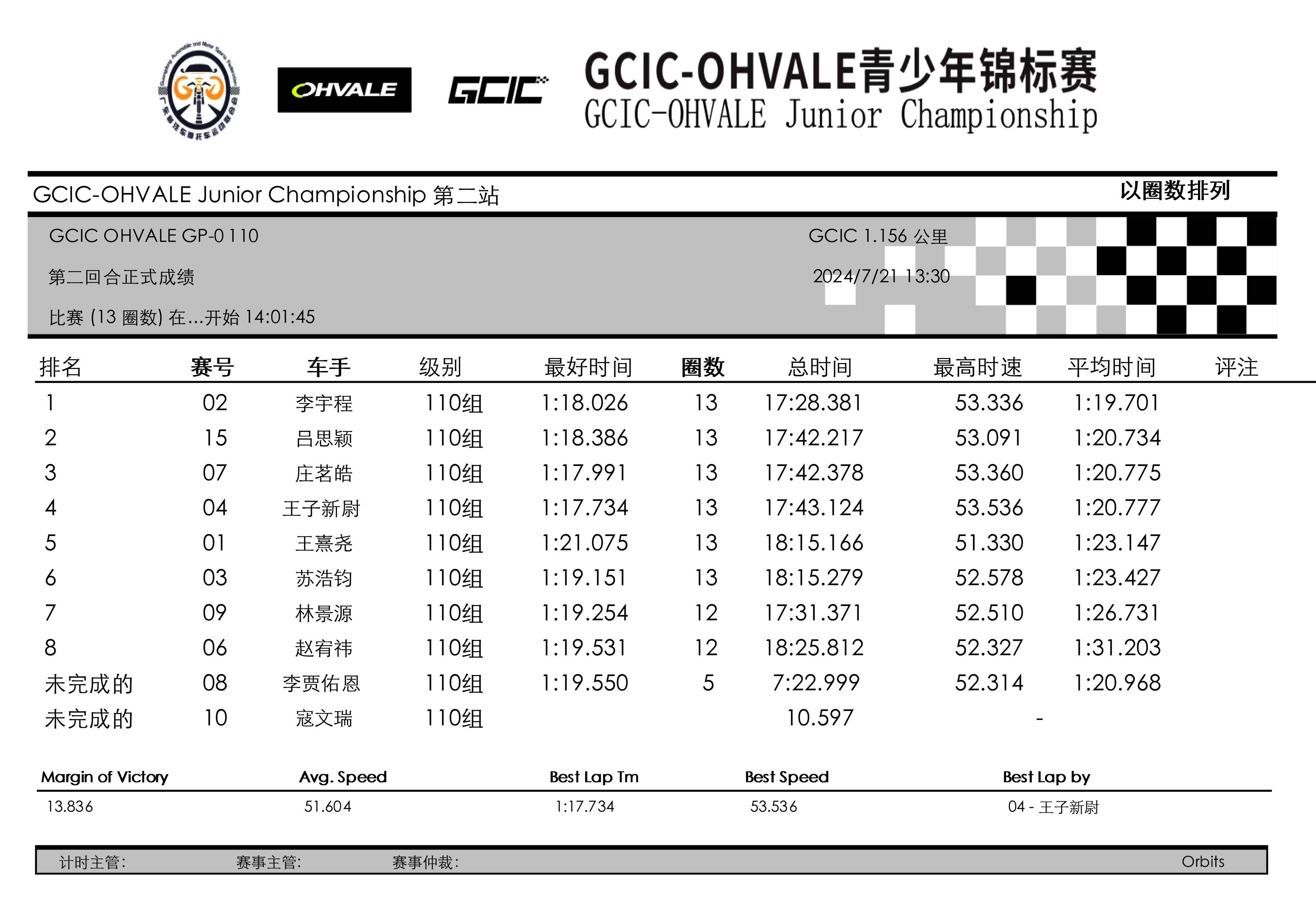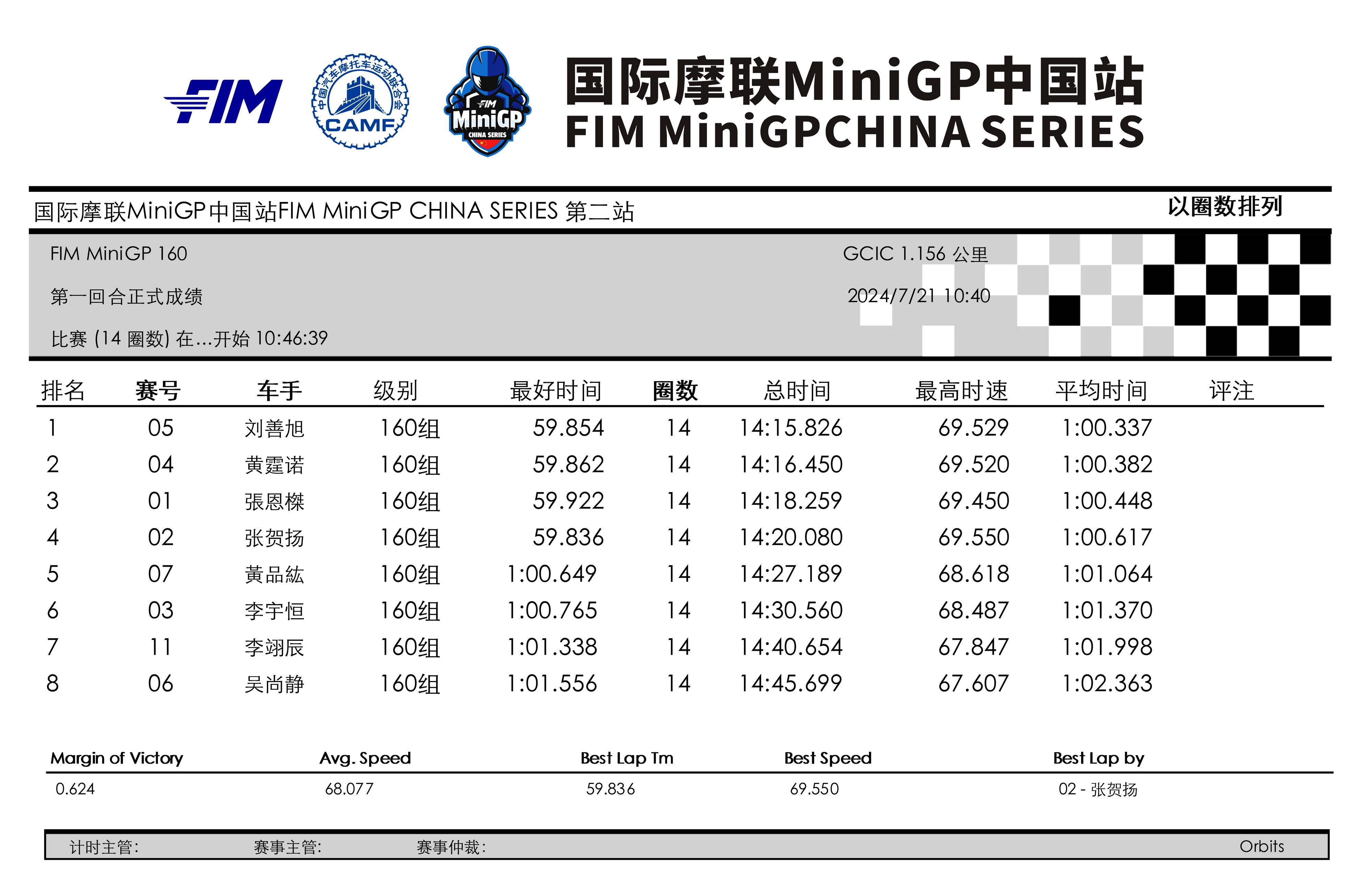 3、Ohvale GP-0 160 組:58.706 秒,伊凡(Qabil Irfan Bin Azlan),馬來(lái)西亞;中國(guó)車(chē)手 59.619 秒,黃霆諾;
