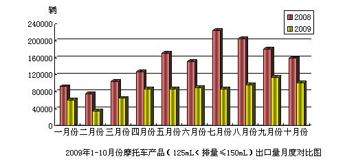 2009年10月份摩托車產(chǎn)品(125mL<排量≤150mL)出口10.16萬輛,比去年同期下降了36.12%;出口金額0.48億美元,比去年同期下降了40.24%。