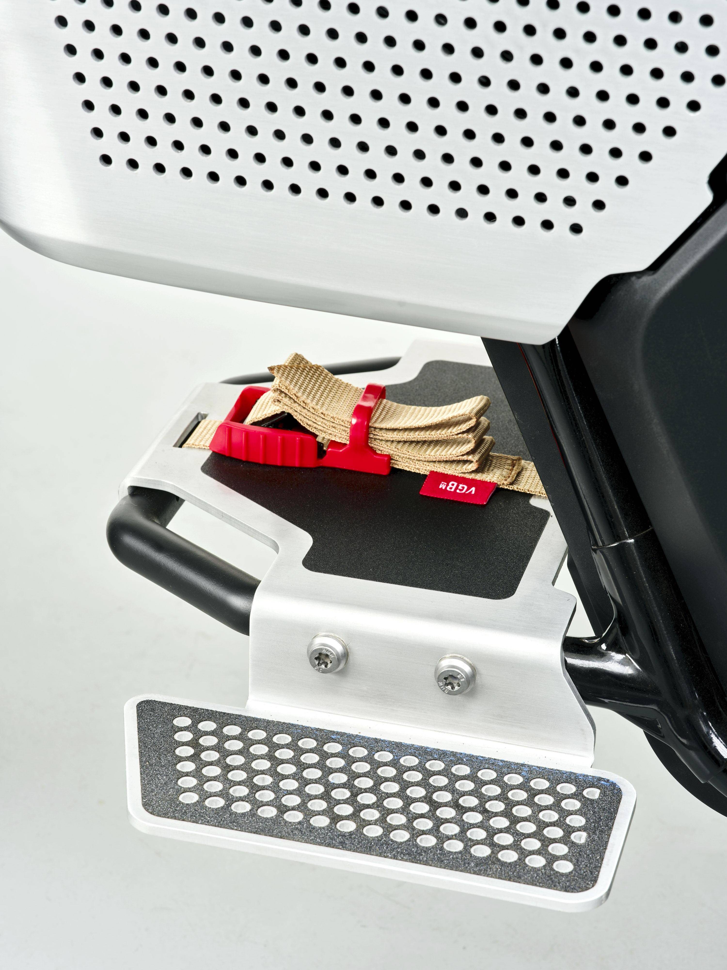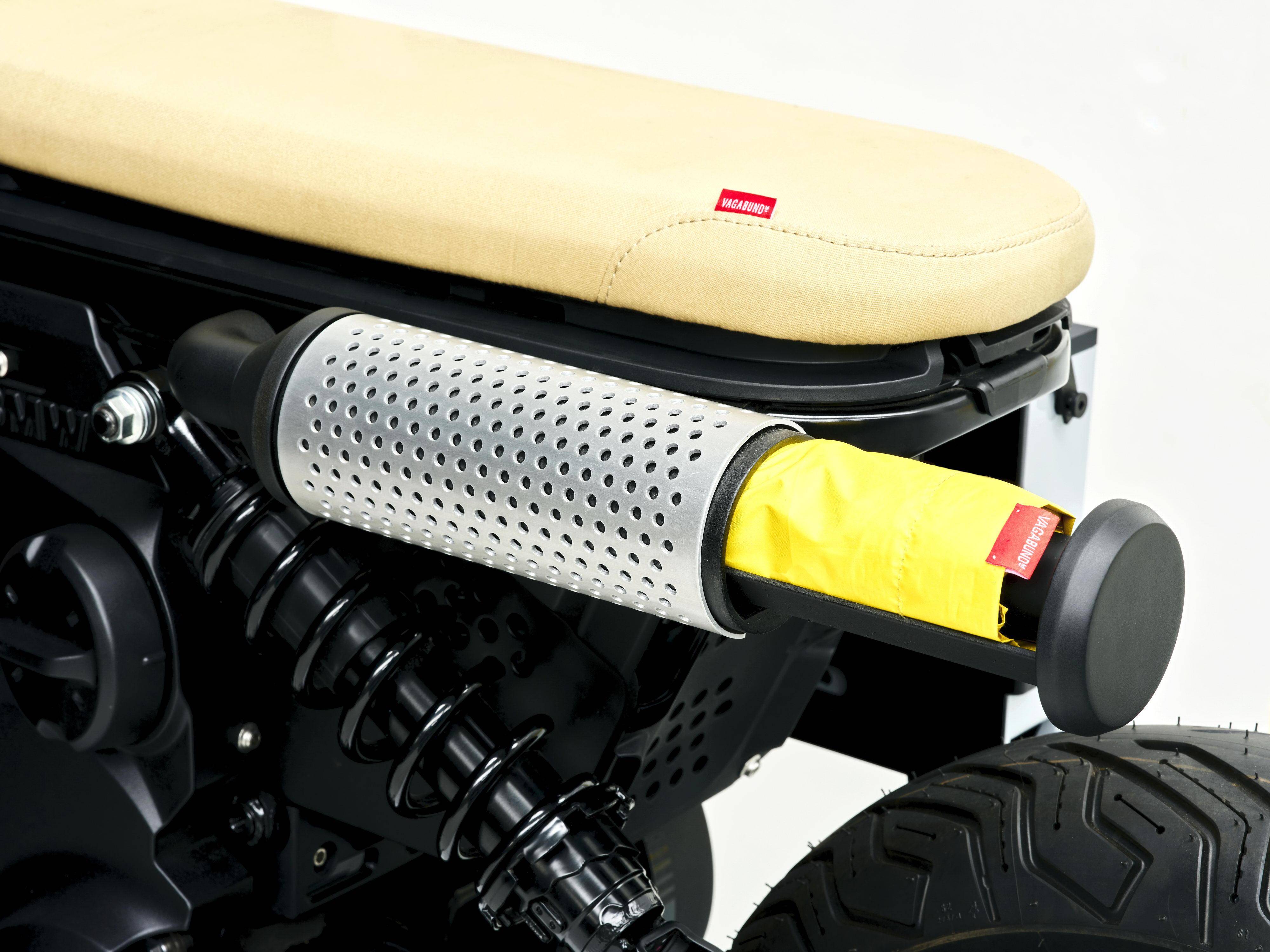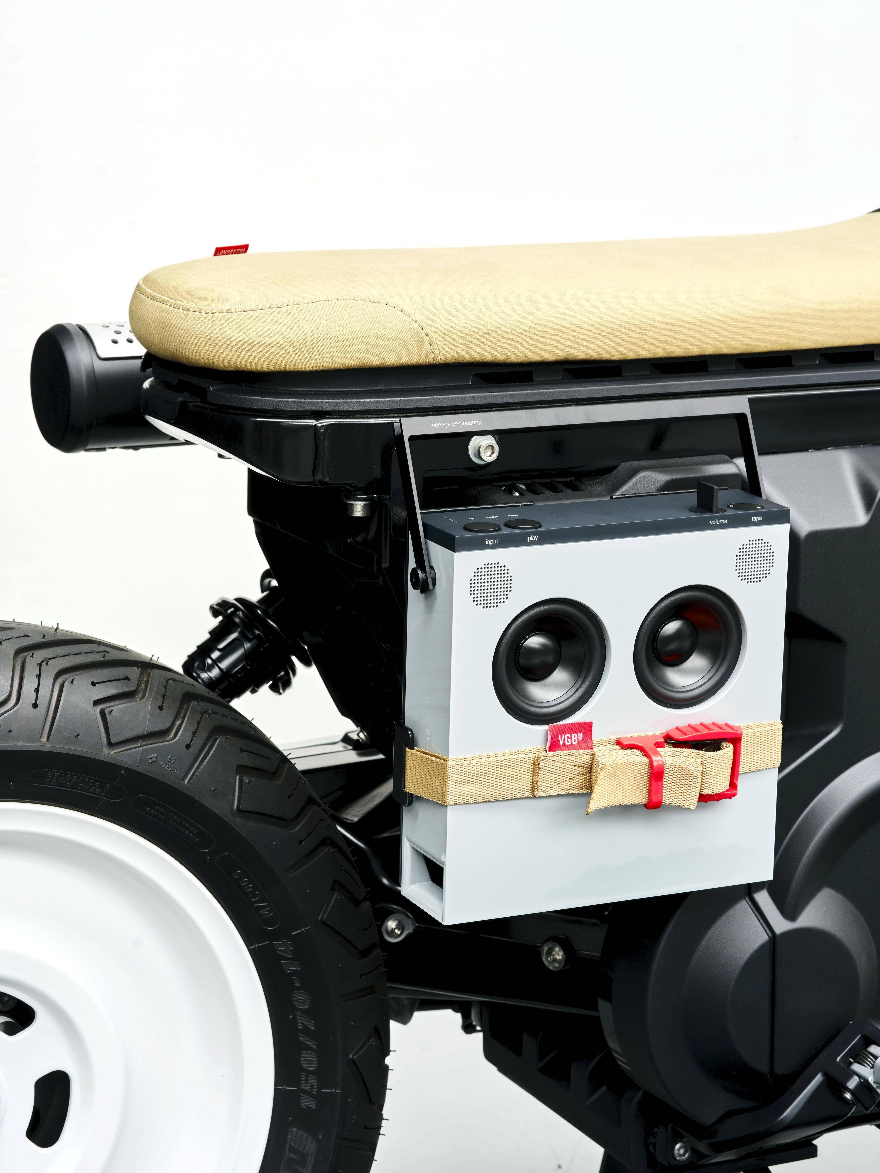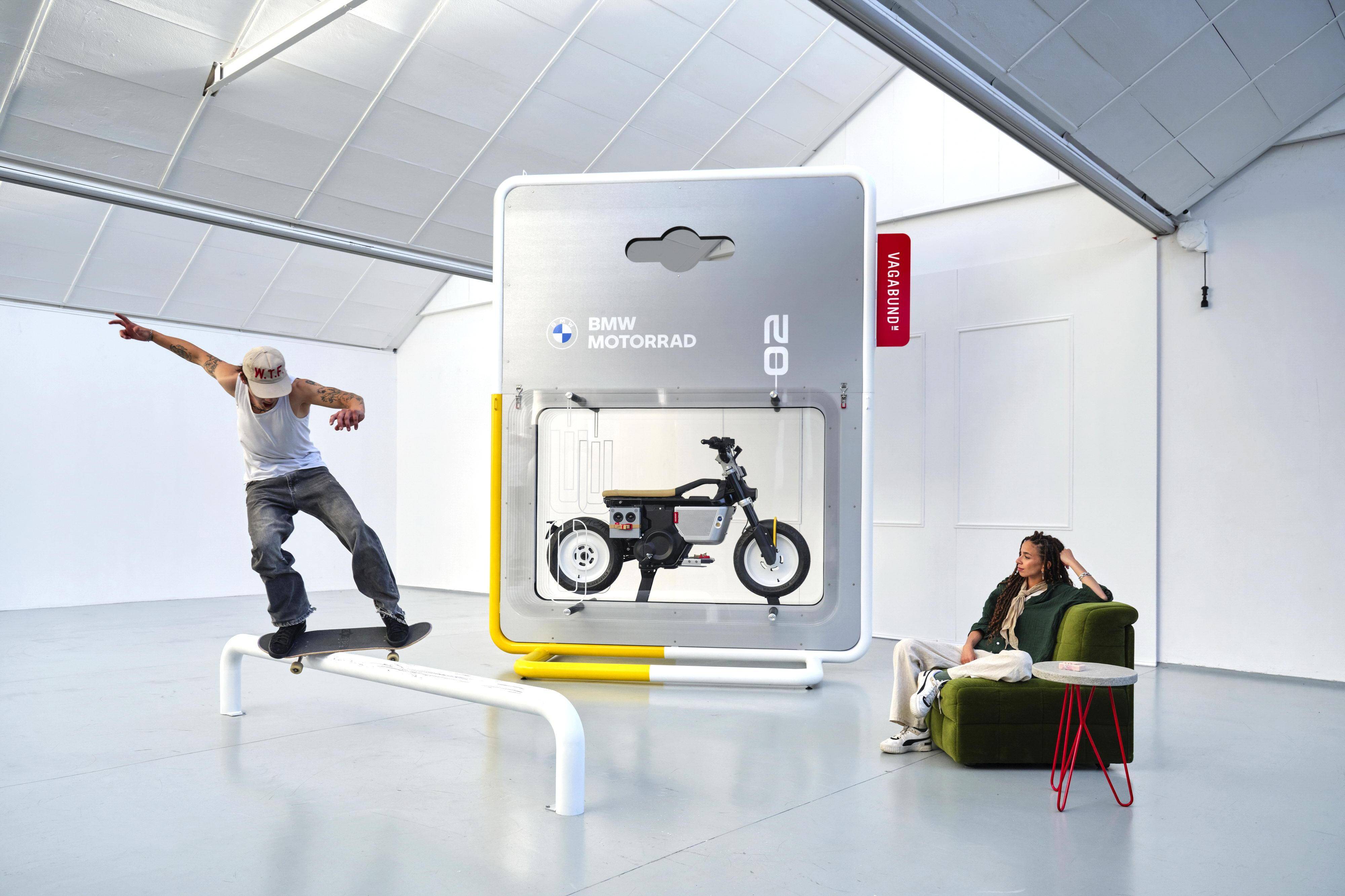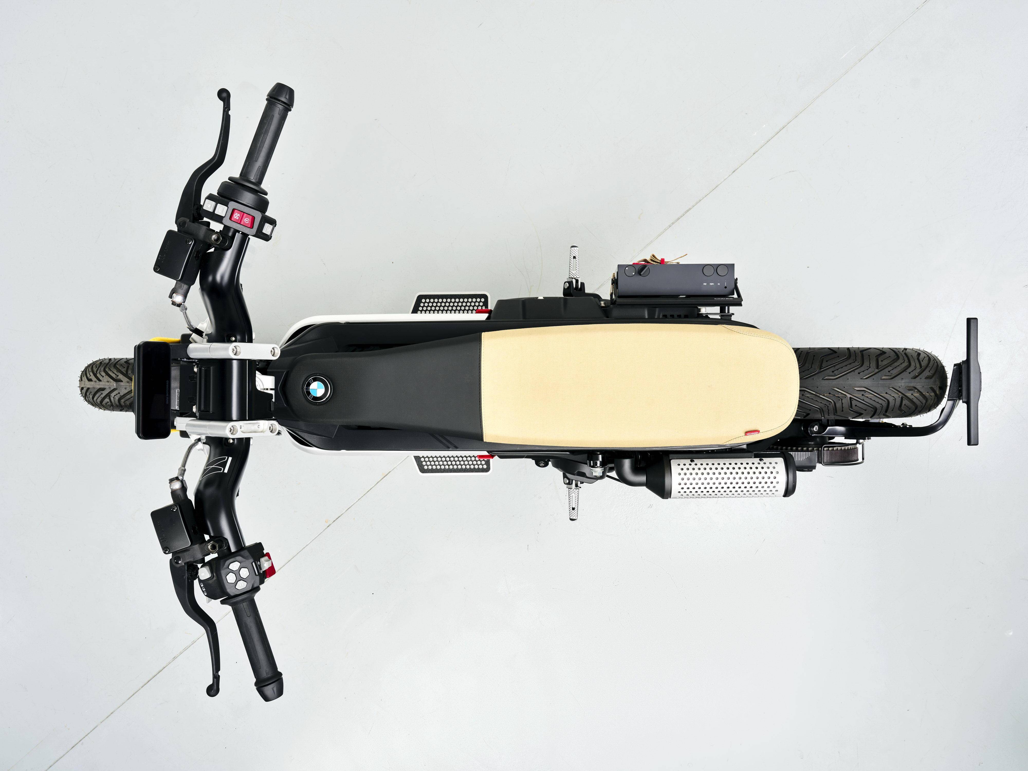 這個寶馬 CE 02 Custom eParkourer 定制作品,采用了未來主義與復古氛圍相結合的設計,除了科幻化的外觀風格,還加入了各種功能性的復古元素:右側掛上名為 OB-4 魔術收音機(OB-4 Magic Radio),左側是一個仿照燃油車排氣管外形的雨傘儲存筒,而額外增加的滑板抓帶、也展現出專注于年輕人的特點。