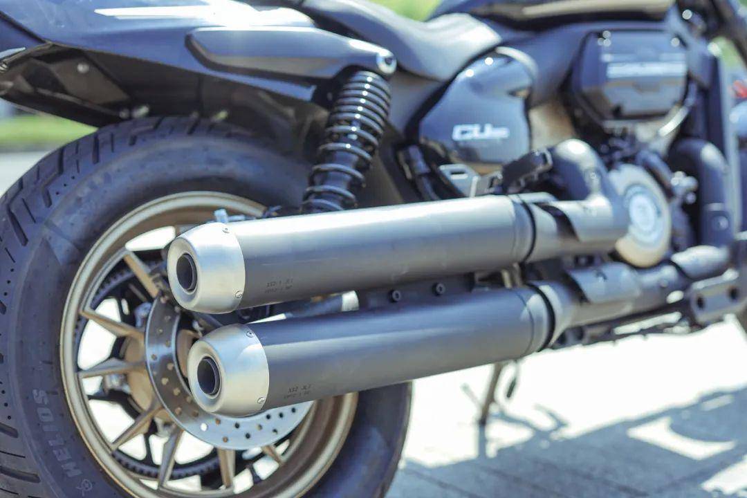 除了敦實,CU250還被定位以運動巡航,所以在外觀設(shè)計上還有一絲運動取向。尾部并沒有像常規(guī)巡航車型那樣“塌”下去,反而以一個相對水平的尾部和一個上揚的后扶手的設(shè)計來收尾。CU250還保留著作為巡航車型的亮點設(shè)計。前面的圓形LED大燈,內(nèi)部有個V字+透鏡設(shè)計、圓形LED儀表、低位鋁合金變徑手把、單邊雙出排氣、伸展姿態(tài)的駕姿……