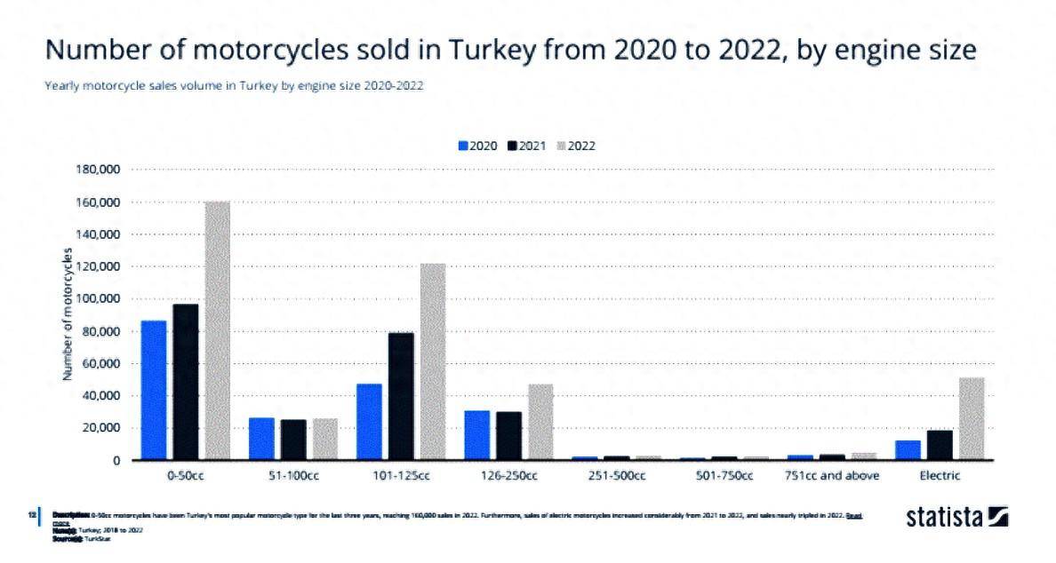 下面的圖片,是 Statista 的另一份研究數(shù)據(jù):土耳其市場(chǎng) 2020 - 2022,不同排氣量摩托車的銷量: