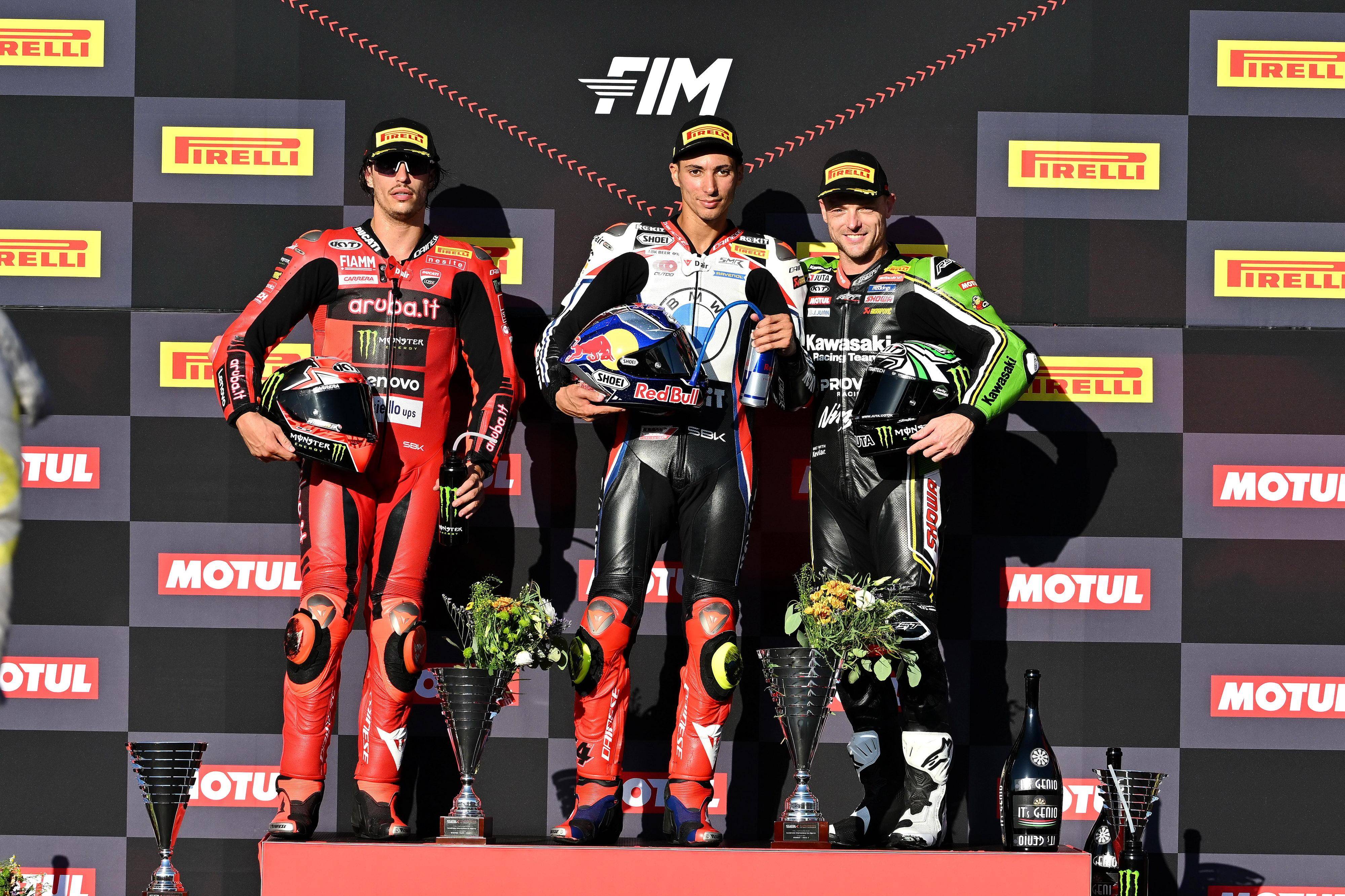 WSBK 級別兩節(jié)比賽的賽程均為 20 圈、折合約 91.8 公里。第一節(jié)的比賽,從第一排起跑的三位車手、上演了一場精彩的角逐,三人互相穿插、并曾各自帶頭,而尾隨在后的另外幾位車手也不甘示弱、步步相逼。最終,到比賽的后段取得領(lǐng)先位置的拉格里奧盧,把優(yōu)勢保持到最后沖線、奪得了冠軍;在下半場比賽開始發(fā)力的捌弟(Alvaro Bautista,巴迪斯塔)落后前車不到 1 秒、奪得了亞軍,緊隨在后的佩魯奇拿到了季軍。