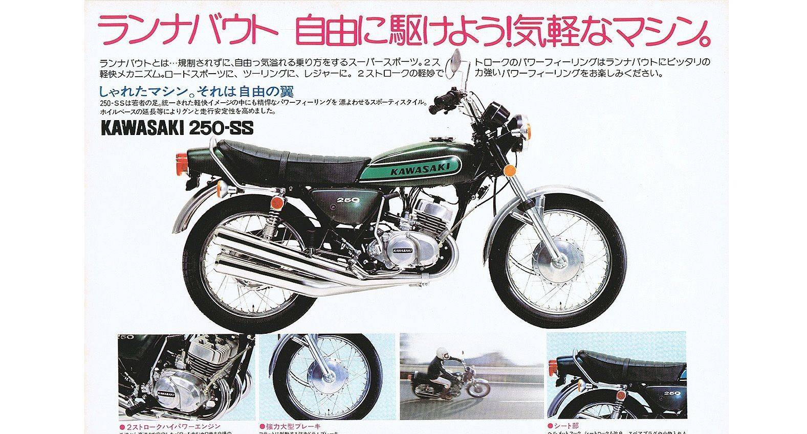 這其中,于1972年登場的 250SS(也被稱為 KH250 )成為了這個家族的最年輕成員。 250SS 采用了 249cc 的三缸引擎,具有 32PS @ 8,000rpm 的最大馬力和 3kg-m @ 7,000rpm 的最大扭力,并安裝在與Mach II 350 相同的車架中。