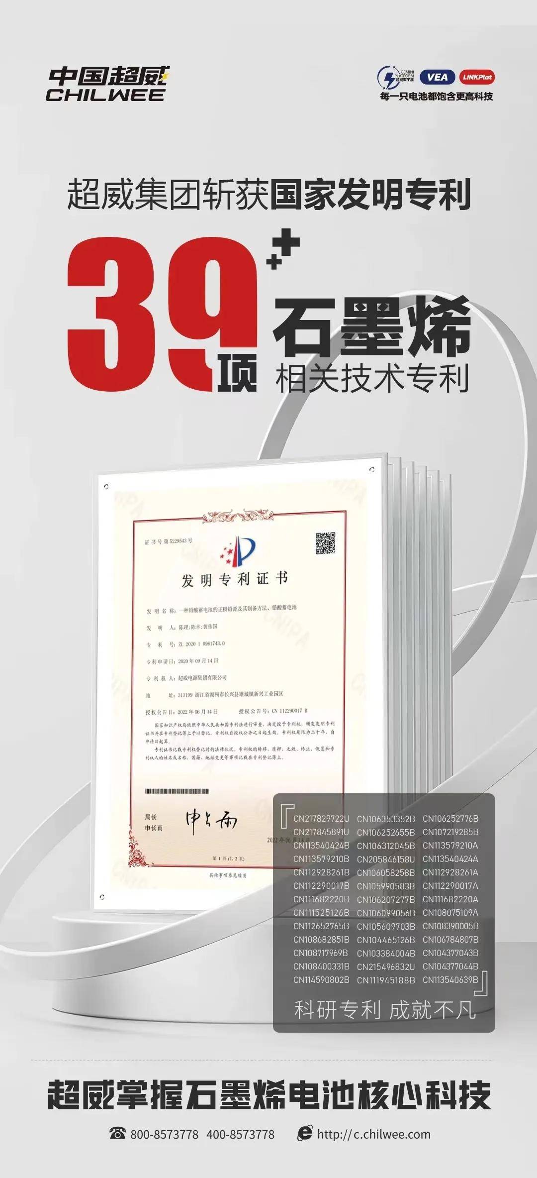 此外,作為首家將石墨烯技術(shù)應(yīng)用到電動(dòng)車電池領(lǐng)域的企業(yè),超威不遺余力推動(dòng)石墨烯技術(shù)在電池領(lǐng)域的應(yīng)用,截止到目前累計(jì)獲得相關(guān)專利突破39項(xiàng),成為行業(yè)唯一一家真正掌握石墨烯電池核心科技的領(lǐng)先企業(yè)。