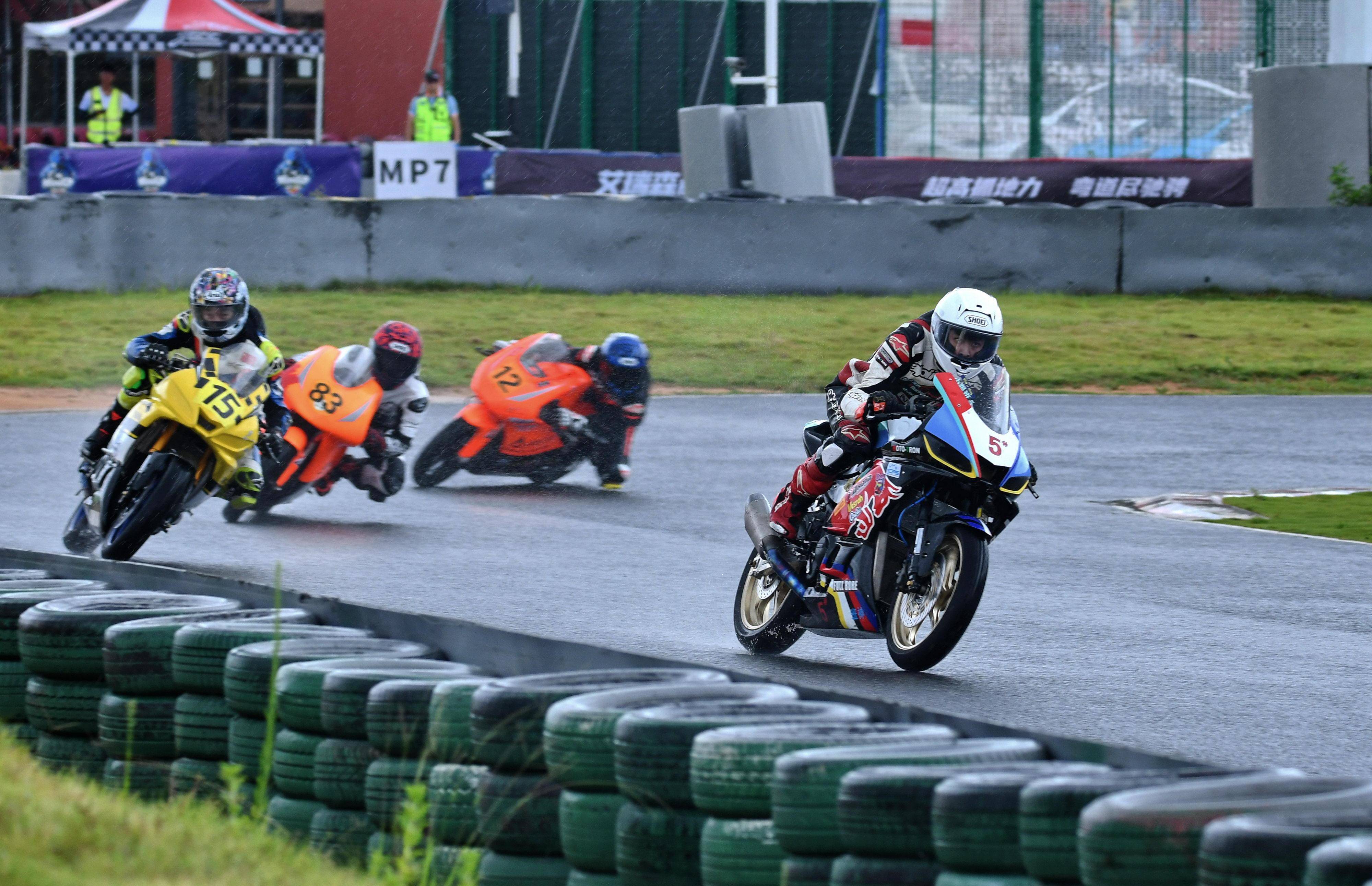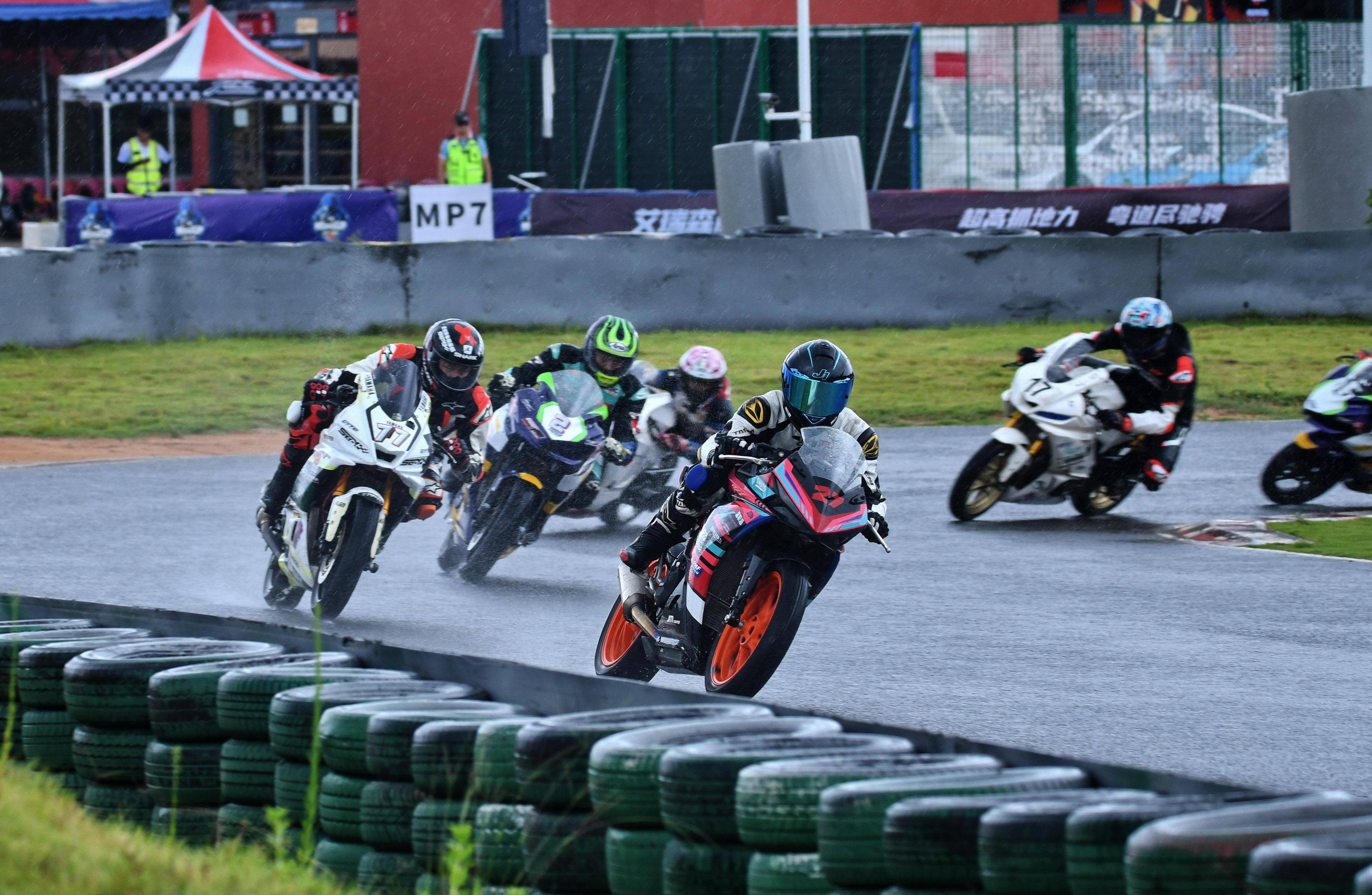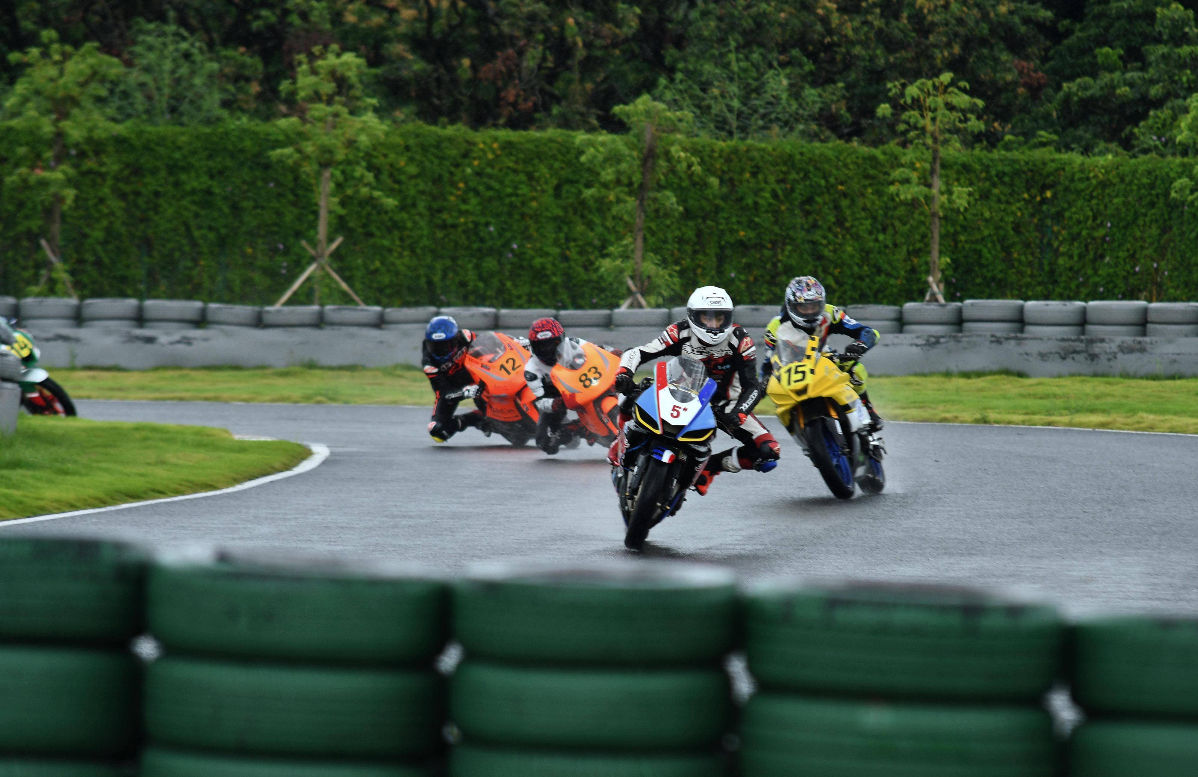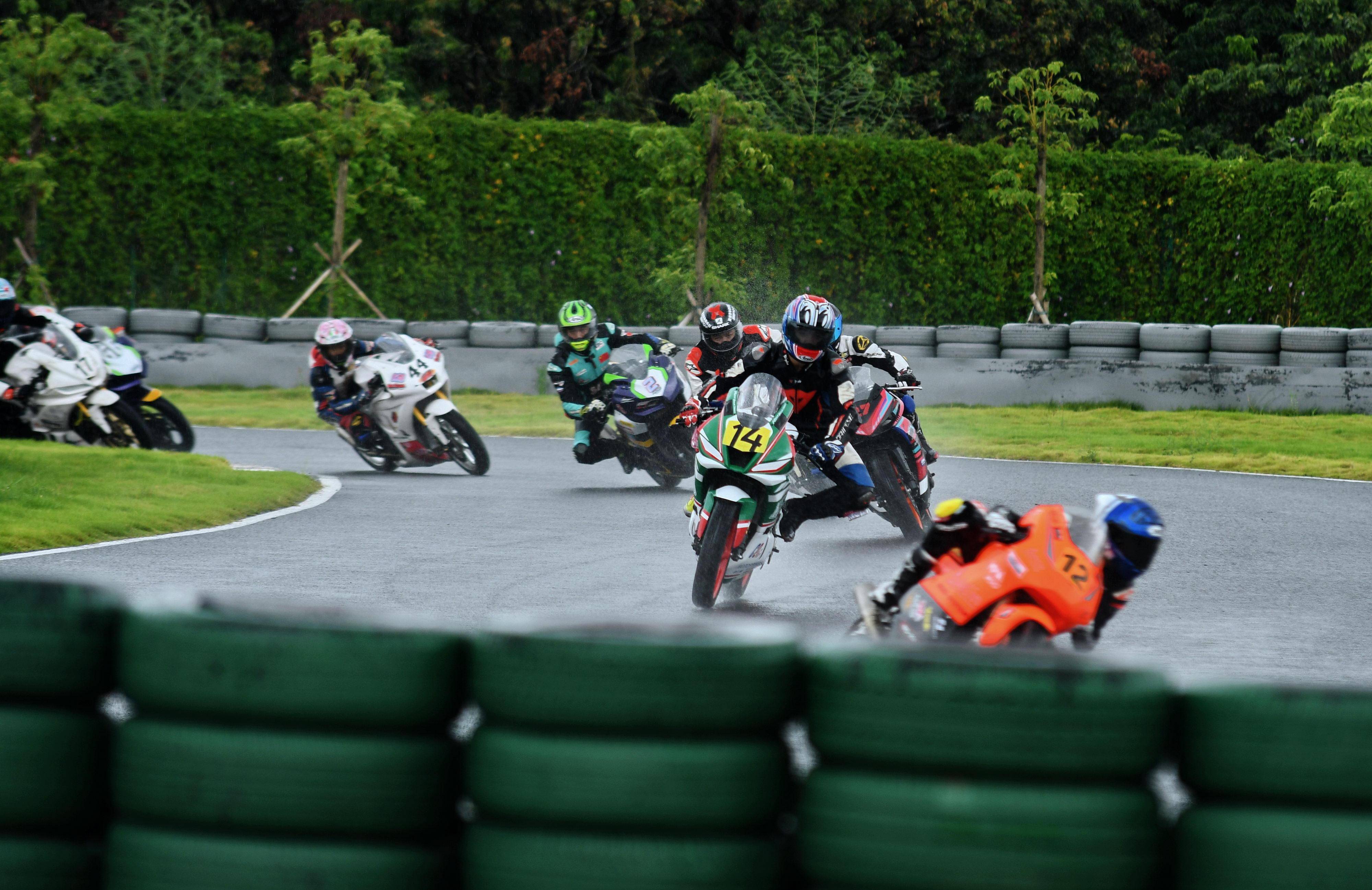 第一節(jié)比賽是雨中的角逐,從排頭位出發(fā)的黎吉鋒、在第一個(gè)彎就取得了領(lǐng)先位置,并采用快放策略、完成了第 1 圈回到起跑點(diǎn)過(guò)線時(shí),與后車(chē)?yán)_(kāi)了大約 0.7 秒的距離;10 圈的比賽,到第 5 圈比賽完成時(shí),他的領(lǐng)先優(yōu)勢(shì)擴(kuò)大至 2 秒多;后面,解金澔、周峻熙、12 號(hào)車(chē)的蘇子弦(單缸組)等,車(chē)輪卷著水花、奮力追趕;而雙缸組的四位車(chē)手,14 號(hào)車(chē)的劉歡愷、77 號(hào)車(chē)的孫洪濤、27 號(hào)車(chē)的溫職滔、2 號(hào)車(chē)的馮潤(rùn)鏡,則為這場(chǎng)比賽奉獻(xiàn)了精彩的肉搏戰(zhàn)。