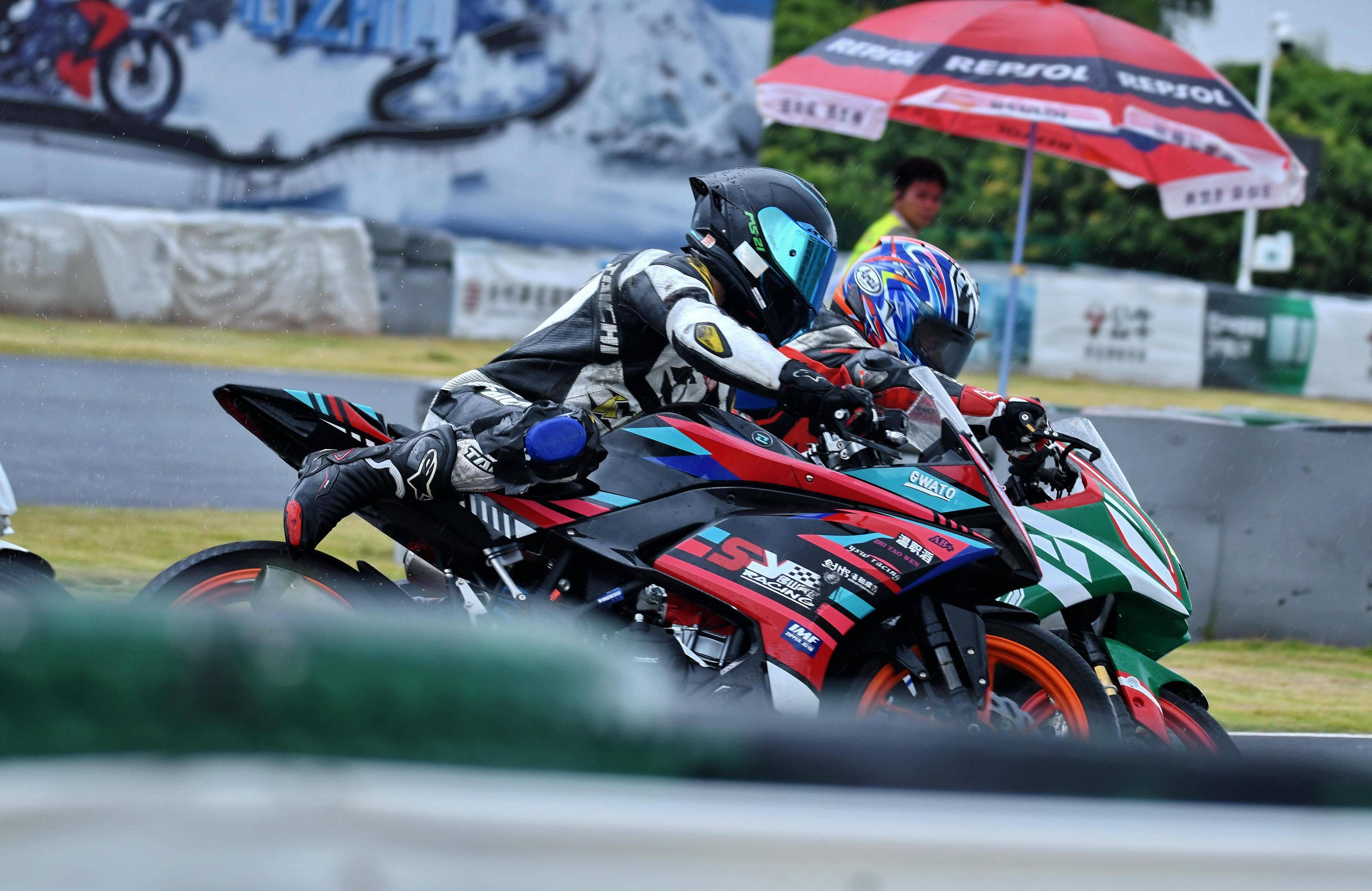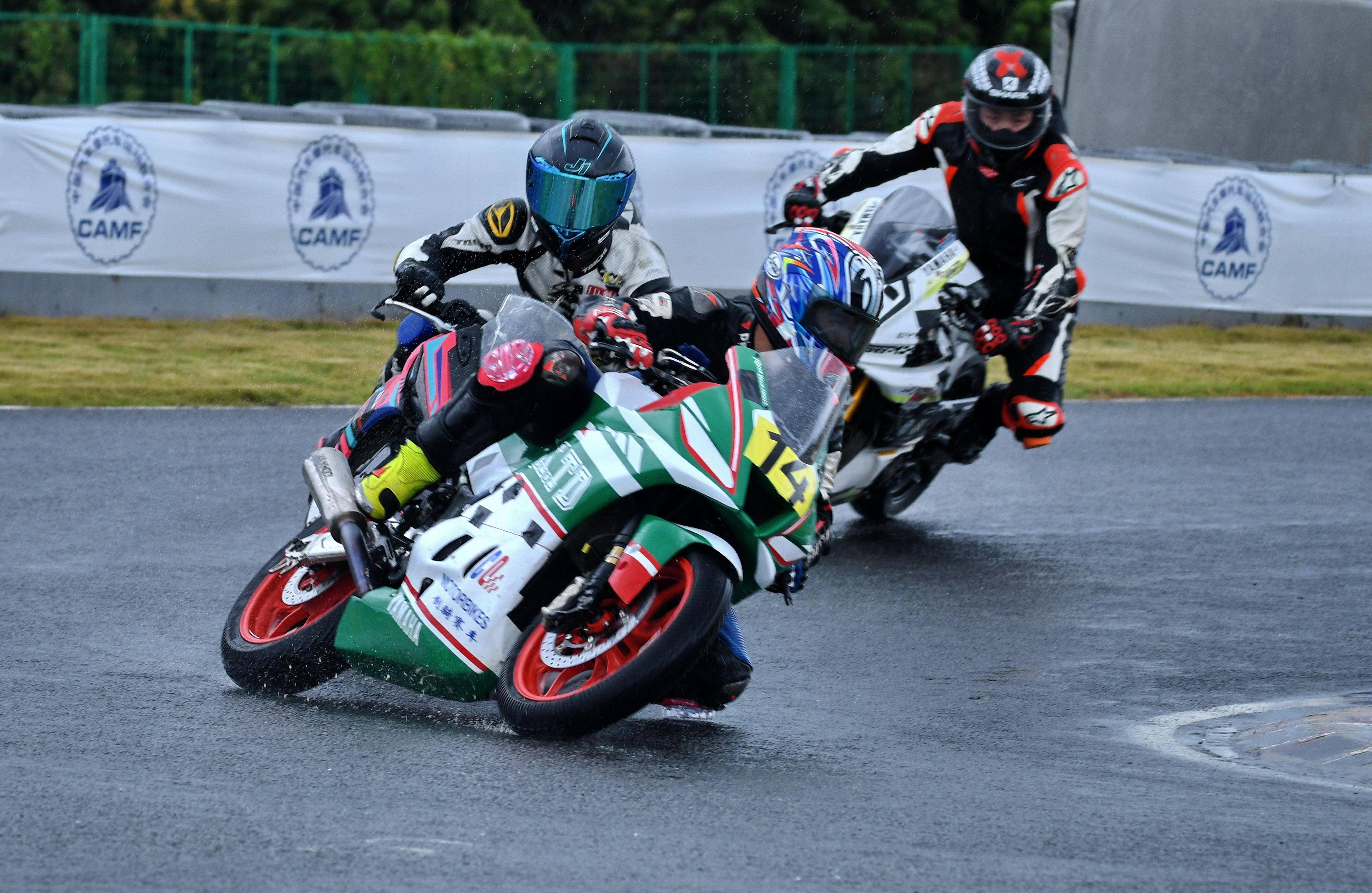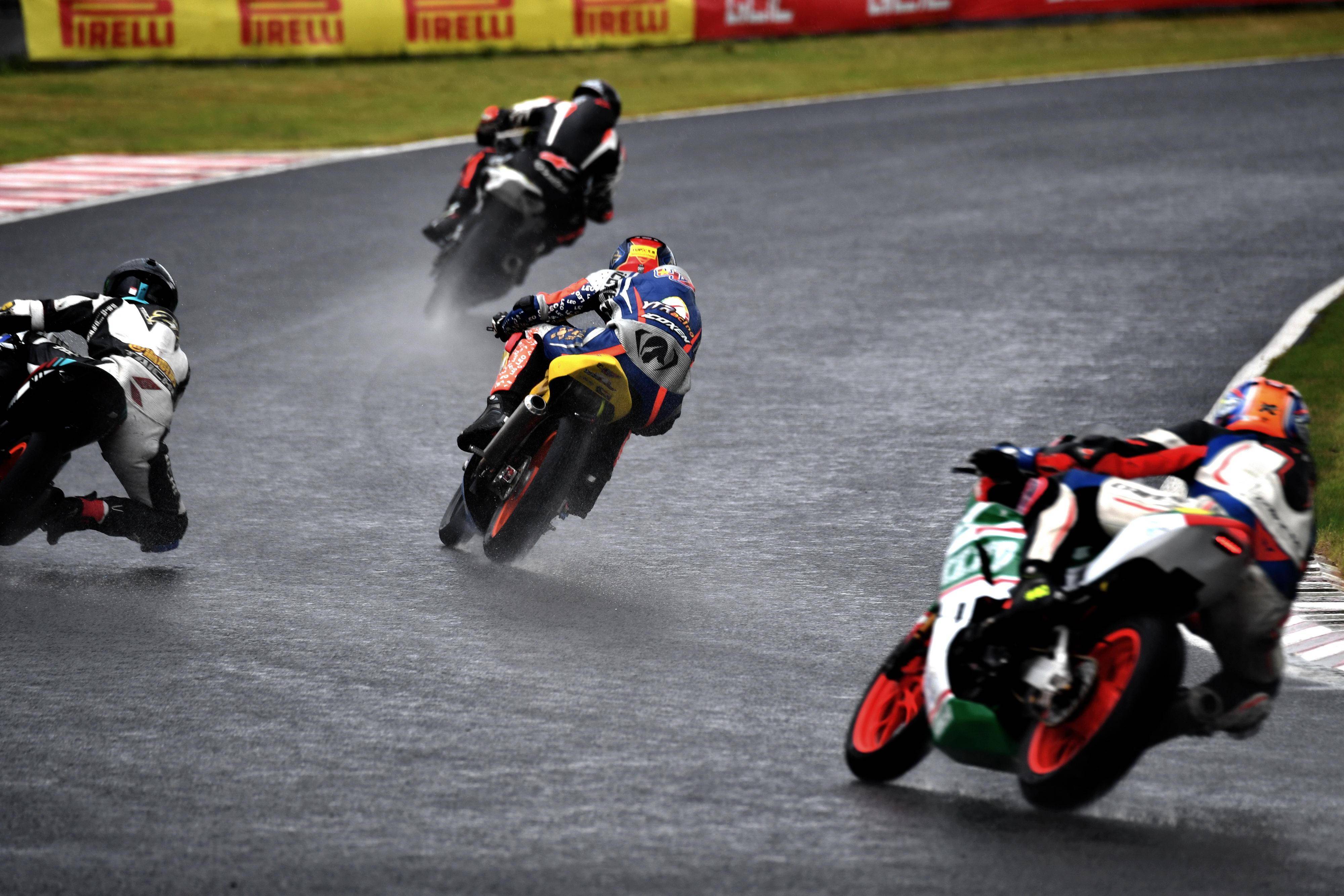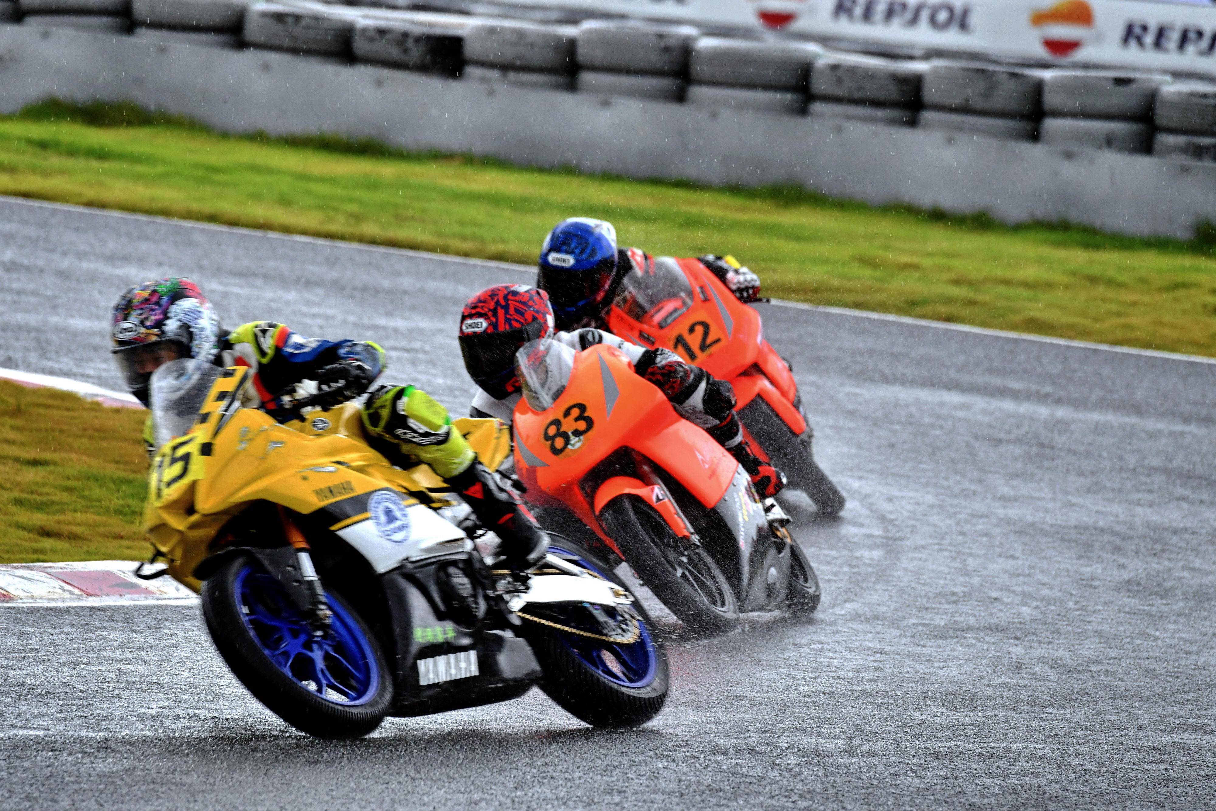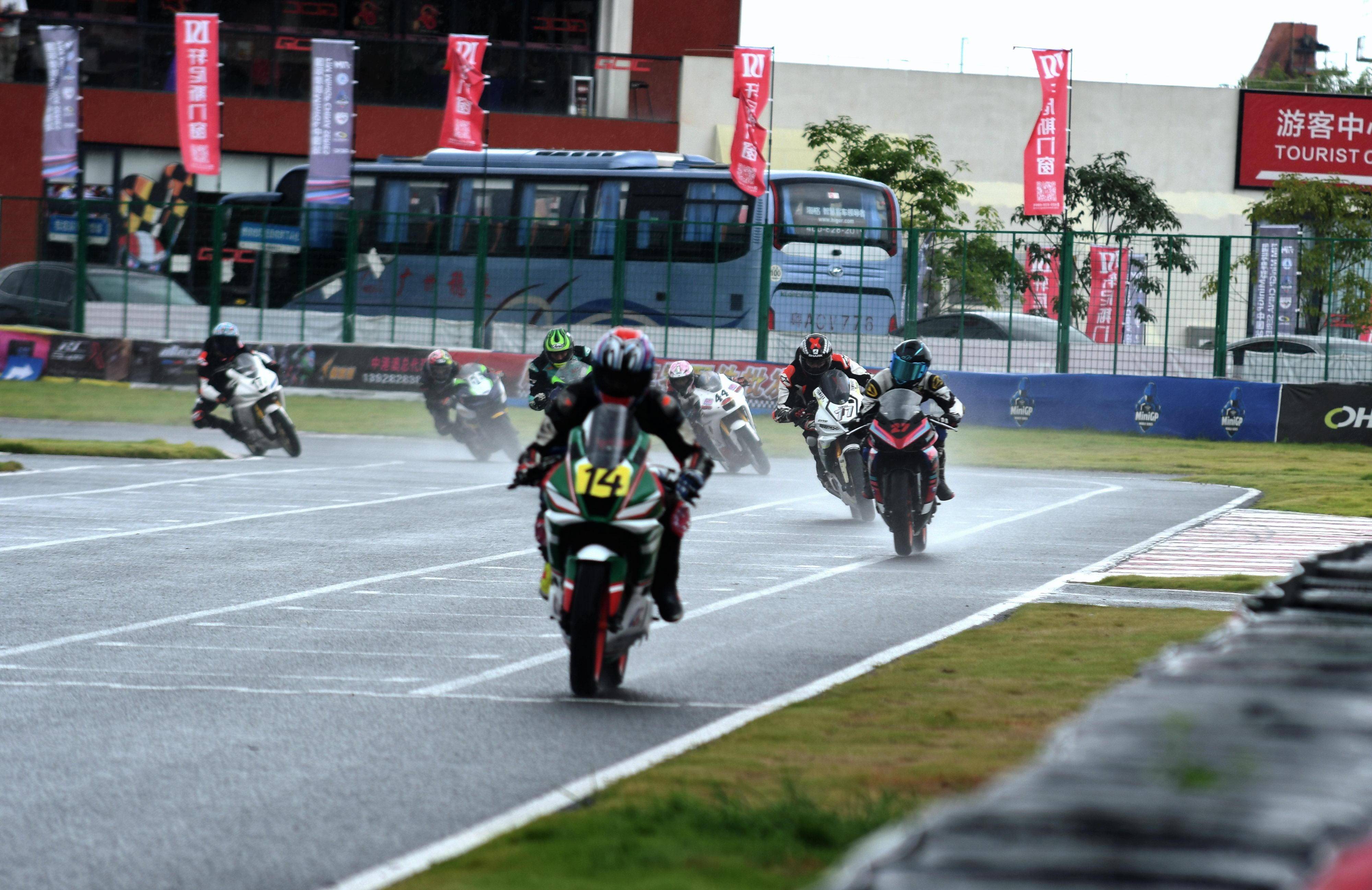 第一節(jié)比賽是雨中的角逐,從排頭位出發(fā)的黎吉鋒、在第一個(gè)彎就取得了領(lǐng)先位置,并采用快放策略、完成了第 1 圈回到起跑點(diǎn)過(guò)線時(shí),與后車(chē)?yán)_(kāi)了大約 0.7 秒的距離;10 圈的比賽,到第 5 圈比賽完成時(shí),他的領(lǐng)先優(yōu)勢(shì)擴(kuò)大至 2 秒多;后面,解金澔、周峻熙、12 號(hào)車(chē)的蘇子弦(單缸組)等,車(chē)輪卷著水花、奮力追趕;而雙缸組的四位車(chē)手,14 號(hào)車(chē)的劉歡愷、77 號(hào)車(chē)的孫洪濤、27 號(hào)車(chē)的溫職滔、2 號(hào)車(chē)的馮潤(rùn)鏡,則為這場(chǎng)比賽奉獻(xiàn)了精彩的肉搏戰(zhàn)。