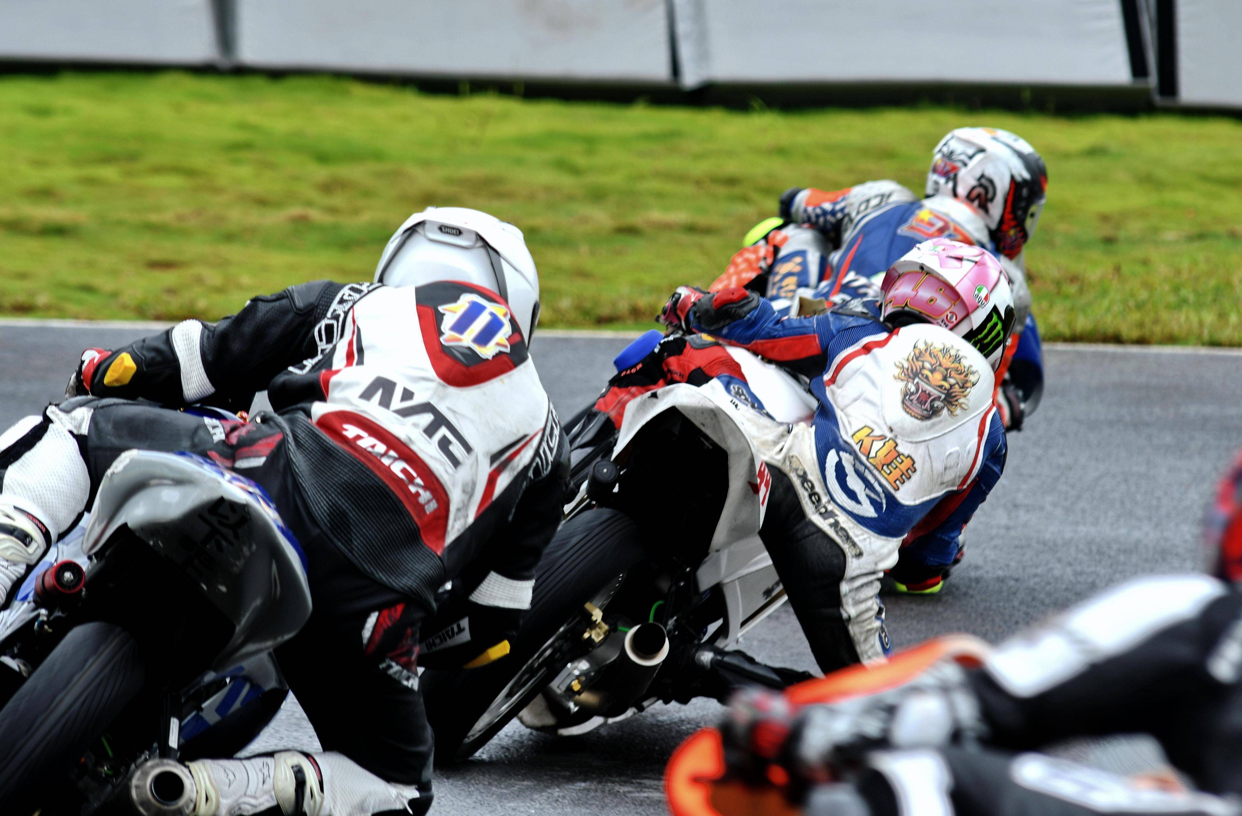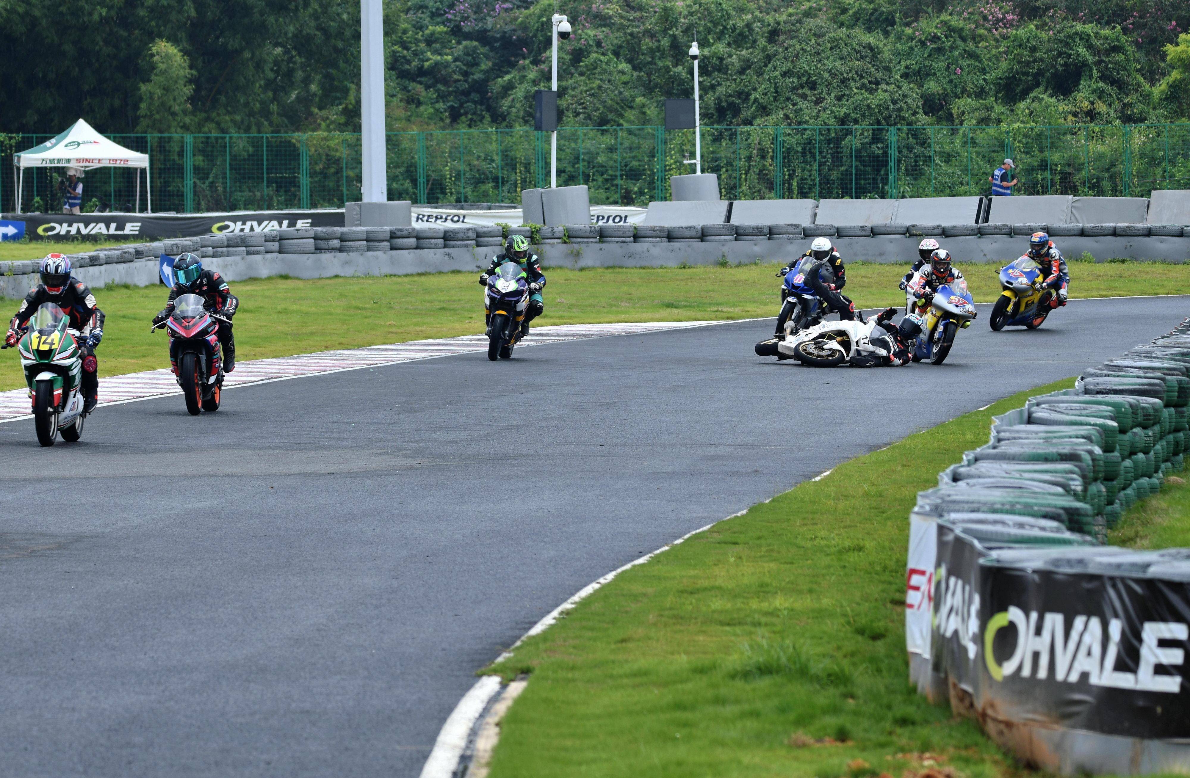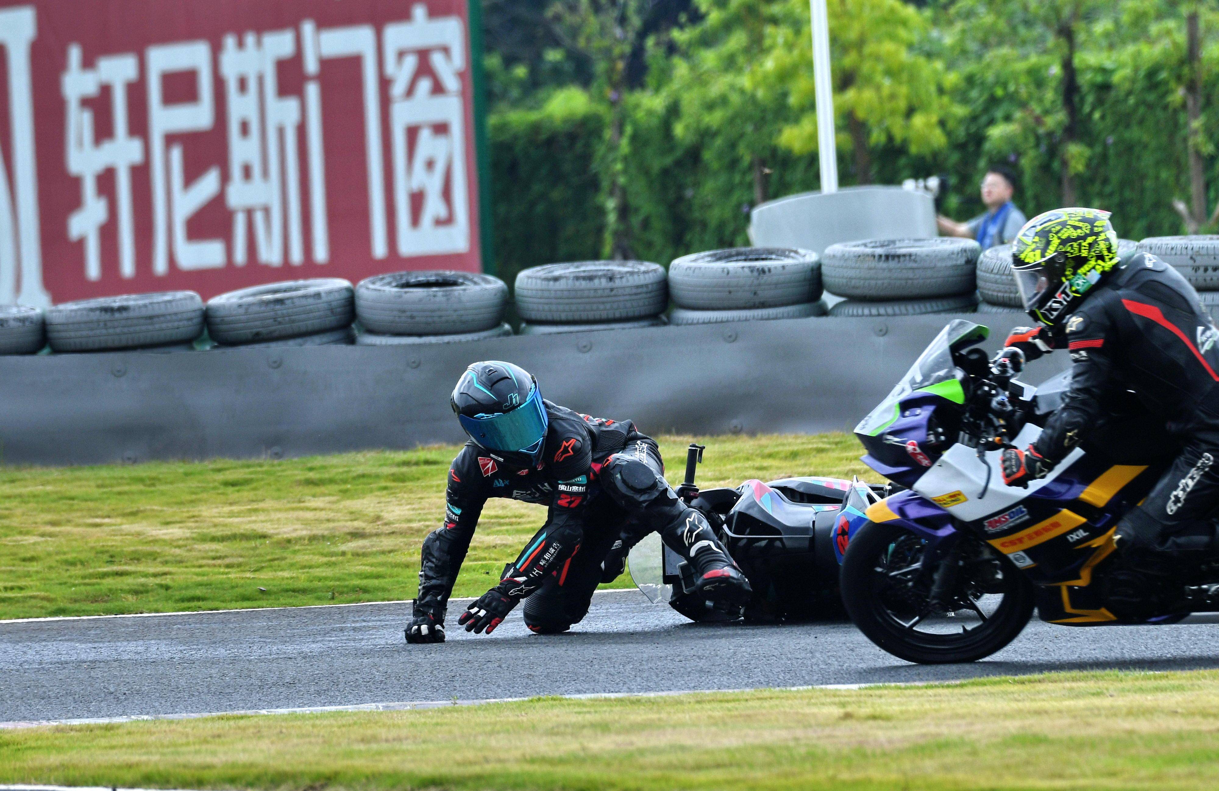 第二節(jié)比賽同樣是在濕地之下進(jìn)行,熱身圈就發(fā)生了滑倒的意外;到正式起跑后的第 1 圈,在 3 號(hào)彎的出彎處就發(fā)生了兩車(chē)碰撞、摔倒的意外,比賽被紅旗終止。
