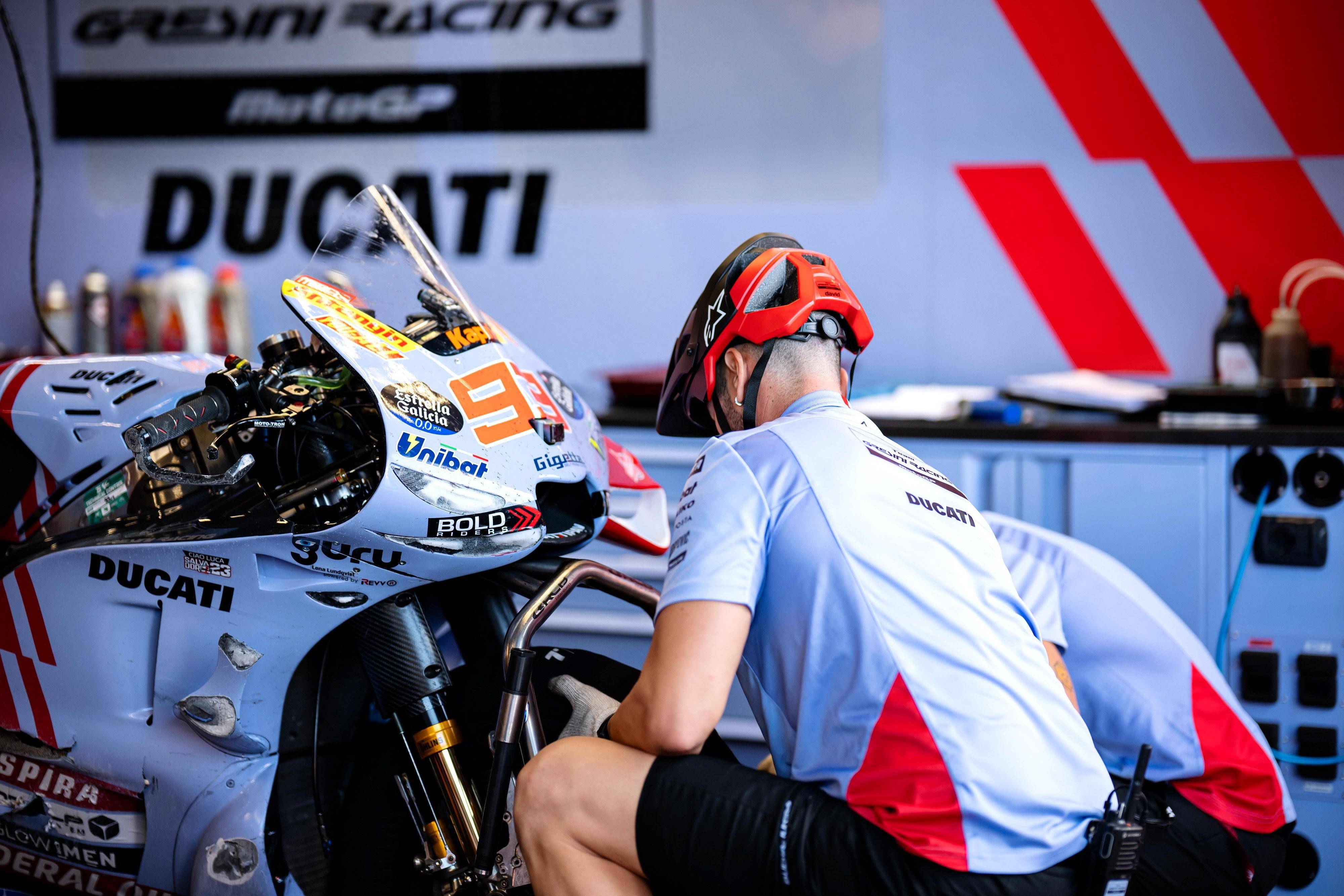 昨天周末(九月 21 日),MotoGP 級(jí)別進(jìn)行了 Q1、Q2 排位賽和 Sprint 短途沖刺賽。首先開始的 Q1,小馬昆斯在出場(chǎng)沒多久就在 1 號(hào)彎發(fā)生了摔車 —— 這是他繼周五之后、在同一位置發(fā)生的第二次意外。重新回到跑道上后,他最終只能跑出 1 分 32.332 秒的最好圈速、無緣 Q2,排在沖刺賽和正賽的最后位置發(fā)車。
