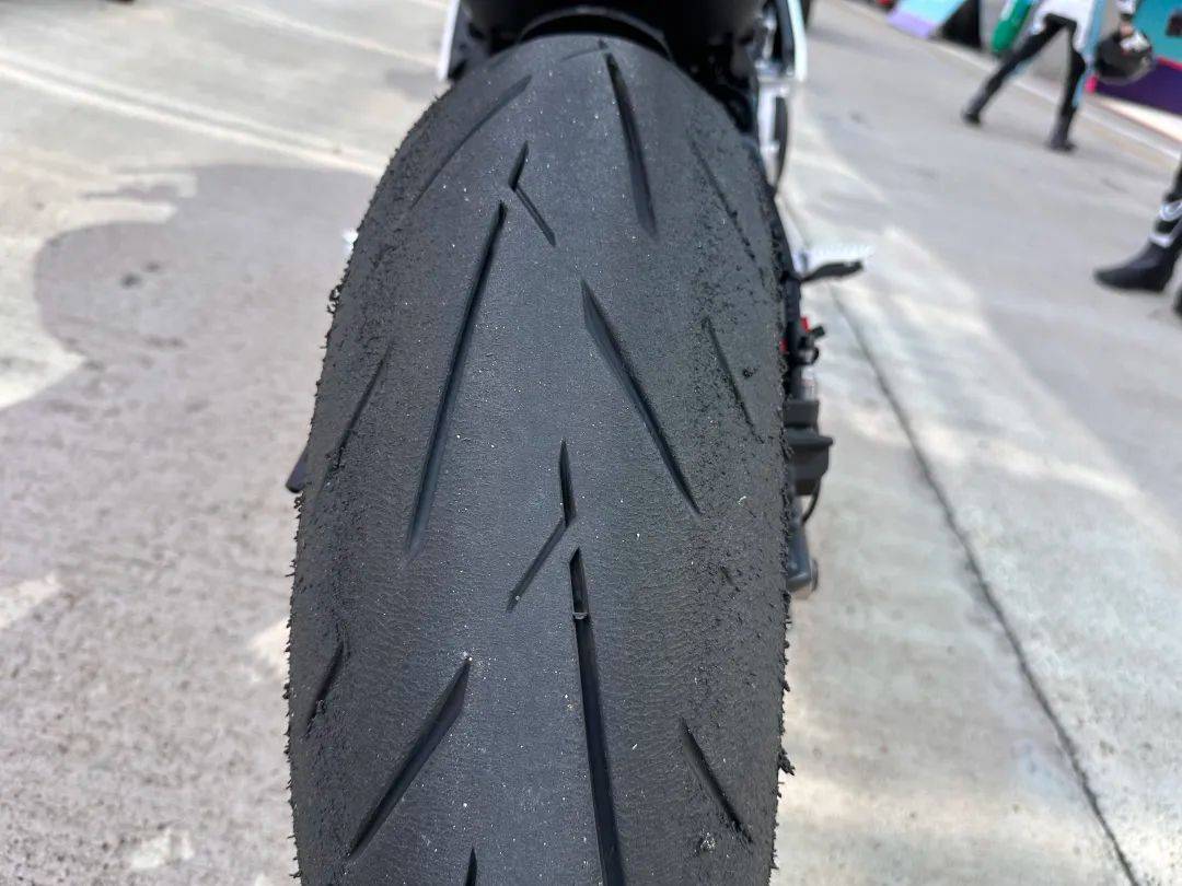 得益于雙翼梁環(huán)抱式鉻鉬合金鋼車架+鷗翼式鋁合金后搖臂的加持,整車配重比50:50,經(jīng)由頂級(jí)專業(yè)車手調(diào)校,注定在賽車場(chǎng)有專業(yè)的表現(xiàn)。在鄂爾多斯這條大賽道上做到高速?gòu)澮?10km/h的速度通過,穩(wěn)定感十足,給人非常強(qiáng)的信心,在通過馬背式連續(xù)S型低速?gòu)潟r(shí),車架穩(wěn)定性、彎中循跡性表現(xiàn)都是相當(dāng)出色,快速傾倒、快速翻身游刃有余,一點(diǎn)沒有中量級(jí)仿賽的體量感,也就是說675SR賽道下彎翻身非常輕盈靈活,真正達(dá)到專業(yè)賽車的水準(zhǔn),國(guó)產(chǎn)同級(jí)無出其右。所以說車子真不能只看參數(shù)配置,正如名廚一樣,普通的食材經(jīng)過加工也可以成為頂級(jí)佳肴。感覺春風(fēng)已經(jīng)越過了堆配置、參數(shù)的初級(jí)階段,不再一味迎合普通或小白用戶,而是真正從專業(yè)玩車、專業(yè)調(diào)校的角度去對(duì)待這臺(tái)675SR。比如原廠選擇的這套CST S3N輪胎,也是與眾不同,更顯專業(yè)。輪胎中間位置是半熱熔配方,兼顧日常使用的耐磨需求,輪胎兩側(cè)則是全熱熔配方,在賽道中可以做到更好的升溫和彎道抓地性。在一天的激烈駕駛下來,可以看到輪胎兩側(cè)的明顯“胎屎”,這也是全熱熔配方的好處,彎中抓地明顯要強(qiáng)于半熱熔輪胎。在賽道里不停地開腿,磨膝,變換身位,在輪胎已經(jīng)吃滿的狀態(tài)下,仍未能觸到探地釘,車輛的極限很高,原廠最大55度的傾角就已經(jīng)很能滿足賽道需求,要是經(jīng)過賽化改裝去跑比賽,675SR-R的潛力將會(huì)進(jìn)一步放大。在連續(xù)的彎道駕駛中,很清晰的感受到,675SR-R上這套18段可調(diào)的KYB避震器,原廠的設(shè)定在激烈駕駛中偏軟,在時(shí)速190km/h左右的高速狀態(tài)下重剎進(jìn)彎,前避震的壓縮量明顯,同時(shí)避震的回彈有些偏快,導(dǎo)致車頭有較為清晰的彈跳感,對(duì)于整車穩(wěn)定性影響明顯,后來調(diào)硬4格,就消除了不穩(wěn)定感,這就是全可調(diào)減震的好處。后減震采用的直連減震,沒有采用多連桿。這也是目前網(wǎng)上熱門話題,多連桿成本高、應(yīng)對(duì)復(fù)雜路面的處理能力更好,而直連更考驗(yàn)車企調(diào)教功底,這不是堆配置就能解決的。675SR-R后減震在賽道高速?gòu)潱退購(gòu)澏己芊€(wěn)定,比如那個(gè)高速上坡左彎,時(shí)速110左右通過,后避震依然沒有多余的彈跳,表現(xiàn)非常出色。這就是調(diào)校功夫,春風(fēng)可謂標(biāo)桿,毫不吝嗇的“秀肌肉”。