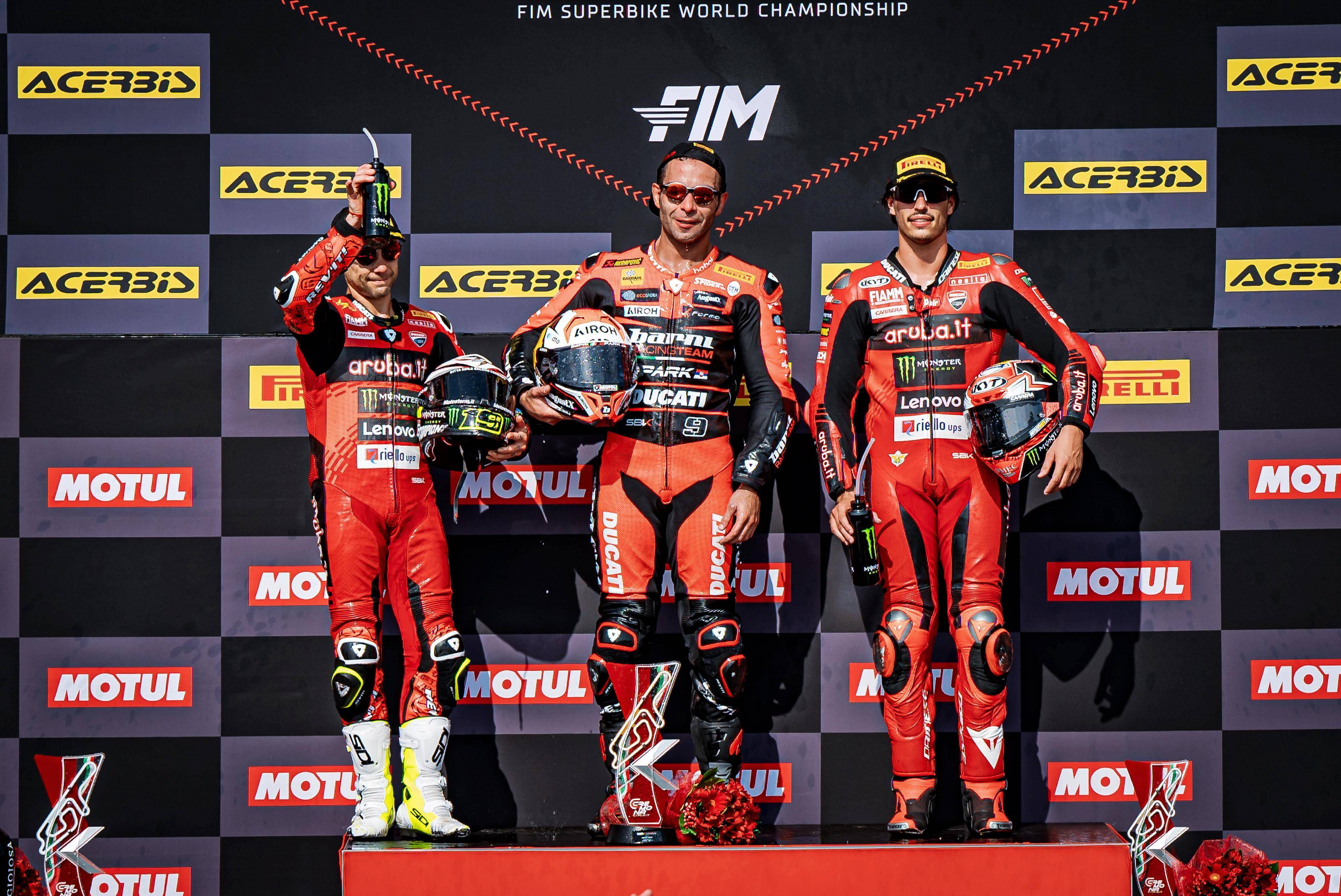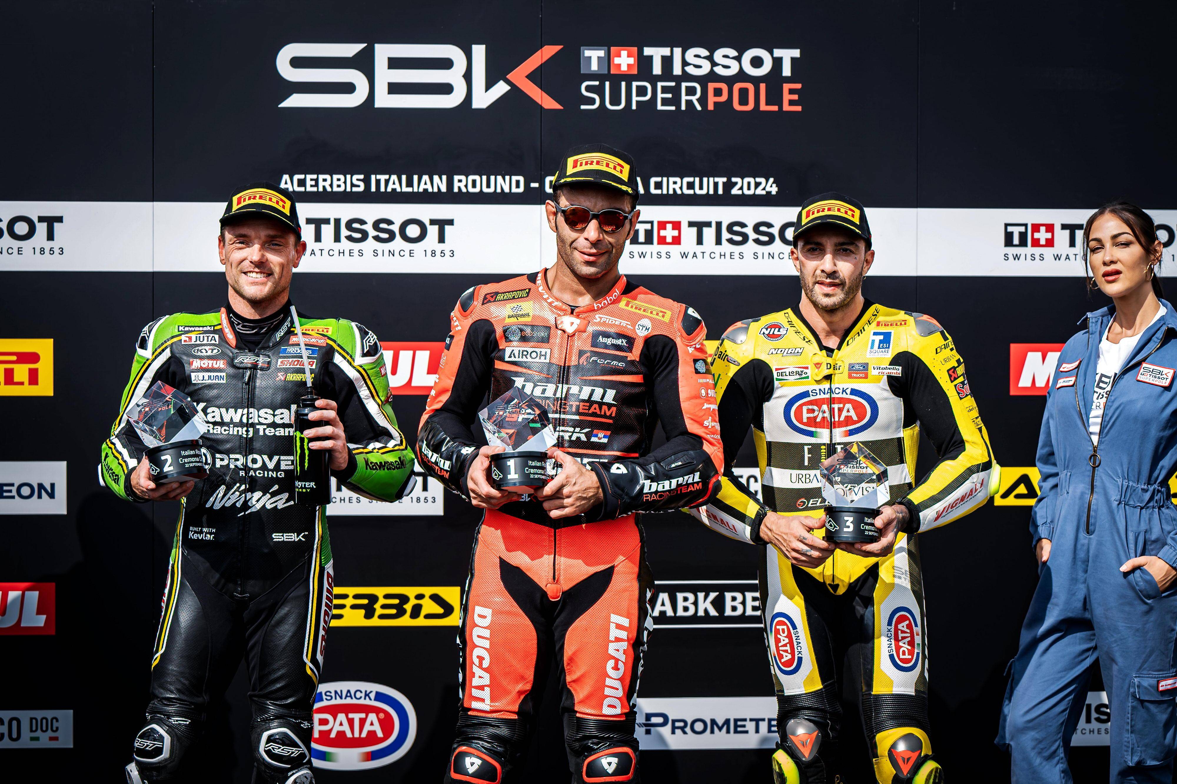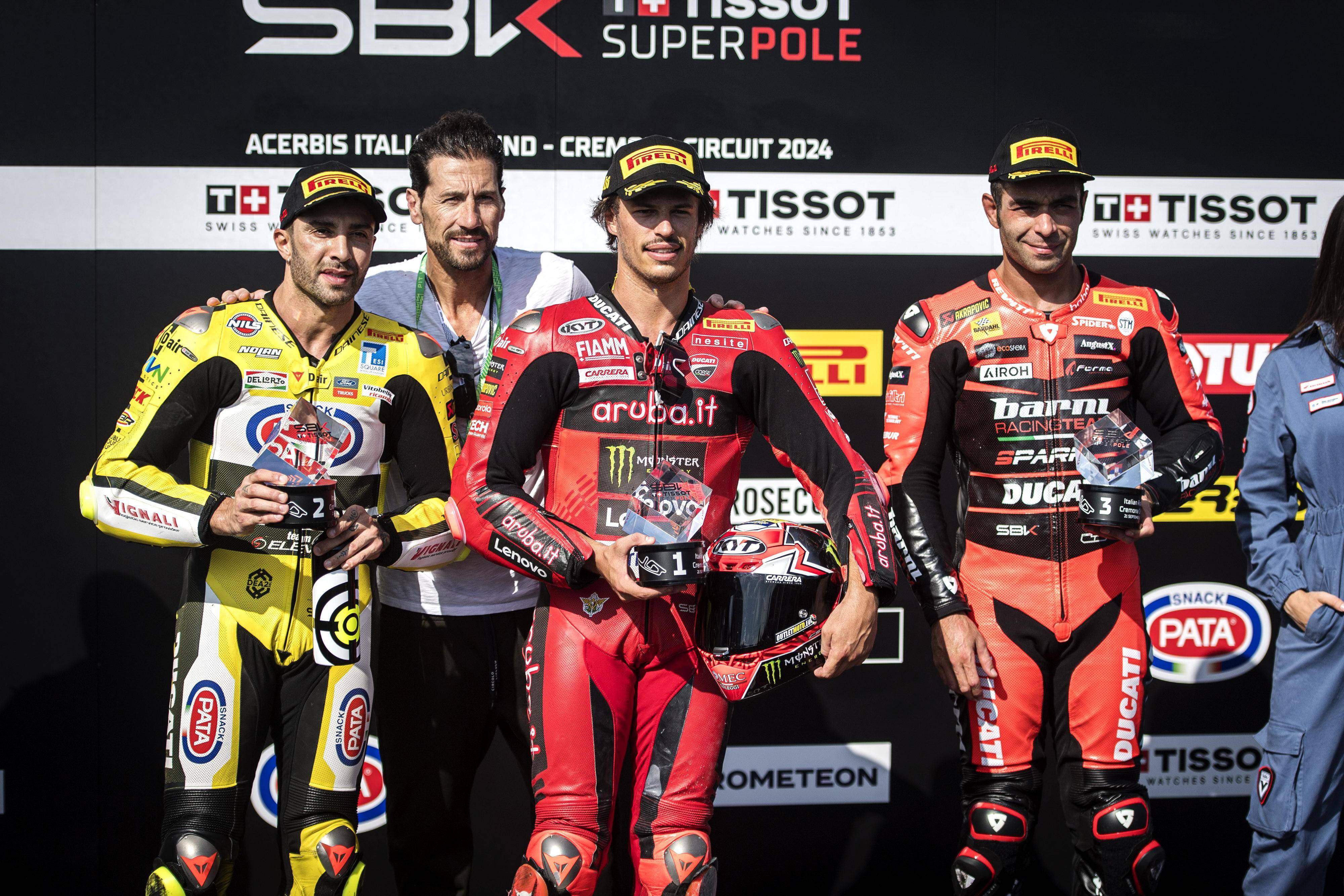 WSBK 級別、賽前的 Super Pole 超級排位賽,11 號車的布雷加(Nicolo Bulega)拿到了第一節(jié)比賽的排頭位發(fā)車,29 號車的恩諾尼(Andrea Iannone)、9 號車的佩魯奇(Danilo Petrucci)分別排在了第二、第三位發(fā)車。