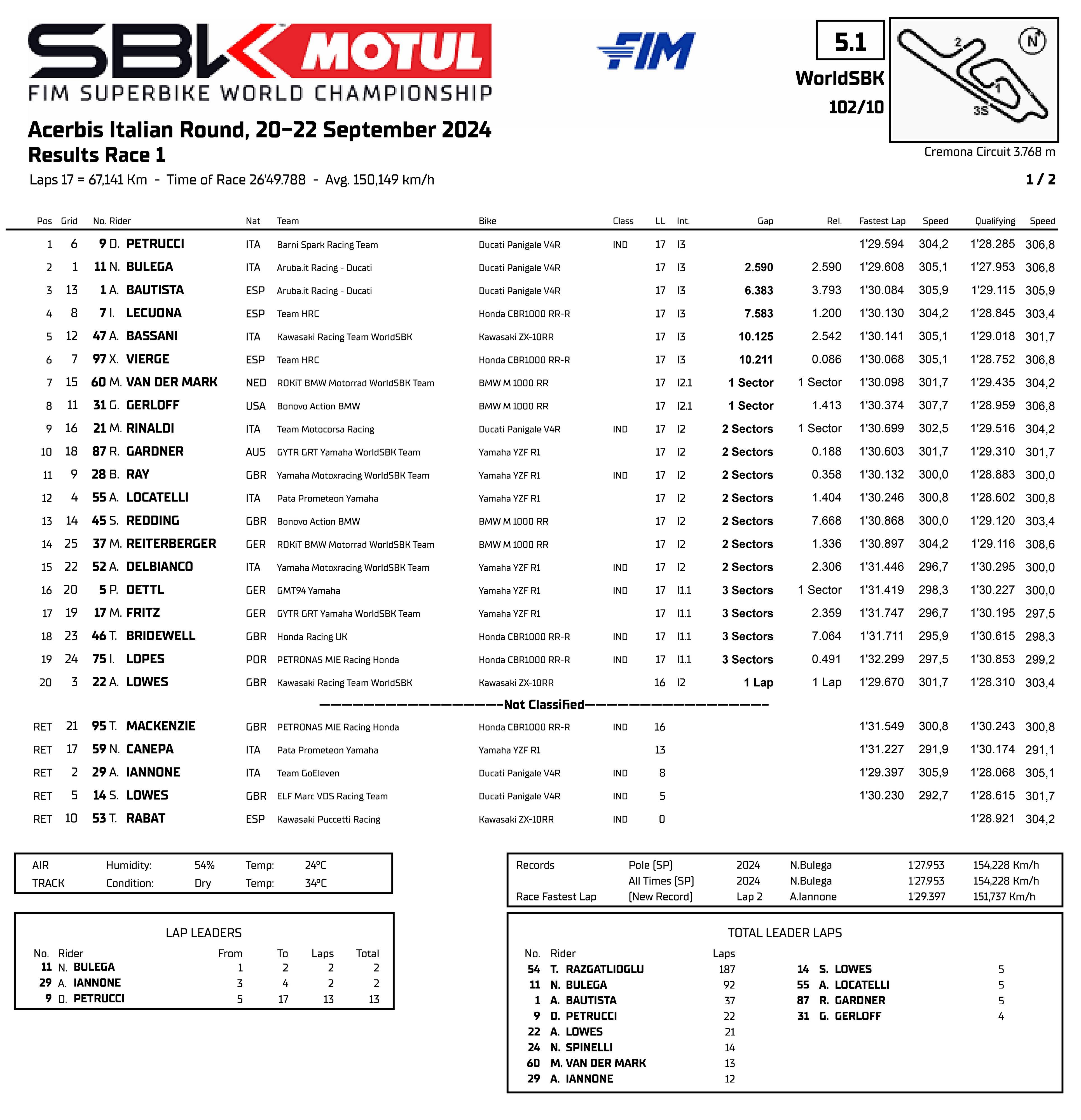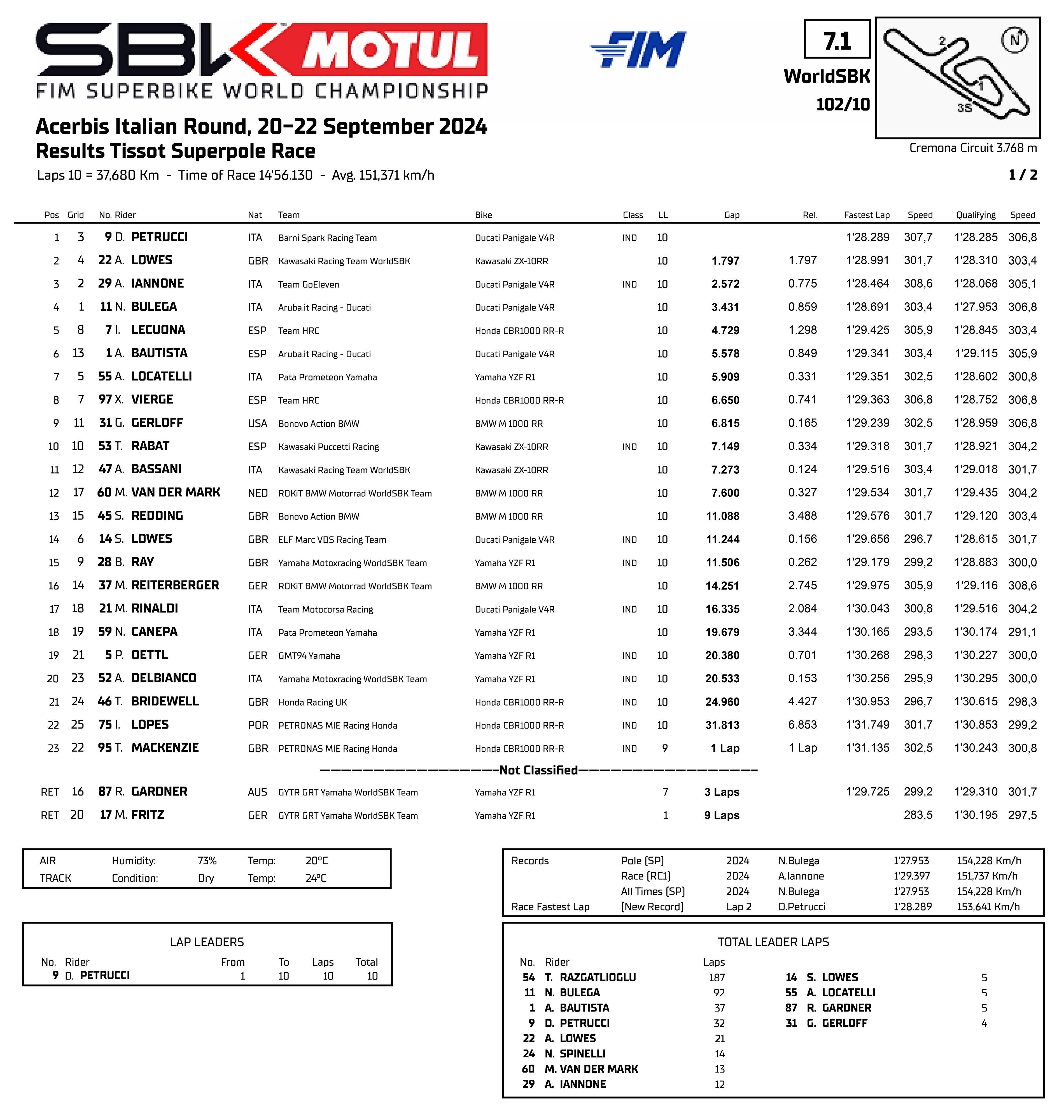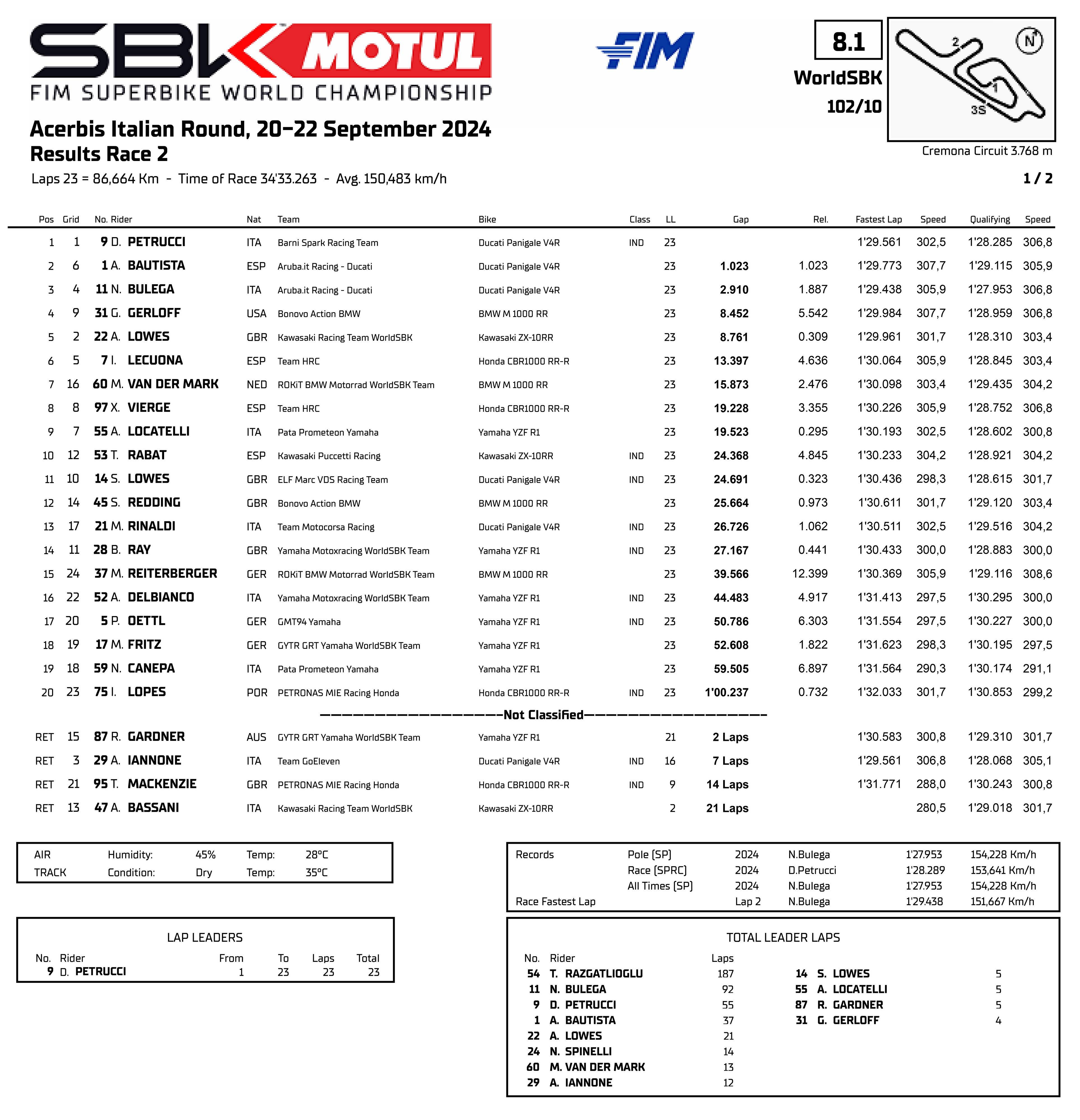 由于此前第八站(法國)的競賽環(huán)節(jié)里摔車受傷,兩位著名車手,積分榜的領(lǐng)先者、土耳其車手拉格里奧盧(Toprak Razgatlioglu)和英國車手雷亞(Jonathan Rea),都因傷缺席了這場首次在克雷莫納進行的比賽。