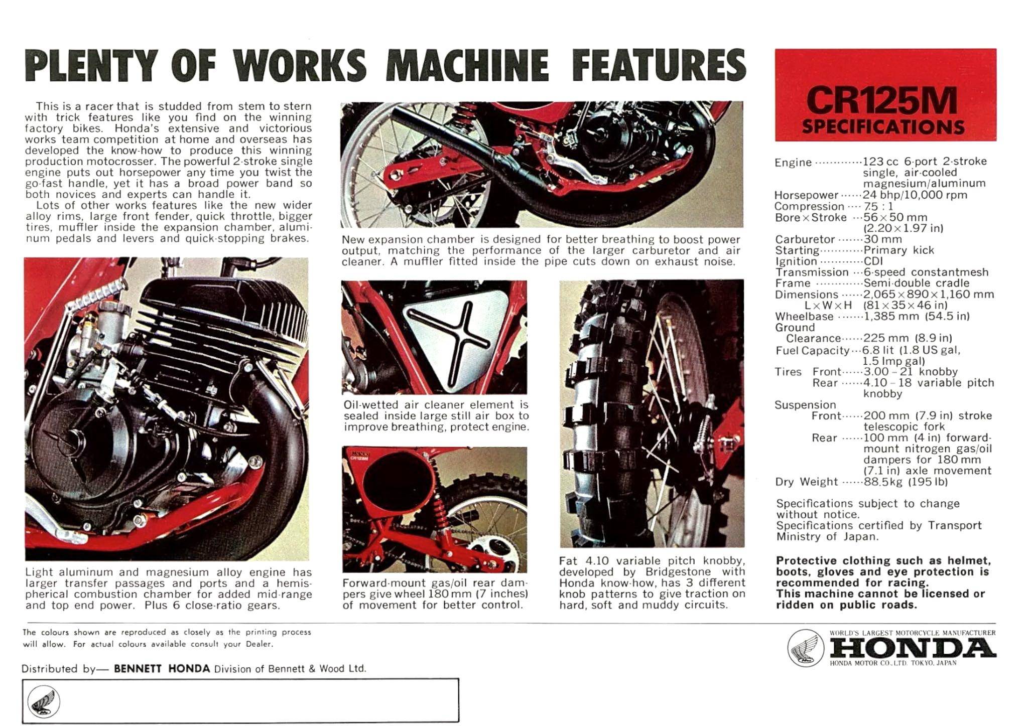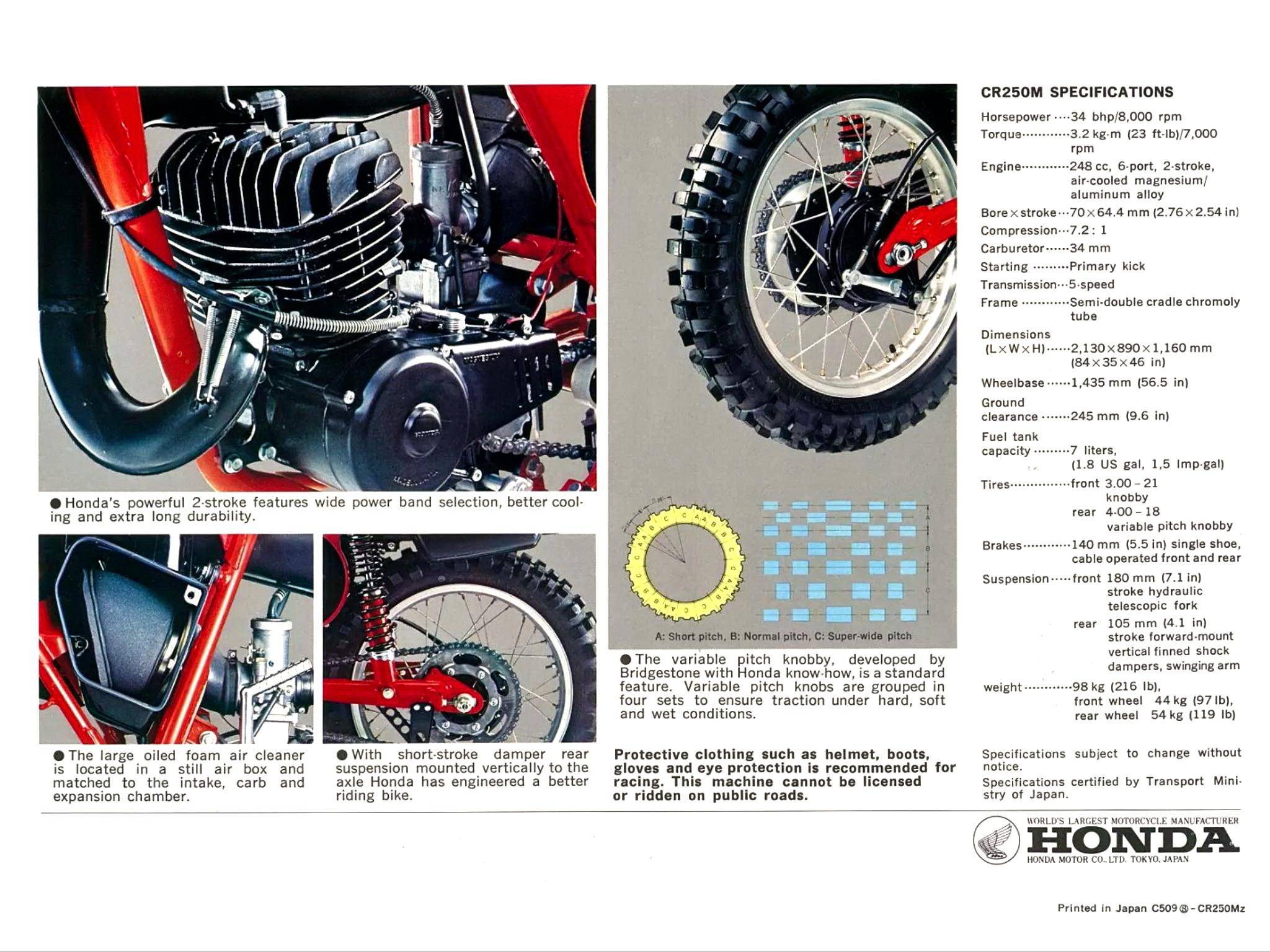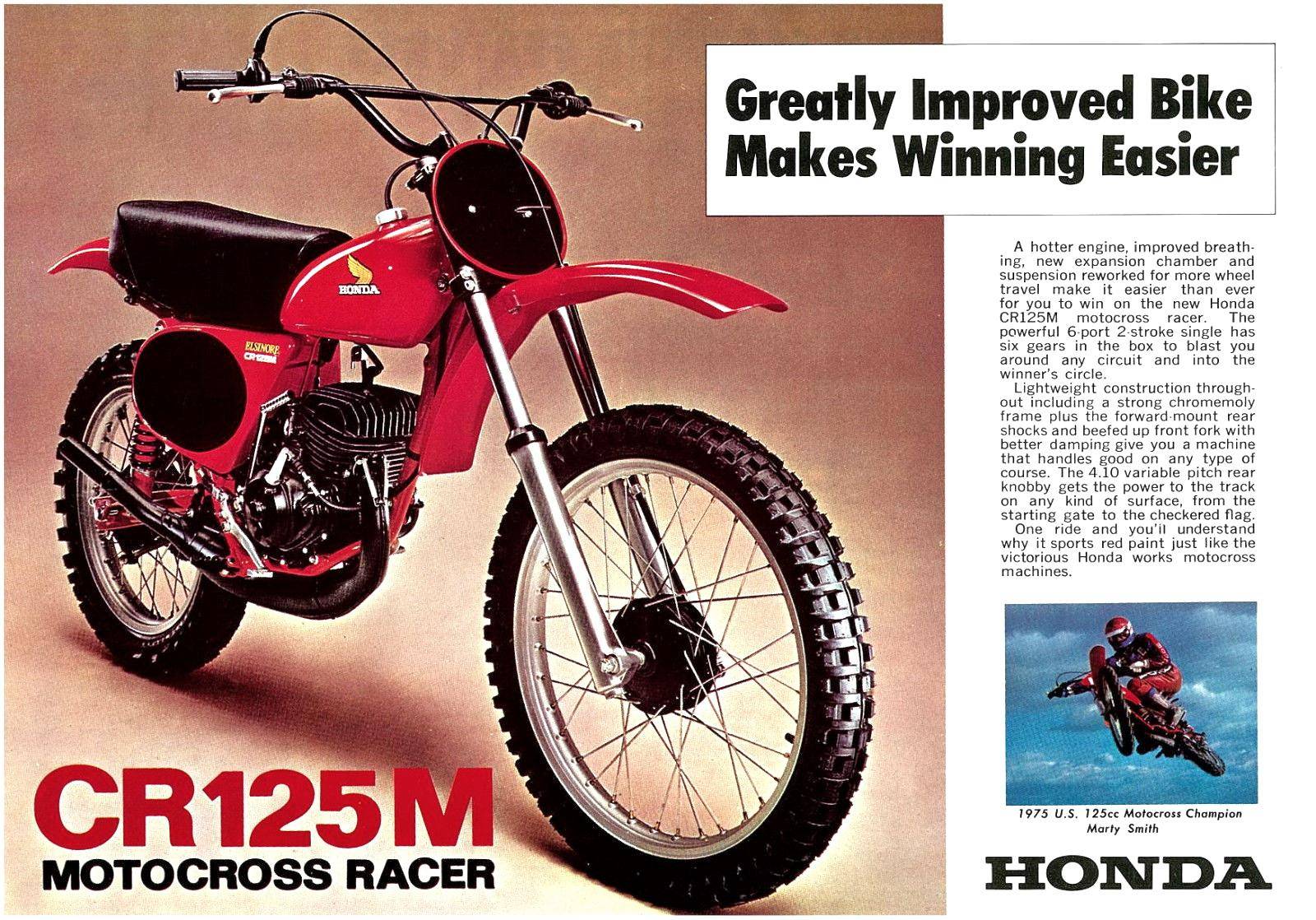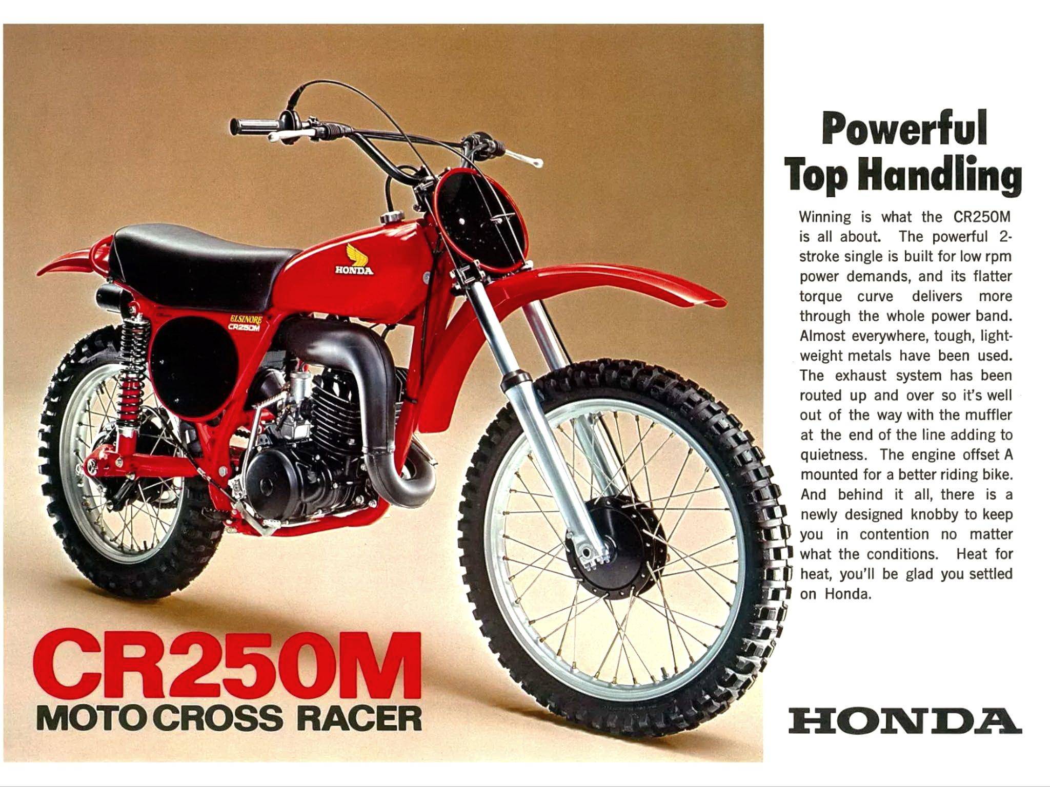 早在 1973 年的時(shí)候,Honda 就向美國市場(chǎng)發(fā)布了第一款名為 Elsinore 的市售越野賽車,該車搭載一副風(fēng)冷兩沖程單氣缸、排氣量 248 cc 的發(fā)動(dòng)機(jī),廠方隨后以該車參加本土的 AMA 越野比賽。在美國以外的歐洲、澳大利亞等地市場(chǎng),對(duì)應(yīng)美版 Elsinore 的車型名為 CR250M;到 1974 年,Elsinore 除了 250 版本之外、還新增了 125 版本(CR125M)。