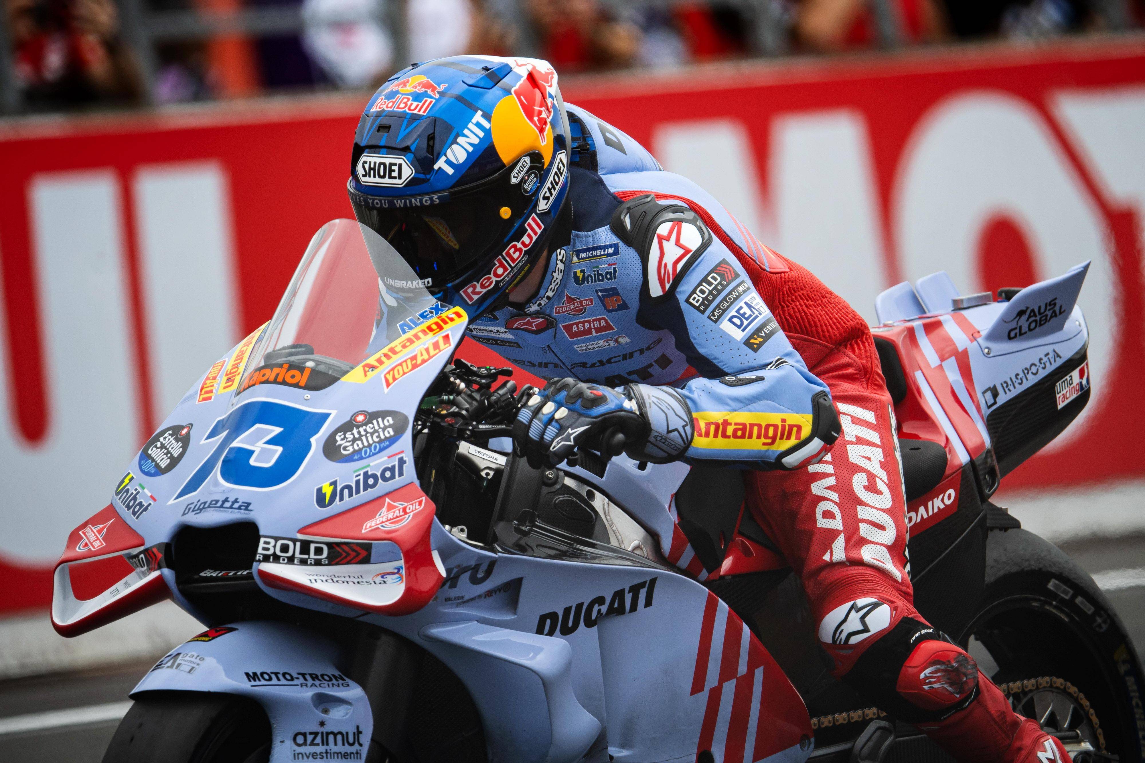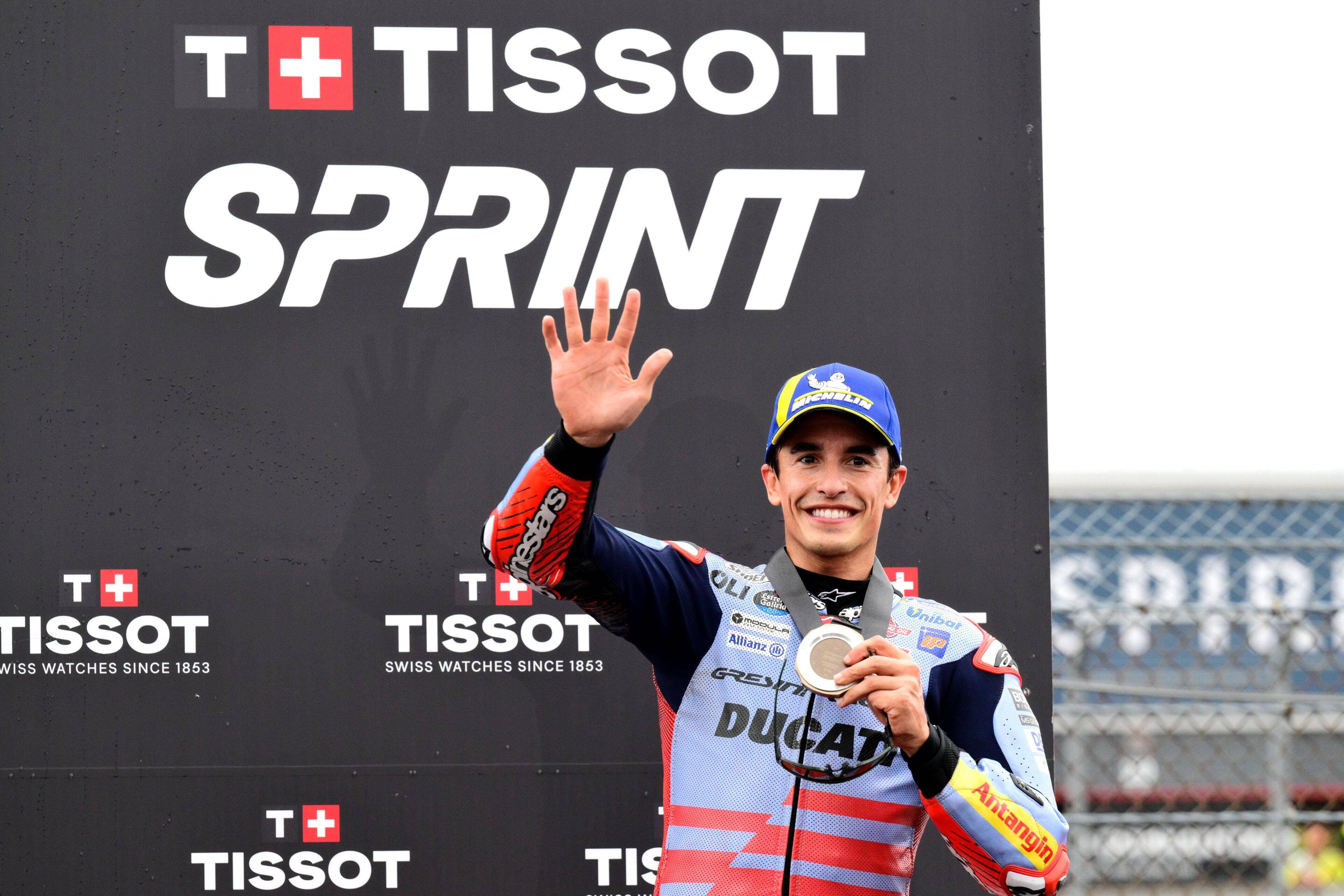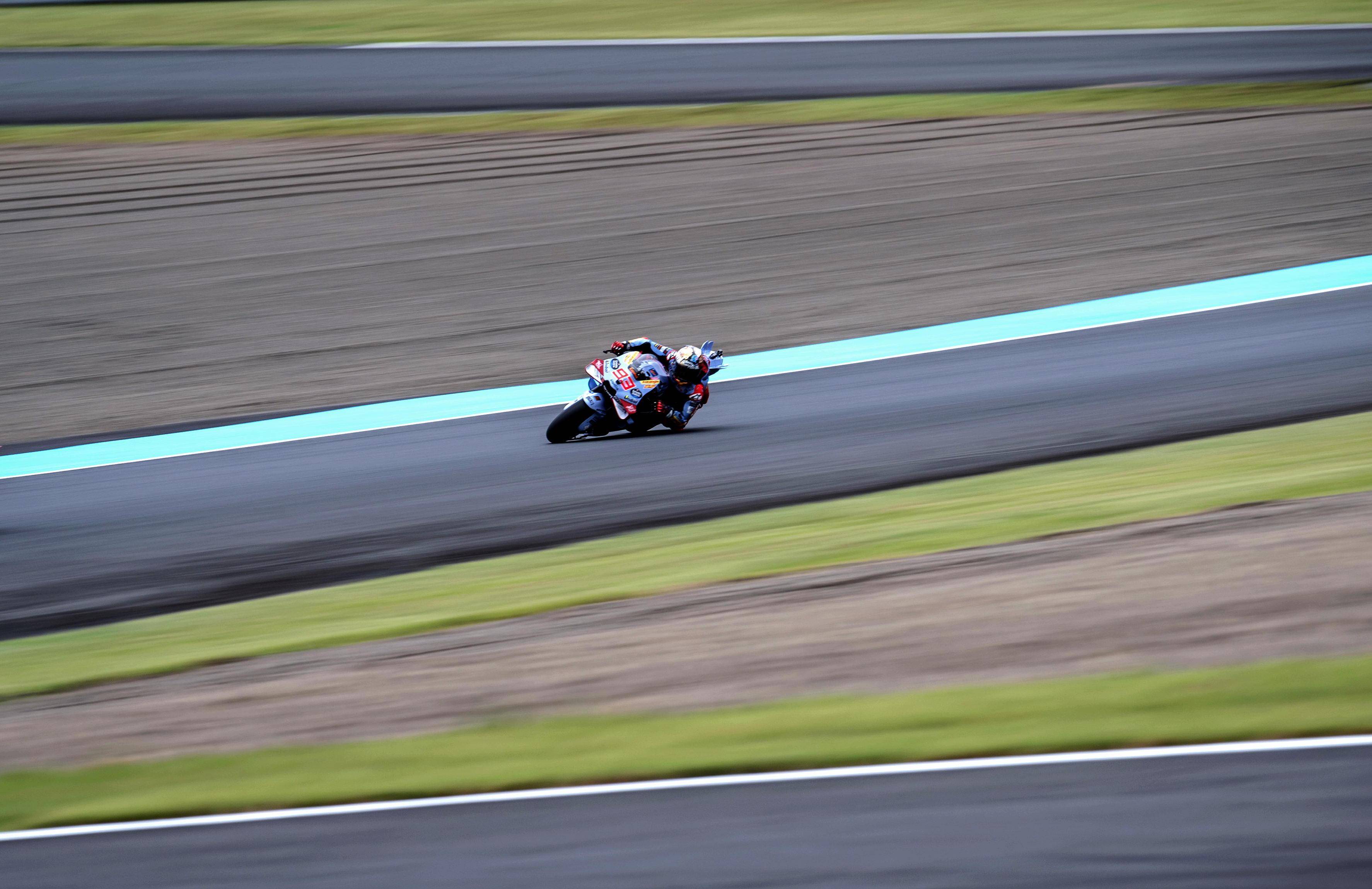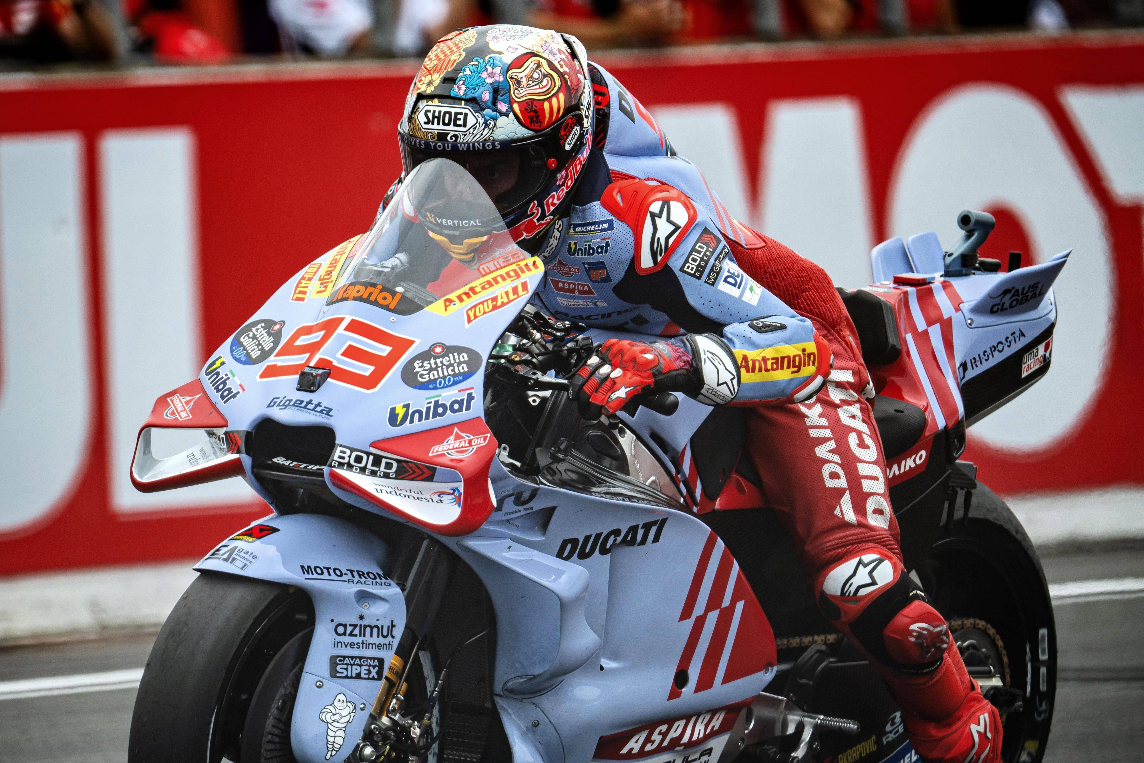 MotoGP 級別在周末(十月 5 日)的競賽環(huán)節(jié)是排位賽和 Sprint 沖刺賽。在 Q2 第二輪出場的第 2 圈,馬昆斯跑出了破紀(jì)錄的 1 分 42.868 秒圈速(2023 年的舊紀(jì)錄為 1 分 43.198 秒)、成為了迄今為止唯一一位能夠在這里跑進 1 分 42 秒的車手,但由于在其中一個彎道、出彎時壓到了綠色限制區(qū)域,這一成績被取消。最終,馬昆斯以 Q2 第一輪出場時的 1 分 44.136 秒的最佳圈速、拿到了發(fā)車位置的第九;小馬昆斯跑出了 1 分 44.263 秒的最快圈速,緊隨哥哥、排在發(fā)車位置的第十位。