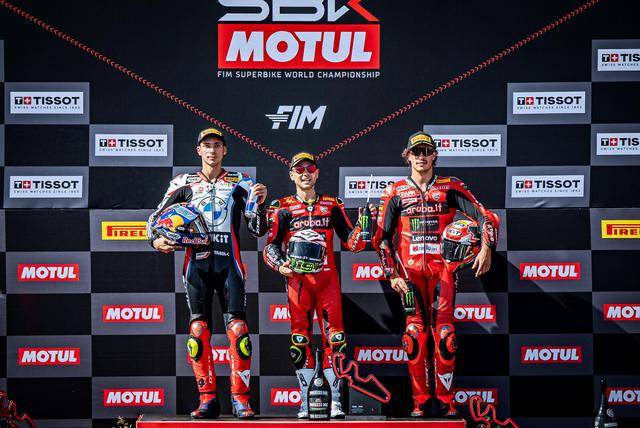 賽程為 10 圈的 Super Pole Race 超級(jí)排位賽正賽,冠軍的爭(zhēng)奪是一場(chǎng)旗鼓相當(dāng)?shù)娜獠珣?zhàn)。捌弟最終拿下了第一,拉格里奧盧落后前車僅 0.088 秒拿下第二,布雷加與冠軍相差 0.172 秒、與前車僅差 0.084 秒獲得了第三。三臺(tái)賽車并排著、幾乎是同時(shí)沖線。
