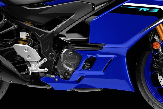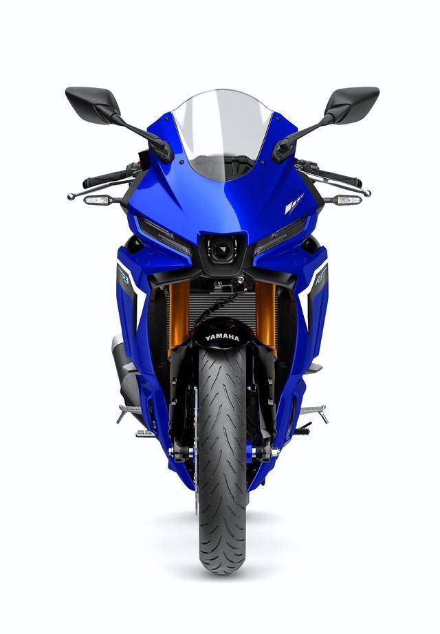 1、新設計的外觀造型。廠方稱,新的 2025 YZF-R3 采用了具有空氣動力學效能的外觀設計,該設計從他們的 MotoGP 工廠賽車 YZR-M1 中獲得靈感開發(fā)而成,車頭前端的進氣風道下、集成了小型定風翼,該定風翼在風格上、有著 YZR-M1 工廠賽車前定風翼衍生而成的輪廓,定風翼與新設計的車身相結合,讓迎面的氣流沿著新車的外部流動時、提供了最大的空氣動力學效率;此外,分層式設計的前兩側整流罩,既降低了前進方向的空氣阻力,也提高了冷卻/發(fā)動機散熱效率;
