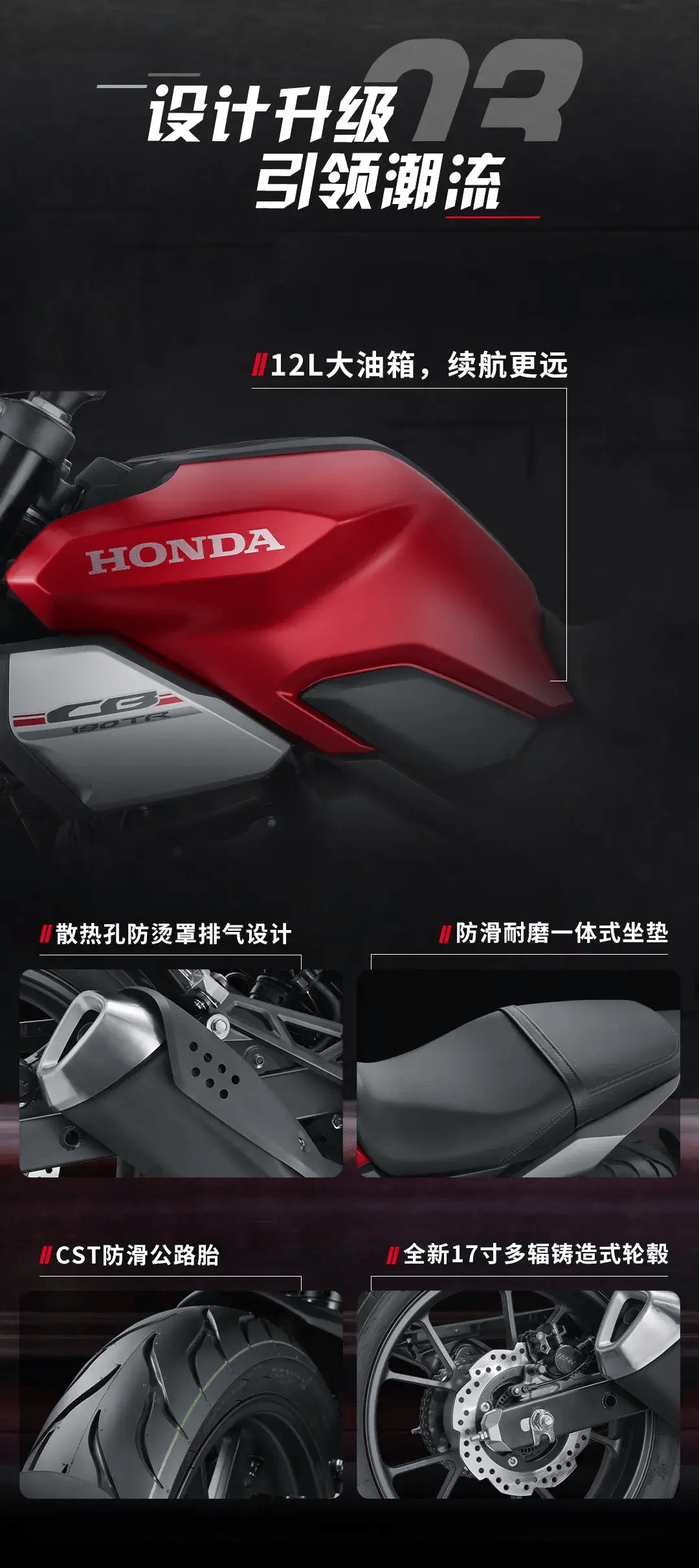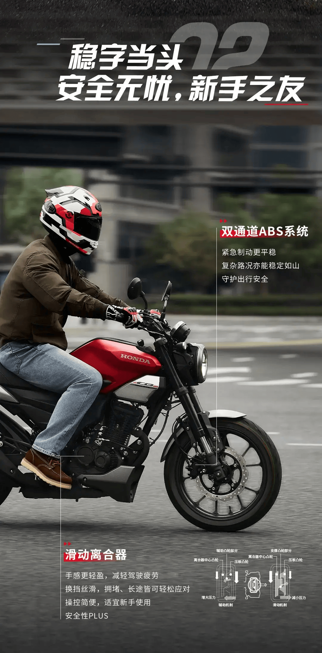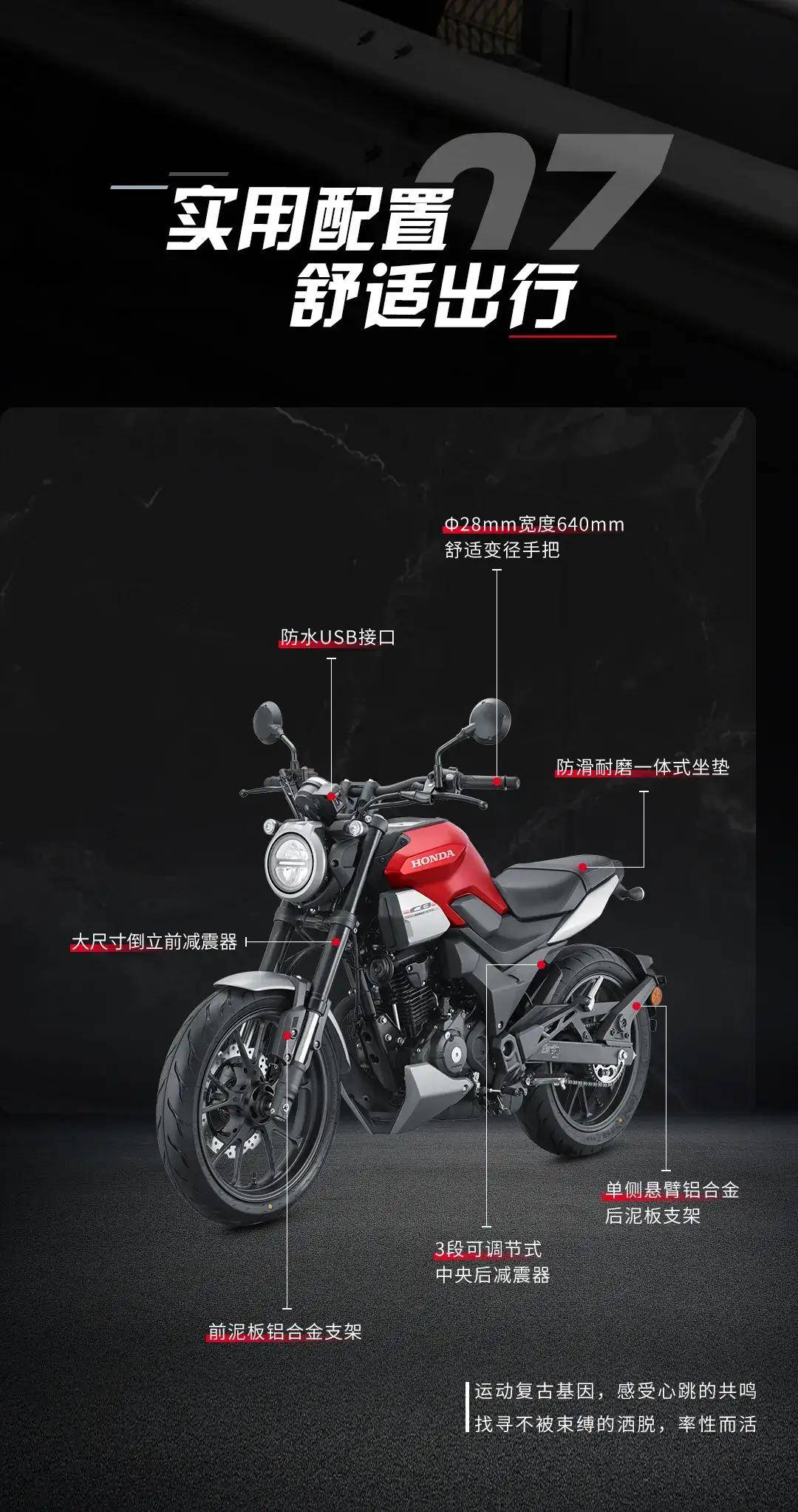 在配置方面,新款CB190TR標配了雙通道ABS系統(tǒng),大大提升了行駛安全性。同時,液晶顯示屏、USB充電接口等實用配置也一應俱全,滿足了日常騎行的需求。此外,新款CB190TR還采用了防滑耐磨一體式坐墊、 鋁合金后泥瓦支架、加寬舒適型變徑車把等貼心設計。