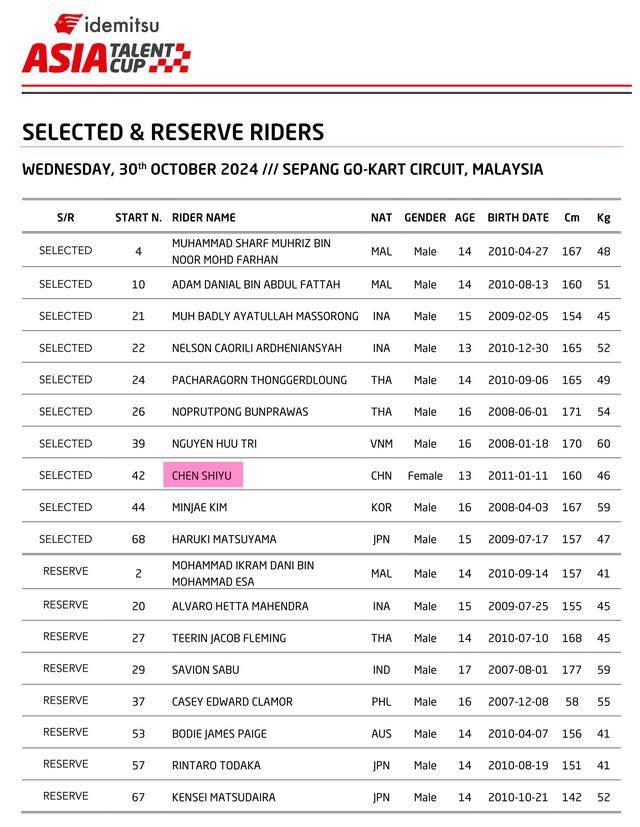 SUPER-26 賽車隊(duì)的兩位小車手、現(xiàn)年十四歲的龍俊豪和現(xiàn)年十三歲的陳詩瑜,參加了這次亞洲天才杯的 2025 賽季選拔賽,來自亞太地區(qū)多個(gè)國家的近 100 位車手,參與了這次的角逐。經(jīng)過了多輪的較量,并經(jīng)過了包括著名的前 GP 車手普基(Alberto Puig,現(xiàn)任 Honda - Repsol 工廠車隊(duì)經(jīng)理)和青山博一(Hiroshi Aoyama)等多位評判團(tuán)成員的指導(dǎo)和建議之后,陳詩瑜最終獲選成為 2025 賽季亞洲天才杯的正式車手 —— 陳詩瑜成為了第一位成功入選亞洲天才杯的中國女車手,她同時(shí)也是亞洲天才杯歷史上的第二位女性正式車手(第一位是泰國著名的女車手 Muklada Sarapuech/2014 年)。
