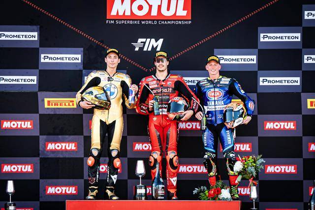 最終,布雷加順利奪得了第一節(jié)比賽的冠軍,拉格里奧盧保持著全場(chǎng)第二的位置沖線、拿到了他在 WSBK 級(jí)別里的第二個(gè)世界冠軍,同時(shí)也為 BMW Motorrad 寶馬摩托奪得了歷史上的首個(gè)世界冠軍頭銜;55 號(hào)車的洛卡泰利(Andrea Locatelli)拿到了第三名。