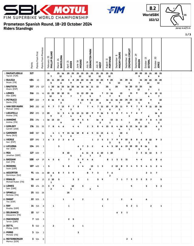 綜合整個(gè) 2024 賽季十二個(gè)分站的總共二十四節(jié)比賽,拉格里奧盧以 527 分奪得了冠軍,布雷加以 484 分獲得了總亞軍,捌弟(Alvaro Bautista,巴迪斯塔)以 357 分拿到了年度的總季軍。