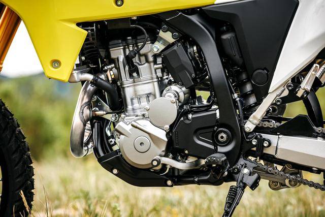 2025 DR-Z4S 越野車搭載一副經(jīng)過大幅升級的水冷四沖程單氣缸、DOHC四氣閥的發(fā)動機,缸徑、行程仍為 90 mm x 62.6 mm(與 2000 年的 DR-Z400S/DR-Z400E,以及美國市場現(xiàn)行銷售中的 2024 DR-Z400S、DR-Z400SM 相同),排氣量 398 cc,壓縮比 11.1:1(現(xiàn)行的 2024 DR-Z400S 為 11.3:1),配備了電子燃油噴注系統(tǒng)、五檔的變速齒輪箱,最大動力輸出 38 匹(現(xiàn)行的 2024 DR-Z400S 為 40 匹)。