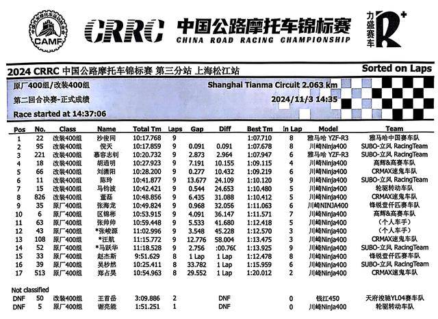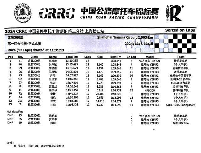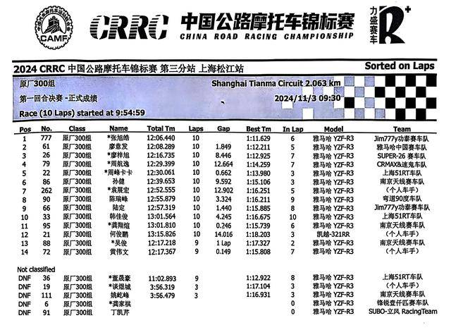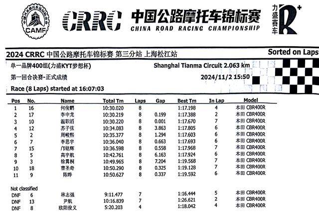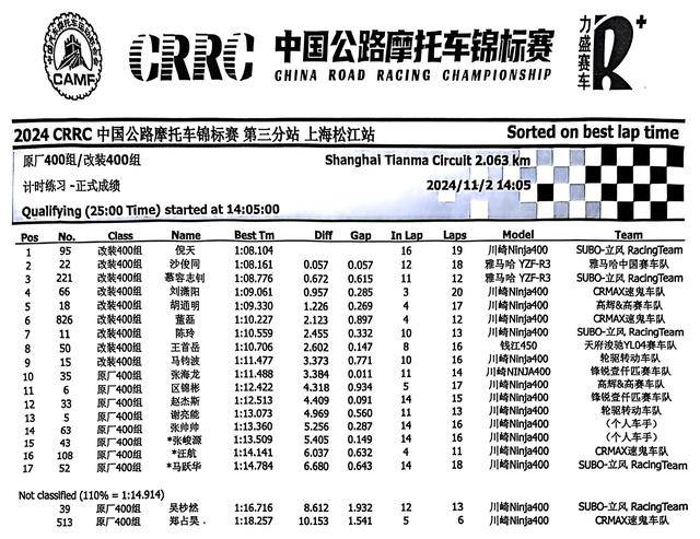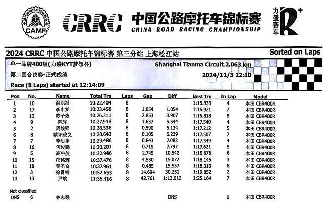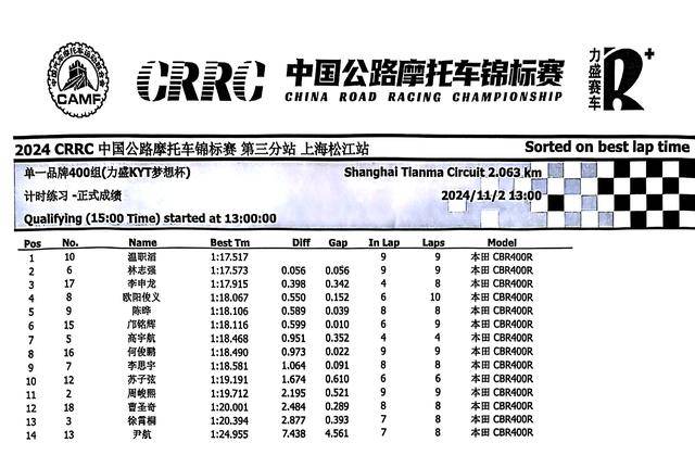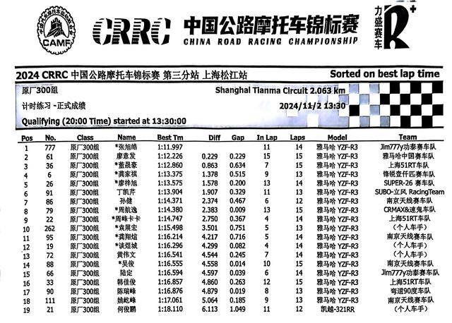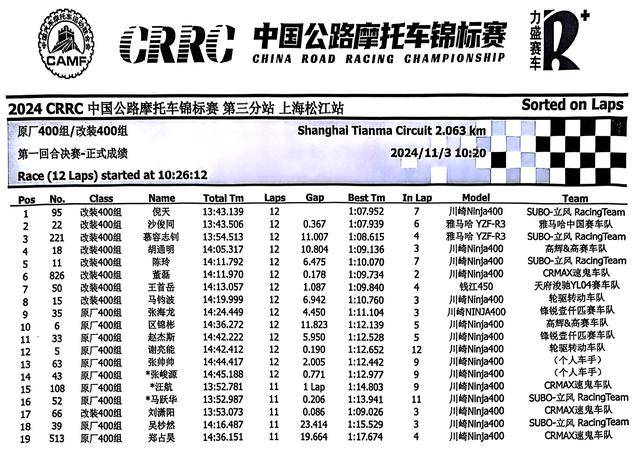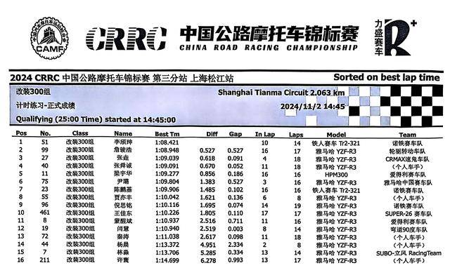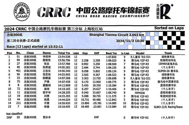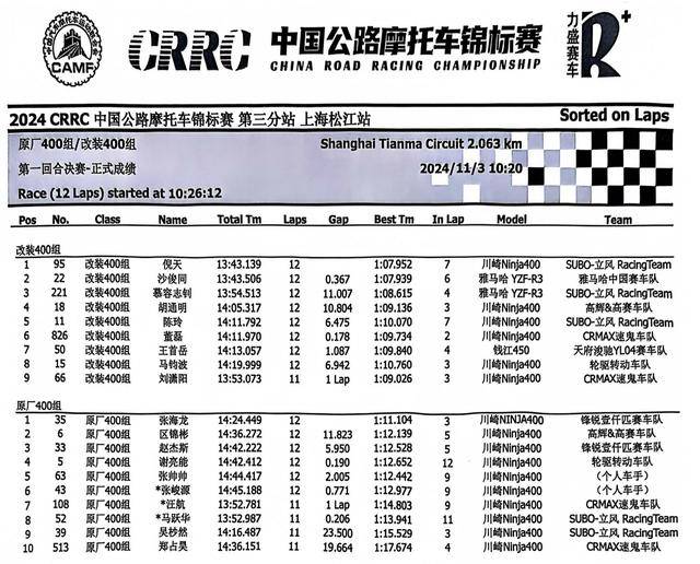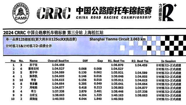 下面的圖片,2024 年度 CRRC 中國公路摩托車錦標賽第三站、上海松江站,各競賽組別在各個競賽環(huán)節(jié)的成績: