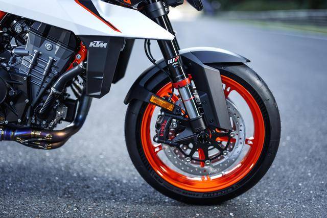 3、換裝了新型的 WP APEX 懸掛系統(tǒng):前面是叉芯口徑為 48 mm(990 Duke 的叉芯口徑為 43 mm)、行程為 143 mm 的倒立式前叉;后面是行程為 140 mm(990 Duke 的行程為 150 mm)的全可調(diào)后減震;
