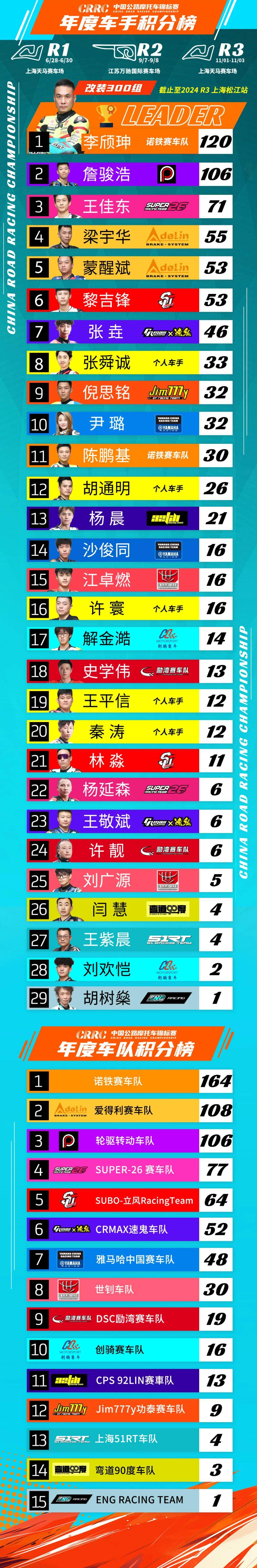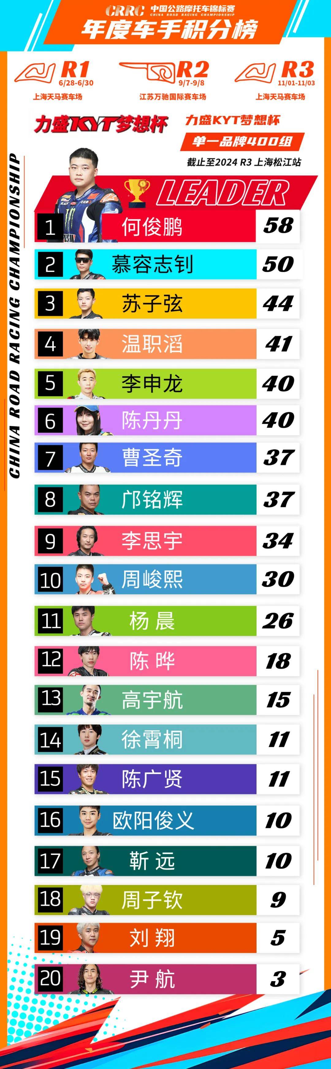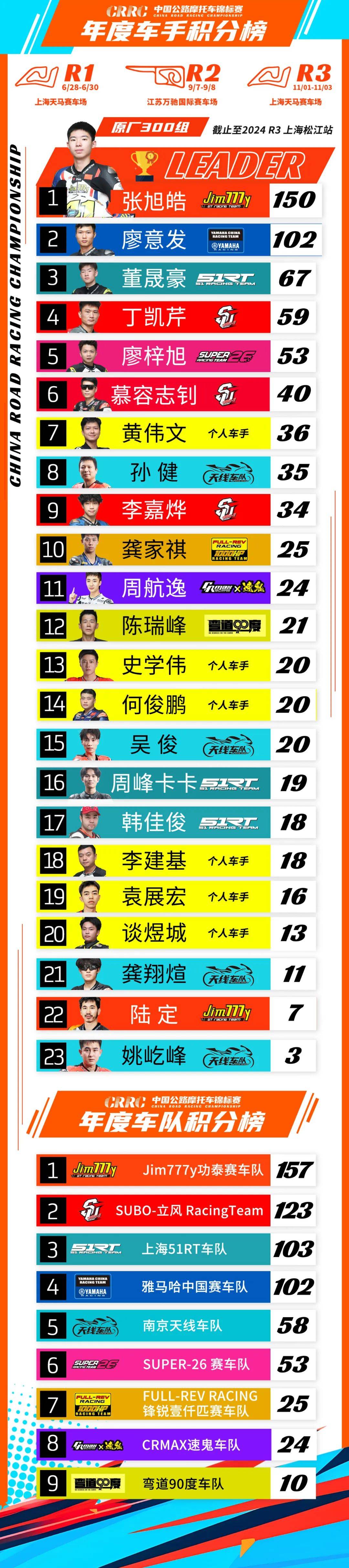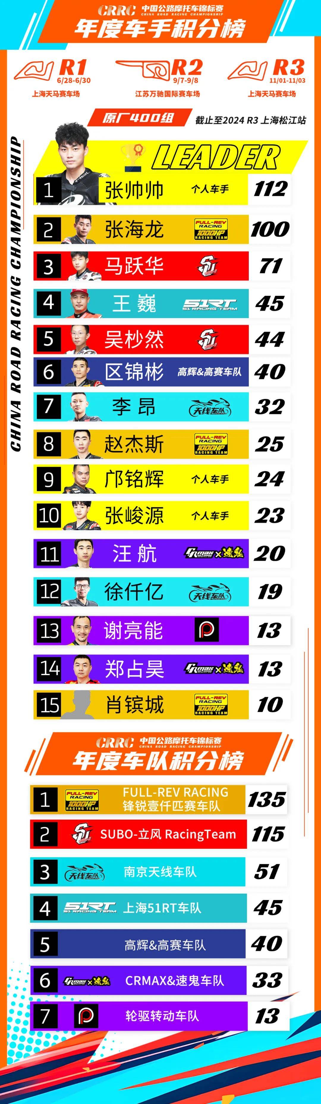 11月3日,2024 CRRC中國公路摩托車錦標賽年度收官之戰(zhàn)在上海天馬賽車場圓滿落幕,經(jīng)過一年兩地、三個分站的速度對決,年度車手、車隊積分榜重磅出爐!