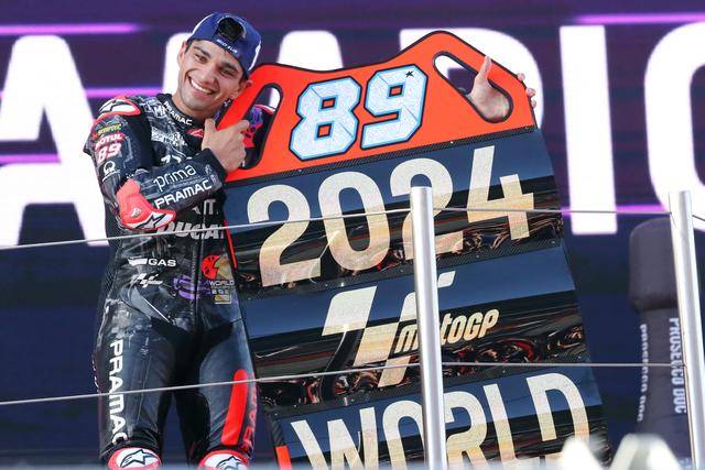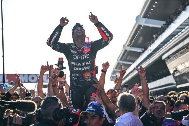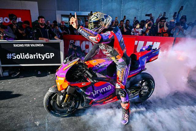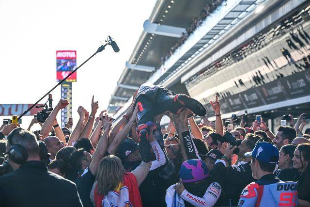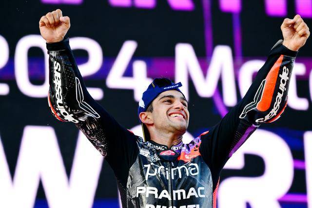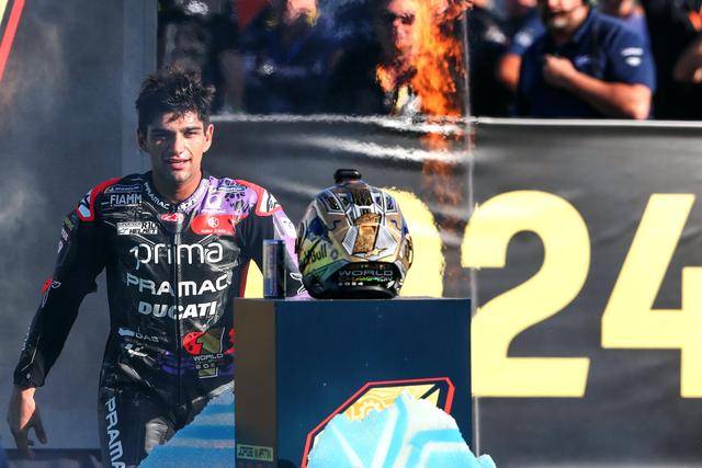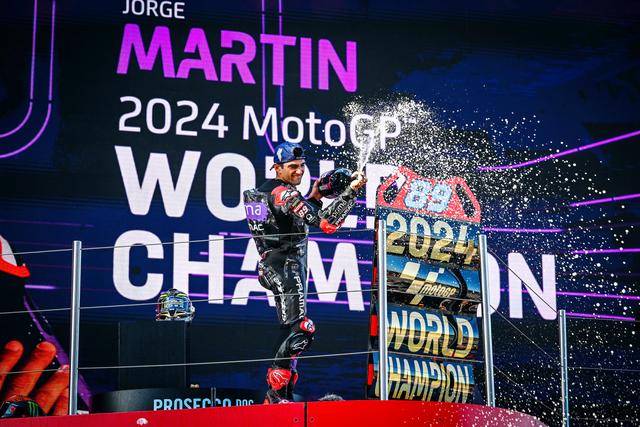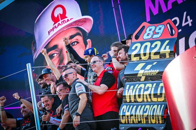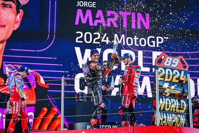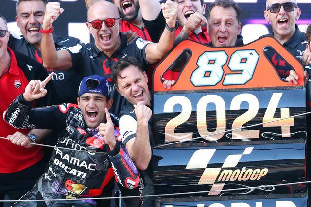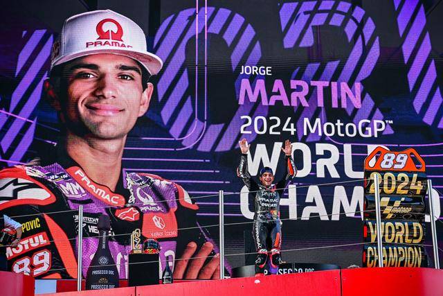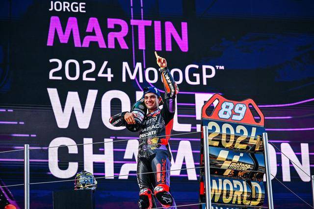 周末(十一月 16 日)舉行的沖刺賽,巴納亞奪得了冠軍(12 分)、馬丁獲得了第三(7 分),兩人的積分差距輕微地縮小至 19 分,這意味著馬丁在最后的正賽里,拿到第九名或更好的成績就可以奪冠。在 24 圈的正式比賽里,馬丁一直守在第三的位置上,沒有冒險(xiǎn)挑戰(zhàn)前車。他最終順利以季軍完賽,并拿下了 MotoGP 級(jí)別 2024 年度的世界冠軍(年度積分總冠軍)。綜合整個(gè)賽季,馬丁總共拿下三次分站冠軍、累計(jì)十六次登上正賽的頒獎(jiǎng)臺(tái)。