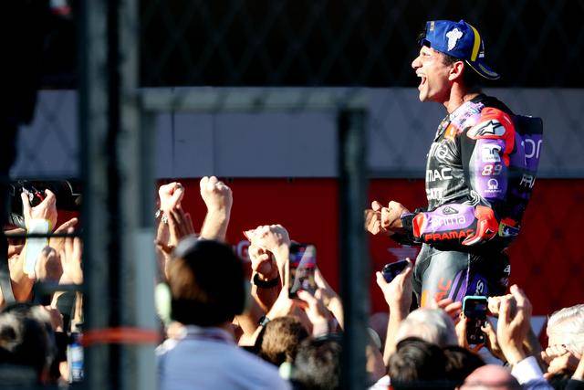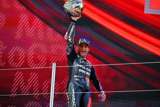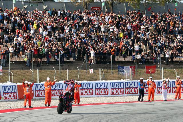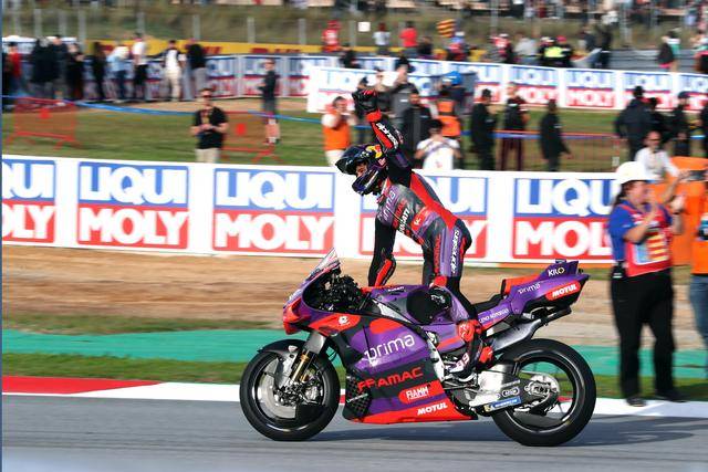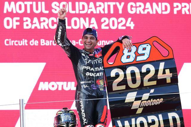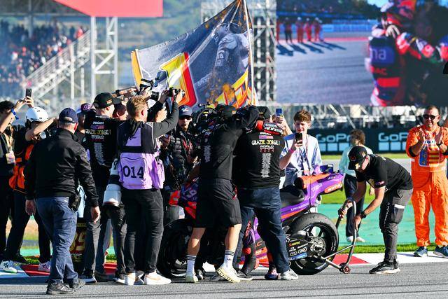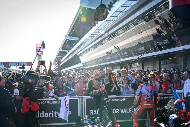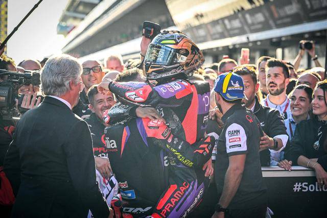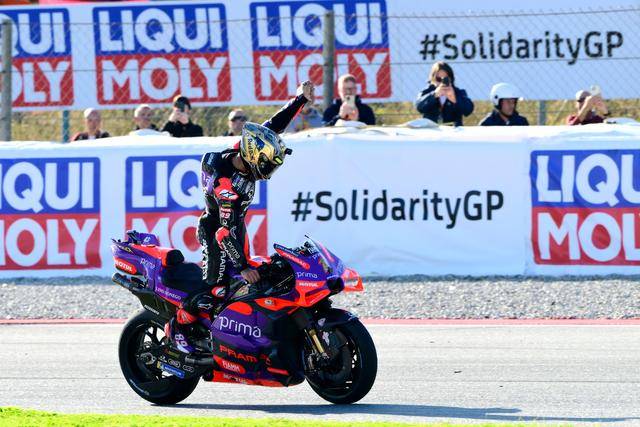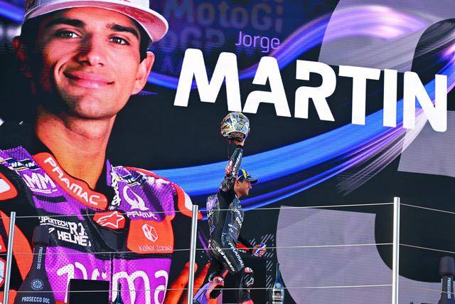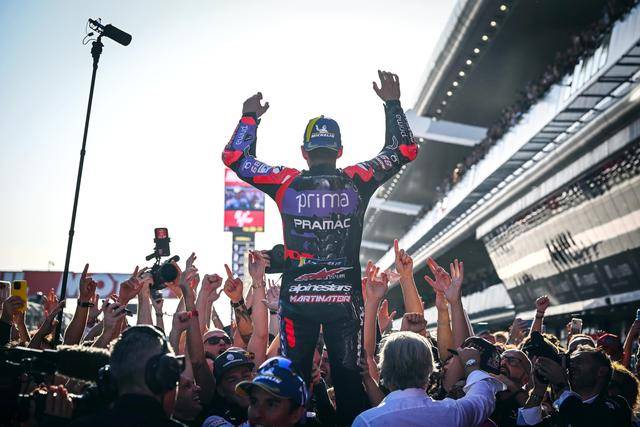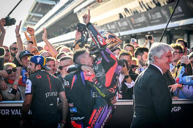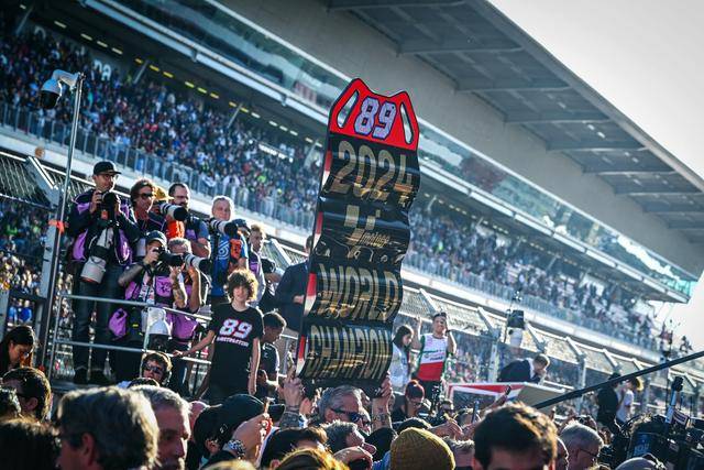 周末(十一月 16 日)舉行的沖刺賽,巴納亞奪得了冠軍(12 分)、馬丁獲得了第三(7 分),兩人的積分差距輕微地縮小至 19 分,這意味著馬丁在最后的正賽里,拿到第九名或更好的成績就可以奪冠。在 24 圈的正式比賽里,馬丁一直守在第三的位置上,沒有冒險(xiǎn)挑戰(zhàn)前車。他最終順利以季軍完賽,并拿下了 MotoGP 級(jí)別 2024 年度的世界冠軍(年度積分總冠軍)。綜合整個(gè)賽季,馬丁總共拿下三次分站冠軍、累計(jì)十六次登上正賽的頒獎(jiǎng)臺(tái)。