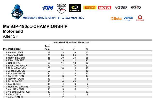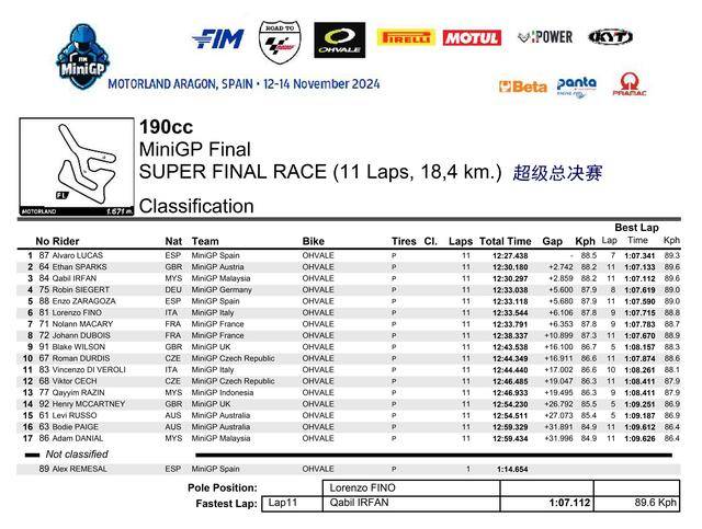 憑借著在超級總決賽奪冠的雙倍積分,以及兩節(jié)正式比賽里、相對穩(wěn)定的表現(xiàn)(第四和第三名),駕駛 87 號車、來自西班牙的應(yīng)屆冠軍盧卡斯(Alvaro Lucas),以 79 分奪得了 FIM MiniGP 2024 全球總決賽 190 組的冠軍,這是他連續(xù)第二年獲得這項(xiàng)大賽的冠軍;81 號車的意大利車手菲諾(Lorenzo Fino)以 70 分拿到了亞軍,75 號車、來自德國的斯格特(Robin Siegert)以 66 分獲得了季軍。