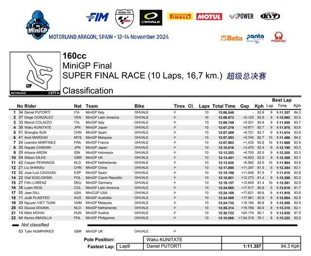 盡管在雙倍計(jì)算積分的超級總決賽中、只拿到了第三名,但在兩節(jié)正式比賽里都奪得了冠軍、駕駛 36 號車的日本車手國立和玖(Waku Kunitate),最終以 76 分、奪得了 FIM MiniGP 2024 全球總決賽 160 組的冠軍,成為第一位在這項(xiàng)賽事中奪冠的日本車手;駕駛 34 號車的意大利車手普托蒂(Daniel Putorti)奪得了超級總決賽的勝利,最終以 70 分獲得了亞軍;37 號車、來自委內(nèi)瑞拉的岡薩雷斯(Diego Gonzalez)以 64 分獲得了季軍。