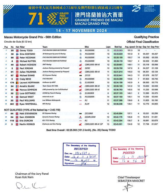 2024 澳門格蘭披治摩托車賽,英國車手奪冠