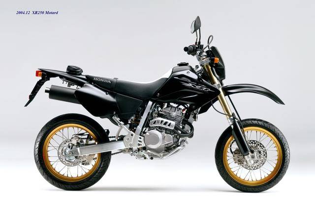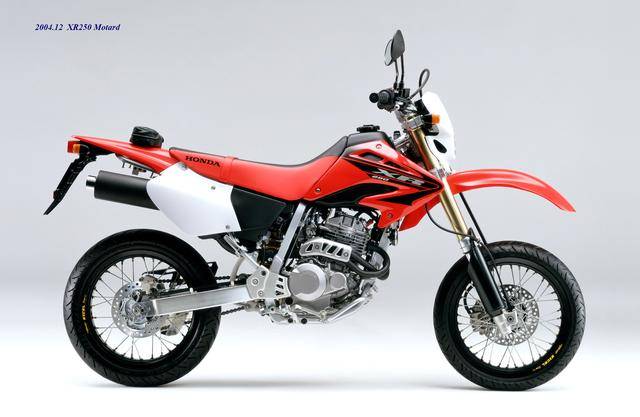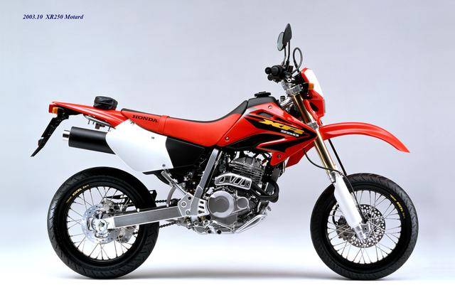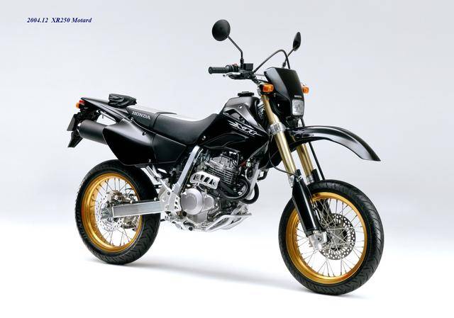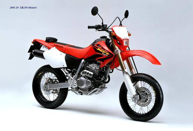 XR Baja 的退場(chǎng),取而代之的是 2003 年四月首次公開的 XR250 Motard(工廠編號(hào) MD30,與越野規(guī)格的 XR250 相同)。顧名思義,XR250 Motard 屬于公路越野(也稱之為滑胎)車型,動(dòng)力單元、車體配置與 2003 XR250 大致相同,沿用了編號(hào)為 MD17E、最大馬力輸出為 28 匹的 RFVC 發(fā)動(dòng)機(jī),鋼制的車架,叉芯口徑為 43 mm 的倒立式前叉。與越野規(guī)格的 XR250 相比,新的 XR250 Motard 換裝了直徑為 17 英寸的前后車輪、公路型的輪胎,鞍座高度降低至 855 mm(越野規(guī)格的 XR250 為 875 mm),更短的二次減速比(齒數(shù)更小的后傳動(dòng)齒輪)。