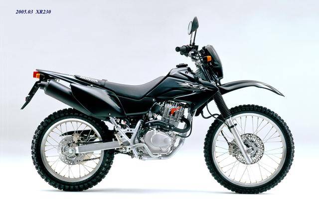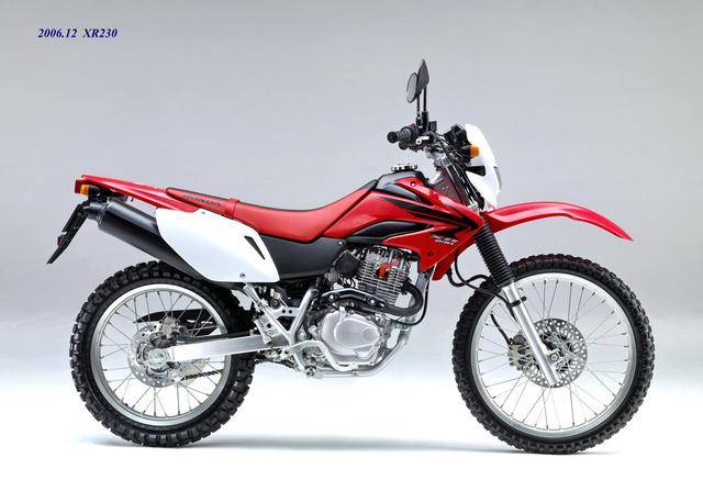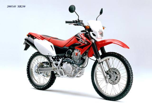 在 XR250 仍在銷售的時(shí)候,Honda 在 2005 年三月就推出了全新的 XR230(工廠編號(hào) MD36)。新的 XR230 稱得上是 XR250 的 “ 廉價(jià)版 ”,該車搭載一副國內(nèi)也非常熟悉的風(fēng)冷四沖程單氣缸、SOHC 兩氣閥的發(fā)動(dòng)機(jī),排氣量 223 cc,最大動(dòng)力輸出 18 匹。車體方面,采用一副鋼管式的車架,正立式的前叉,較低的 805 mm 鞍座高度,前 21、后 18 英寸直徑的車輪。
