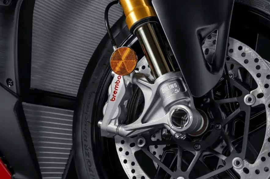 2025款Streetfighter V4標(biāo)配了高性能的減震系統(tǒng)和剎車卡鉗。標(biāo)準(zhǔn)版采用Showa的43mm倒立式前叉和Sachs后減震。V4 S版本搭載了Öhlins的 SmartEC 3.0電子減震,以及NIX30 43mm倒立式前叉和TTX36后減震器。制動方面全系搭載了 BremboMonoblock Hypure 4活塞卡鉗,前輪配備330mm 制動盤,后輪配備245mm制動盤。讓騎乘者在面對各種路況時都能夠享受到非凡的操控精度,進一步提升了車輛在極限狀態(tài)下的穩(wěn)定性與安全性。