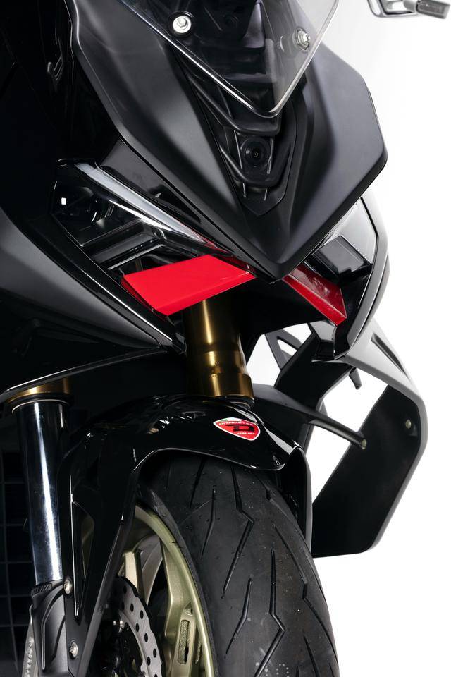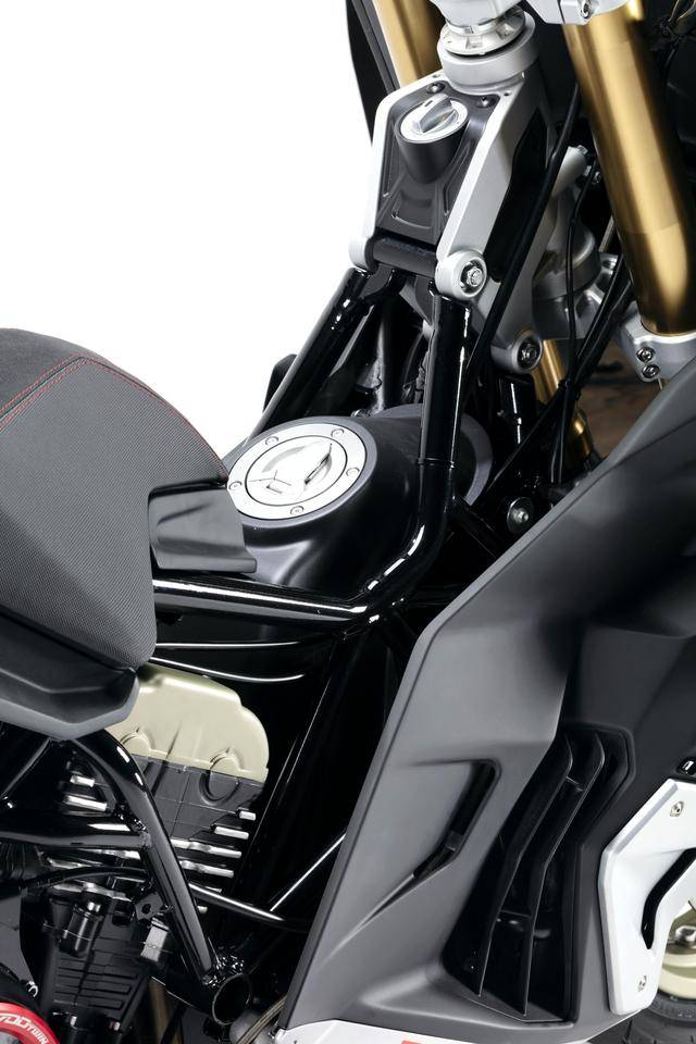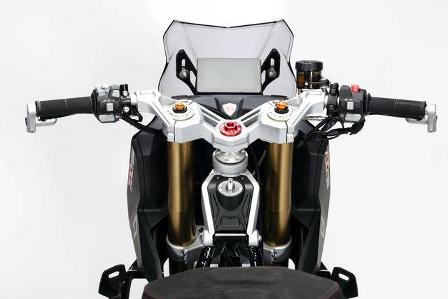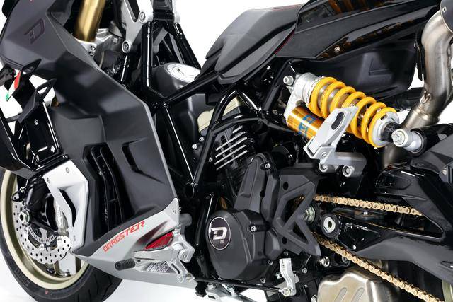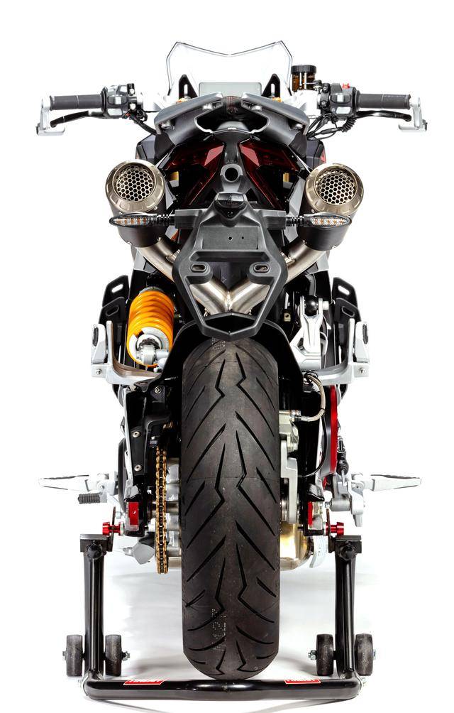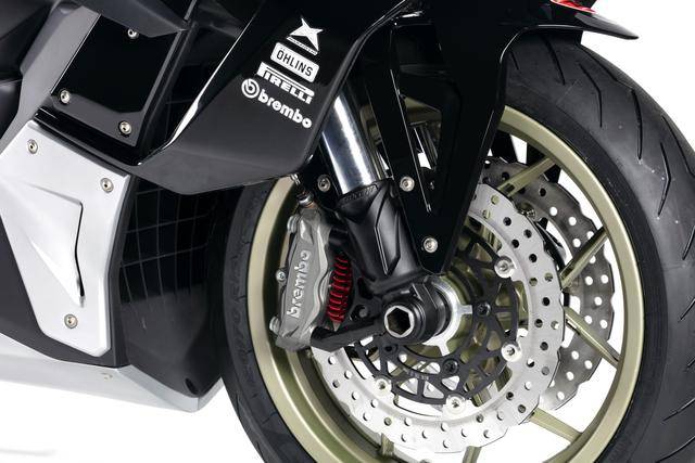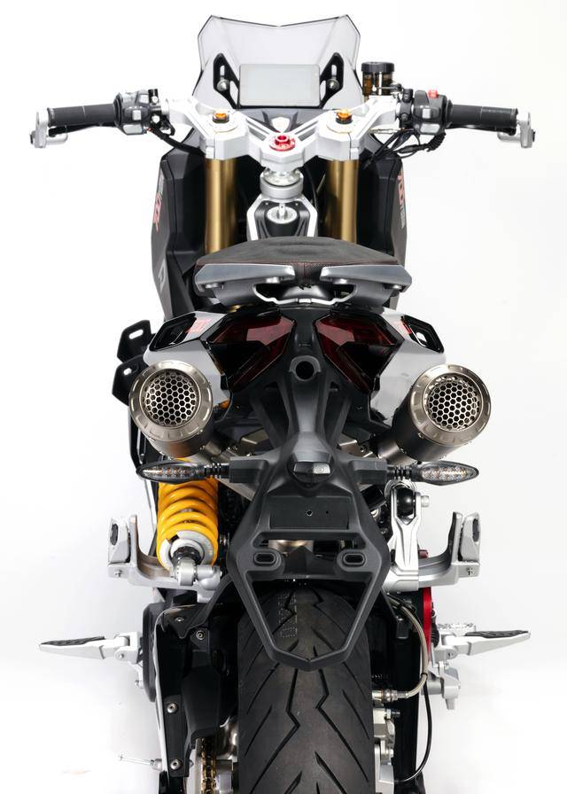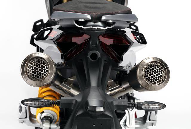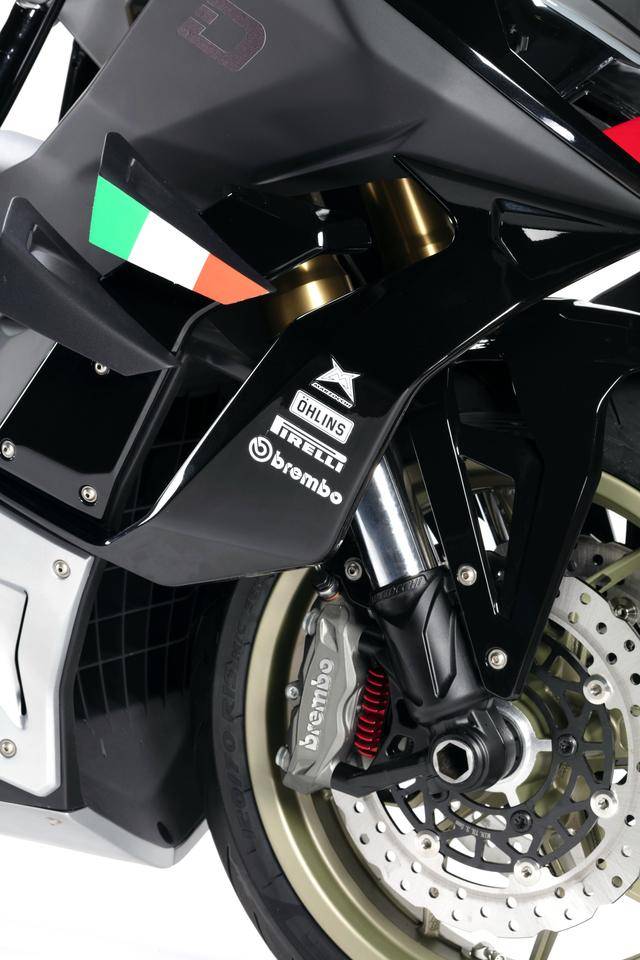 車體方面,采用全外露設(shè)計的鋼管式車架,有著高辨識度的外觀造型、與 MotoGP工廠賽車相比也毫不遜色的空氣動力組件;Marzocchi 配套的倒立式前叉,Ohlins 奧林斯配套的后減震(左側(cè)偏置式安裝的設(shè)計)和轉(zhuǎn)向阻尼器;前 270 mm 雙碟、后 230 mm 單碟的制動系統(tǒng),Brembo布雷博配套的剎車卡鉗、標配了 ABS;直徑為 15 英寸的前后輪框,全 LED 光源的燈光系統(tǒng),數(shù)字式的儀表板等。
