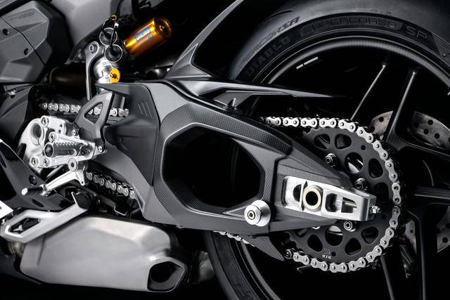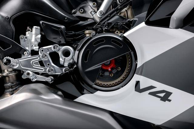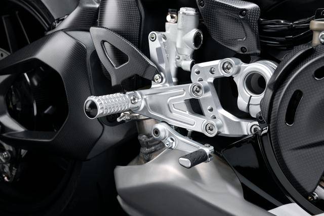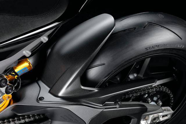 5、標(biāo)配了干式離合器、碳纖維制的開放式離合器外蓋,實心鋁 CNC 加工而成的腳踏,質(zhì)感更好的 Alcantara 賽車鞍座,賽車前風(fēng)擋,賽車油箱蓋,以及碳纖維制的前后輪擋泥板、排氣隔熱護罩、鏈條護罩、腳踏的腳后跟護罩、后搖臂外罩等;