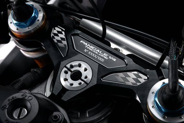 6、與所有收藏級的杜卡迪車型一樣,新的 Panigale V4 Tricolore 三色限量版,在實心鋁加工而成的上三星(上前叉三角臺)、刻有車型名稱和限量版的編號。此外,廠方同時為新車準(zhǔn)備了真品證書和專用的摩托車外罩。