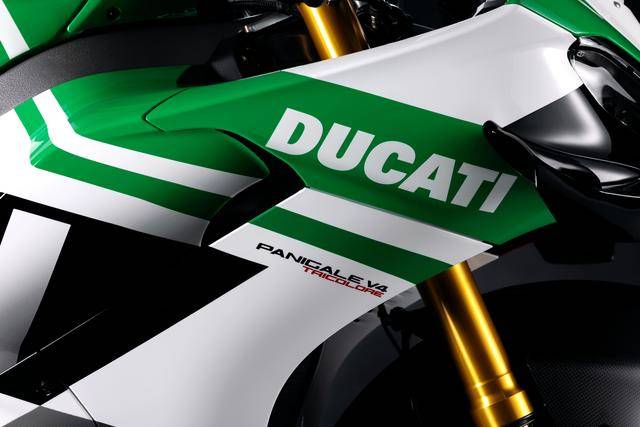 新的 Panigale V4 Tricolore 三色限量版由杜卡迪風(fēng)格中心(Centro Stile Ducati)與設(shè)計工作室德魯?shù)希―rudi Performance)合作設(shè)計而成,限量生產(chǎn) 1000 輛。杜卡迪稱,該車是向 Made in Italy “ 意大利制造 ” 和他們的歷史致敬的、一輛收藏級的車型:新的 Panigale V4 Tricolore 三色限量版,用現(xiàn)代的語言重新詮釋了 1984 年推出的第一款超級跑車 750 F1 的圖案/貼花,這是對杜卡迪過去四十年市售型超級跑車之歷史的最新演繹。
