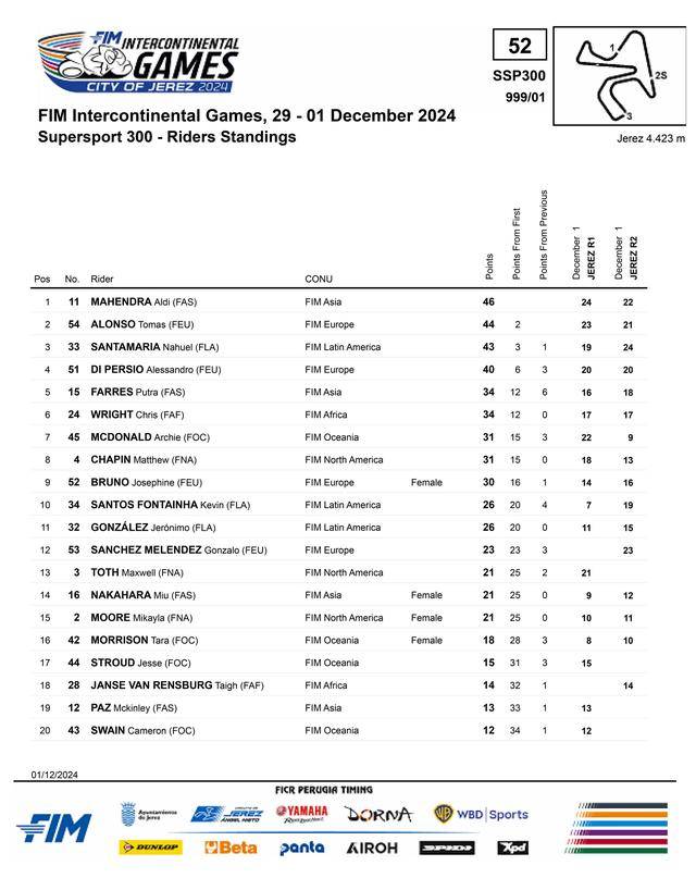 最終,綜合八位車手的成績(jī),有著較高綜合水平的歐洲摩聯(lián)、奪得了首屆 ICG 的總冠軍;亞洲摩聯(lián)奪得了亞軍,其中應(yīng)屆的 WorldSSP300 世界冠軍馬亨德拉(Aldi Mahendra)拿到了 Supersport 300 組總分第一,另外兩位東南亞車手在 Supersport 組也分別獲得了總分第四、第五,助力亞摩聯(lián)拿下了佳績(jī)。而季軍則由大洋洲摩聯(lián)獲得。